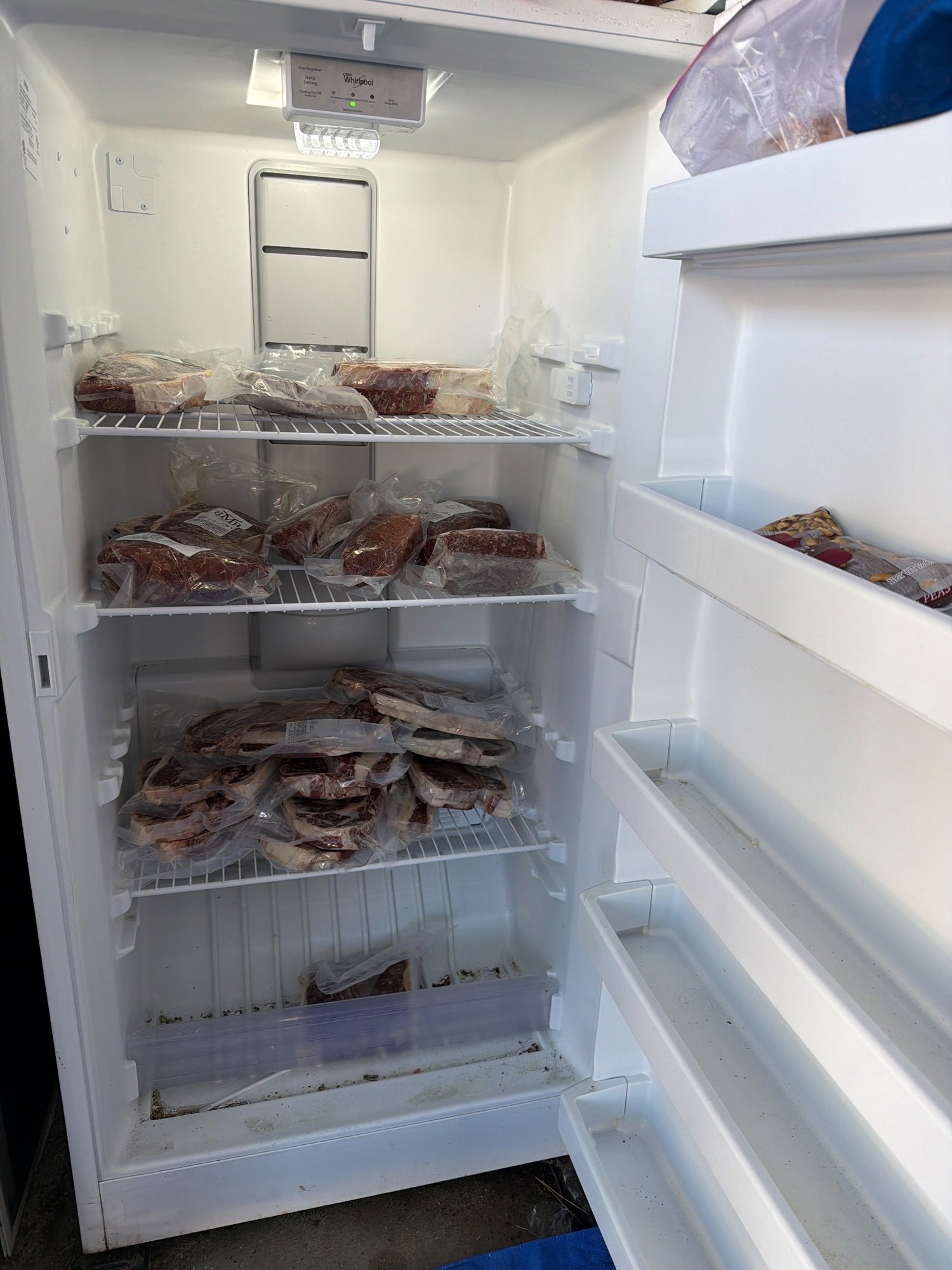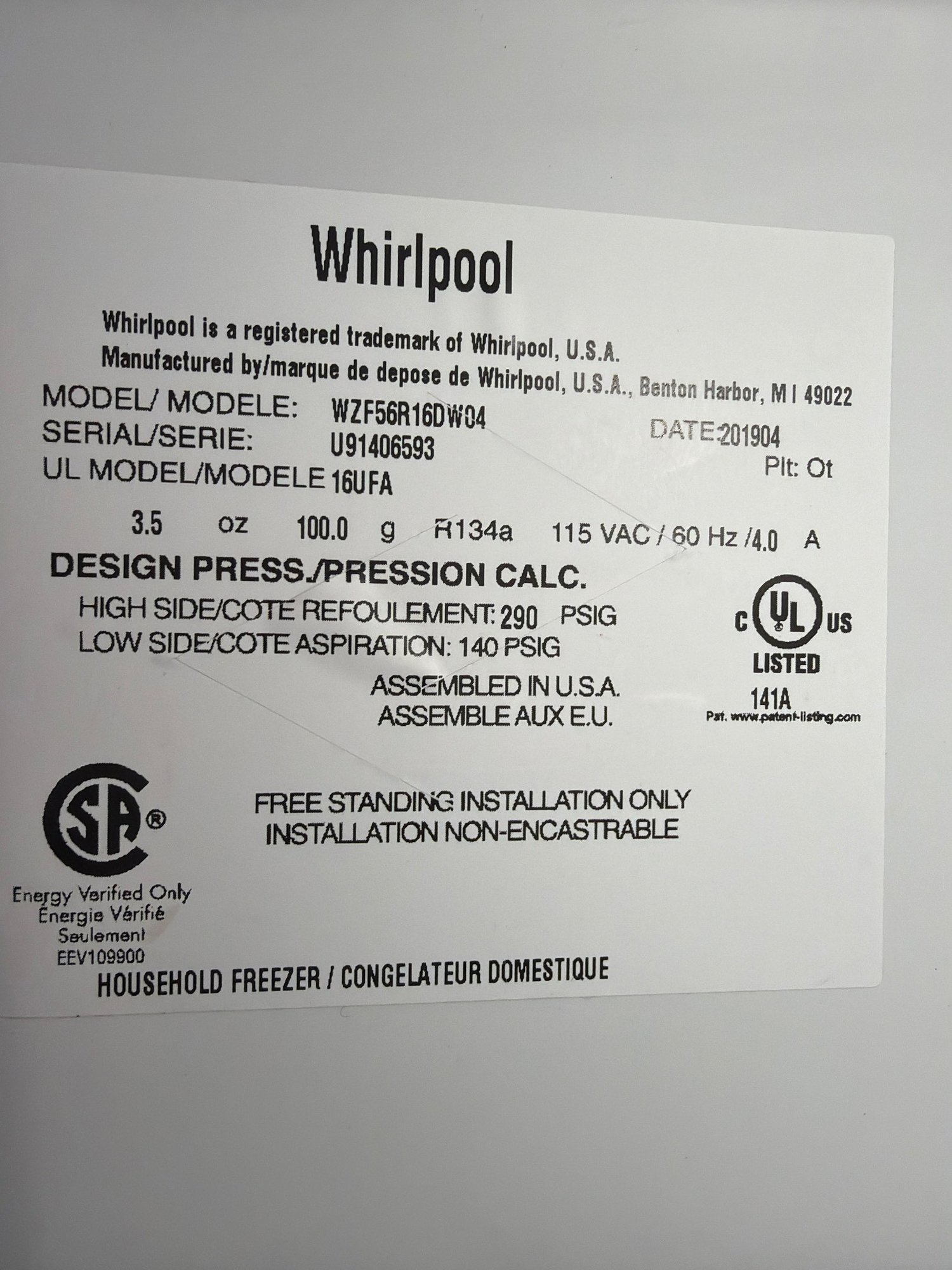 Whirlpool upright freezer, model YZF56R16DW04, featuring a white exterior with a single vertical handle. The interior includes five wire shelves and door compartments. The label indicates a design pressure of 290 PSIG and a low side pressure of 140 PSIG. Freestanding, designed for household use. Dimensions: approximately 60 inches in height, 28 inches in width, and 29 inches in depth - Contents not included