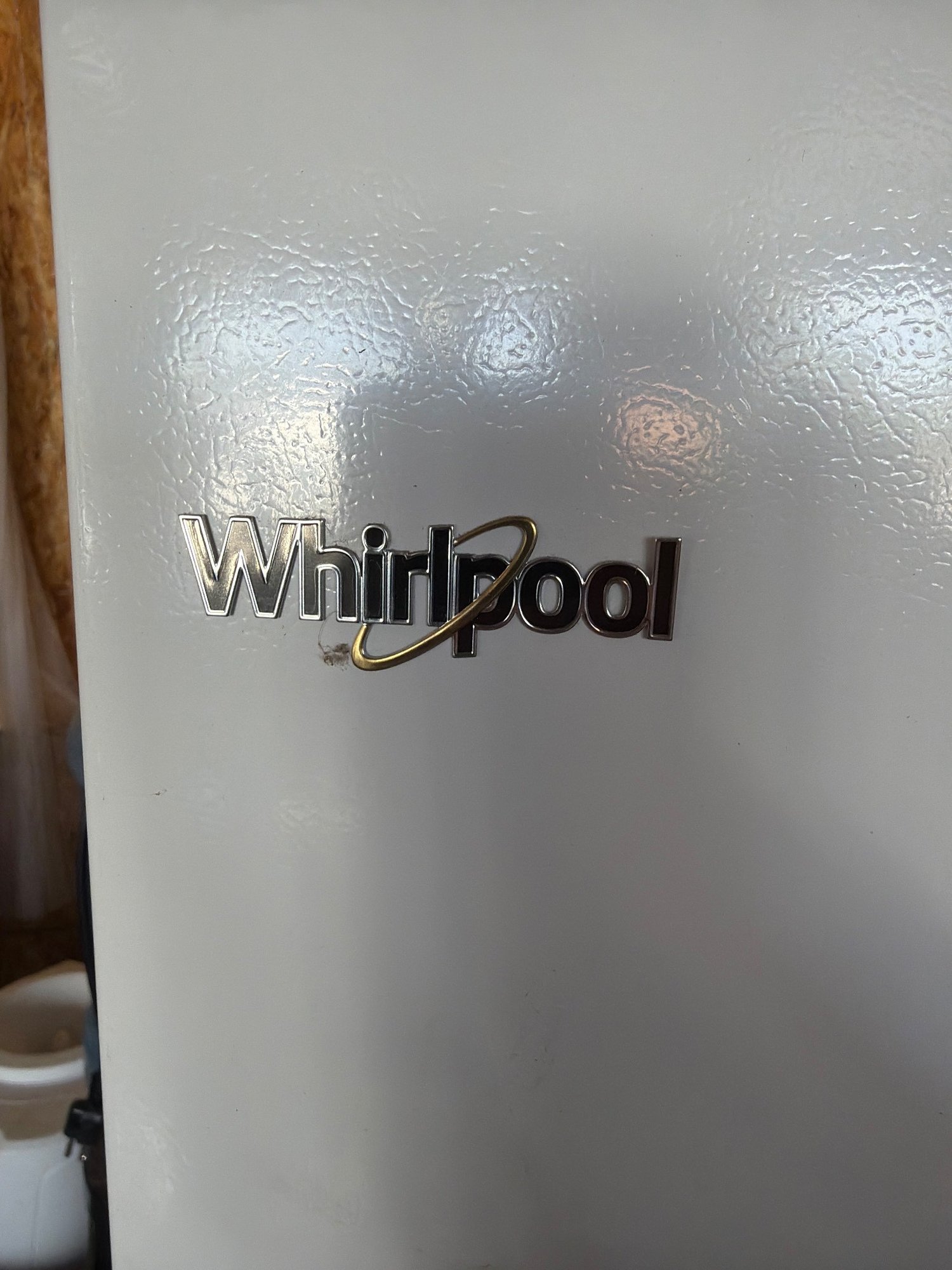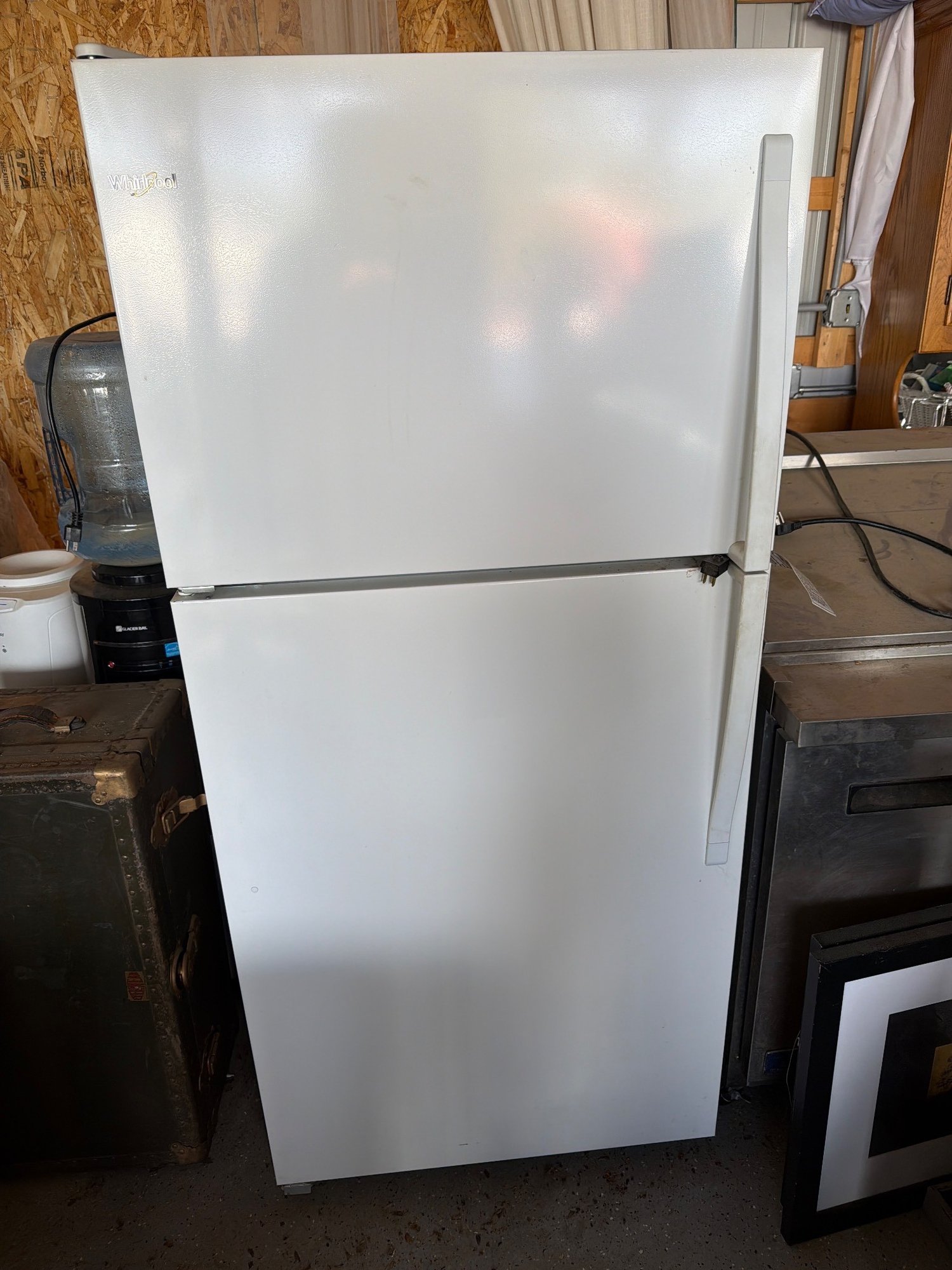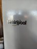 A white Whirlpool top-freezer refrigerator with a two-door design. Features a freezer compartment on top and a refrigeration section below, each with a straightforward handle for opening. Whirlpool logo visible on the upper door. Measurements as taken from the attached tape measure: approximately 63 inches tall, 29 inches wide, and 30 inches deep. Exterior shows surface wear consistent with prior use.