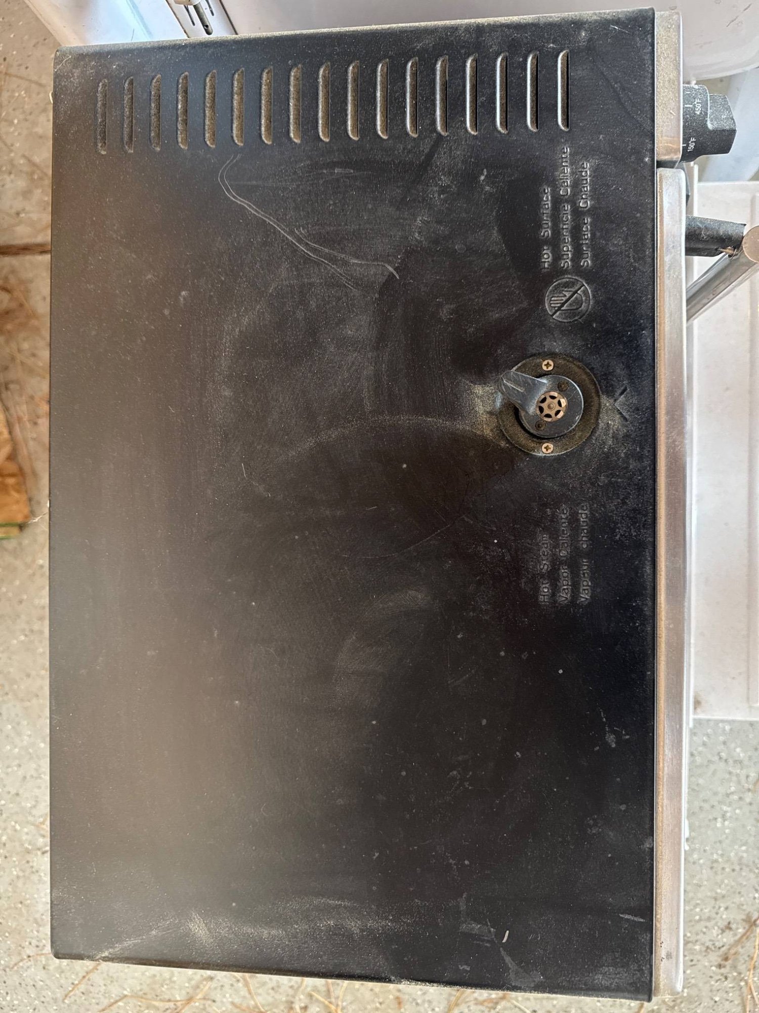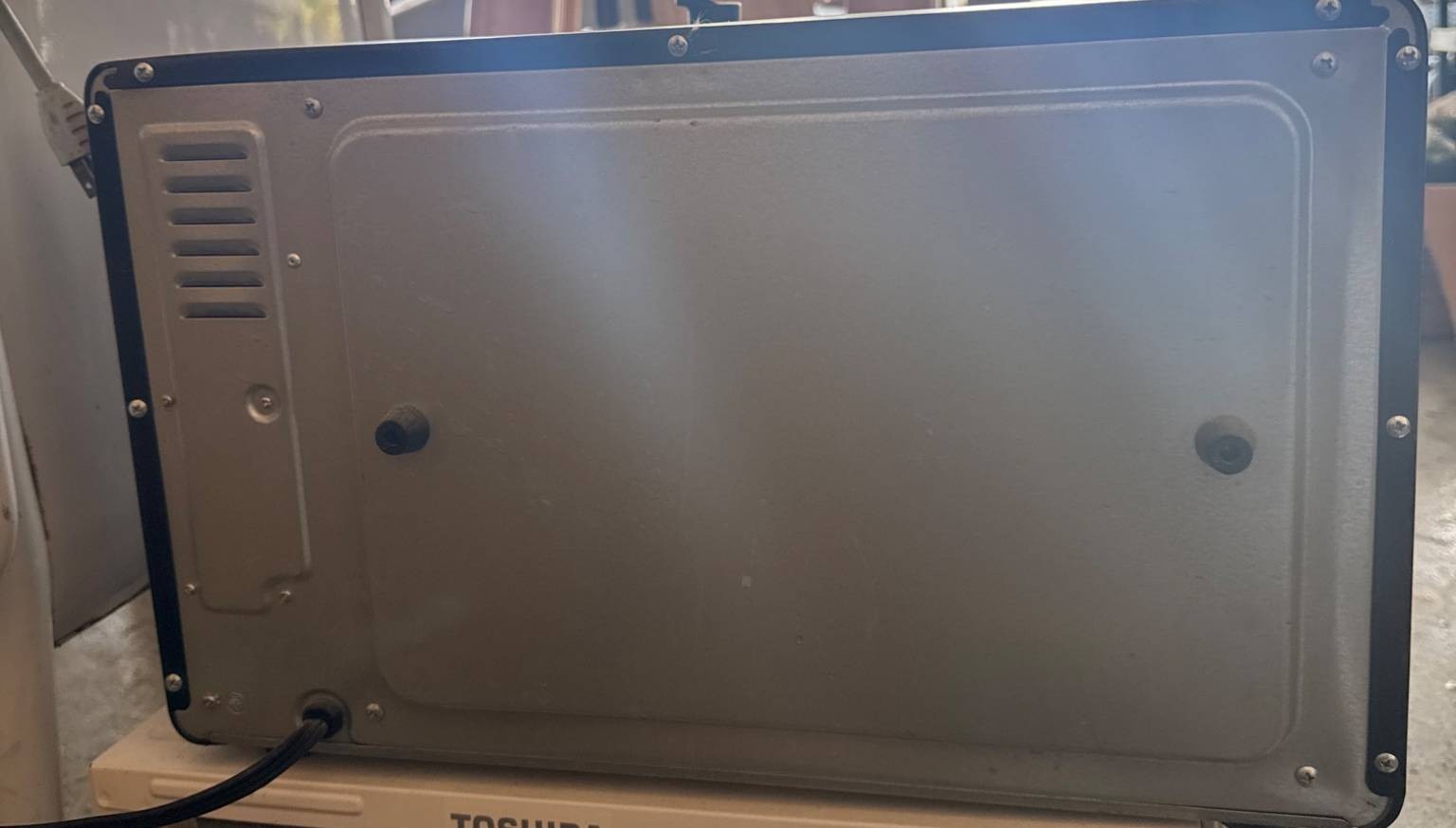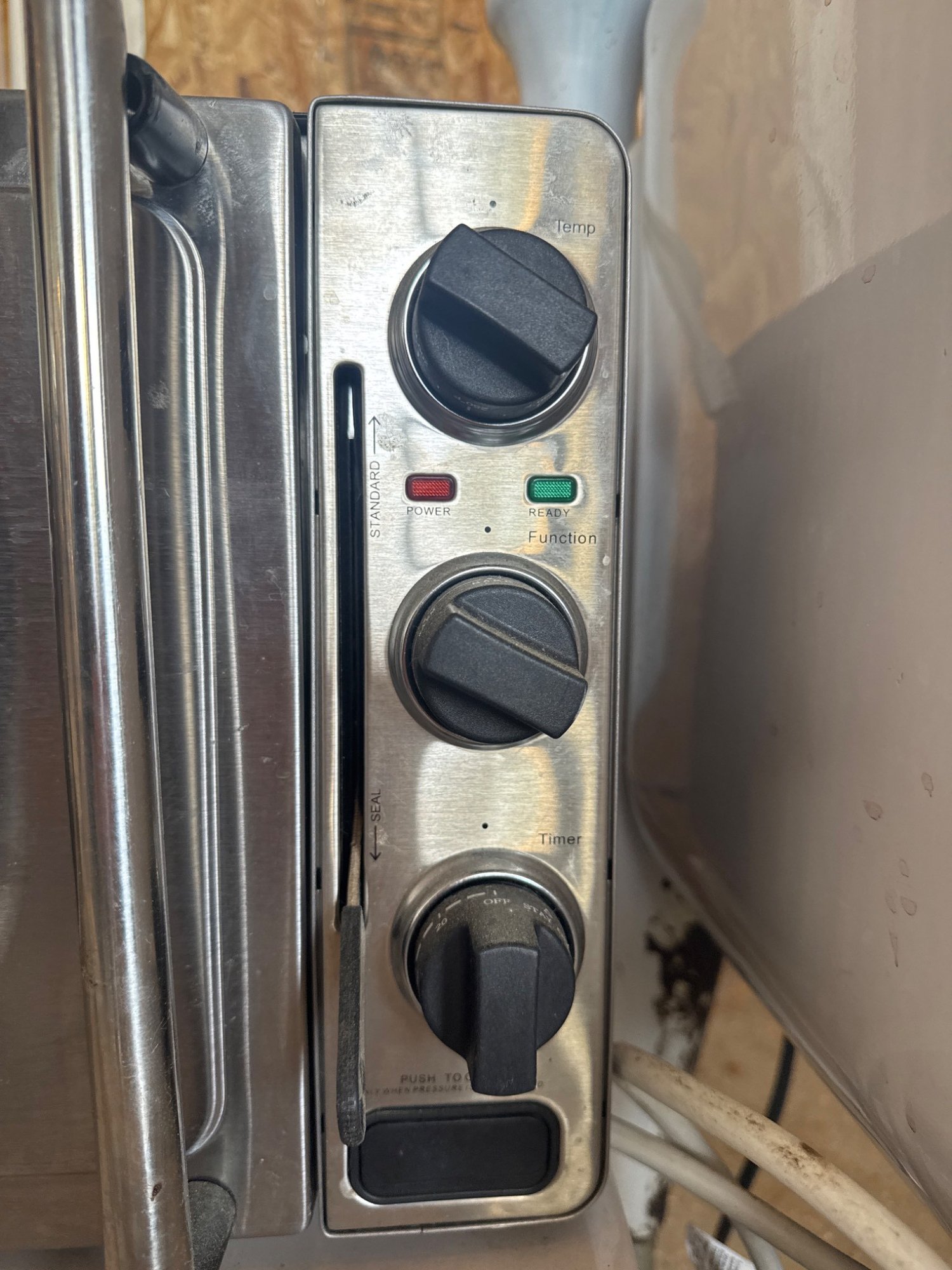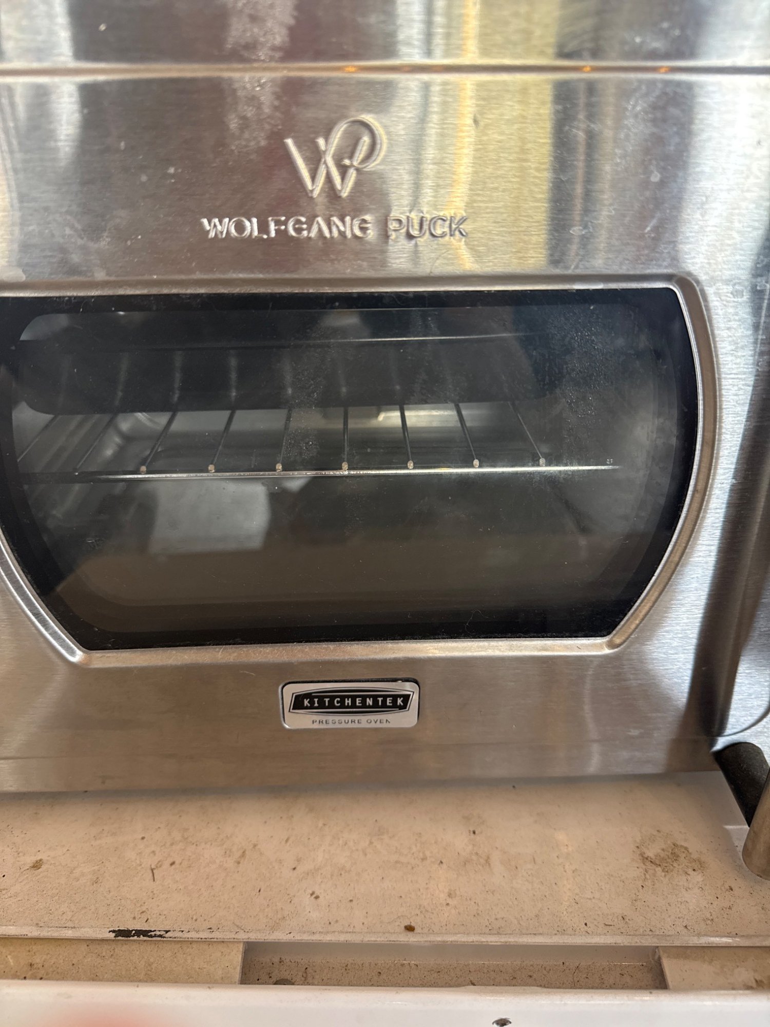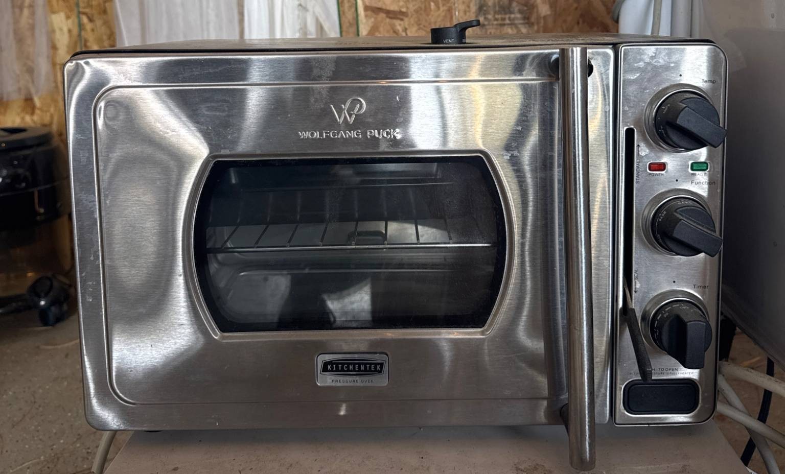 Wolfgang Puck countertop convection oven, model BPW001, featuring a stainless steel exterior casing, temperature control knobs, timer, function selector, and a clear viewing window on the door. Includes an interior oven rack and crumb tray. Shows signs of prior use and surface wear. Dimensions: Approx. 16 in W x 12 in H x 13 in D.