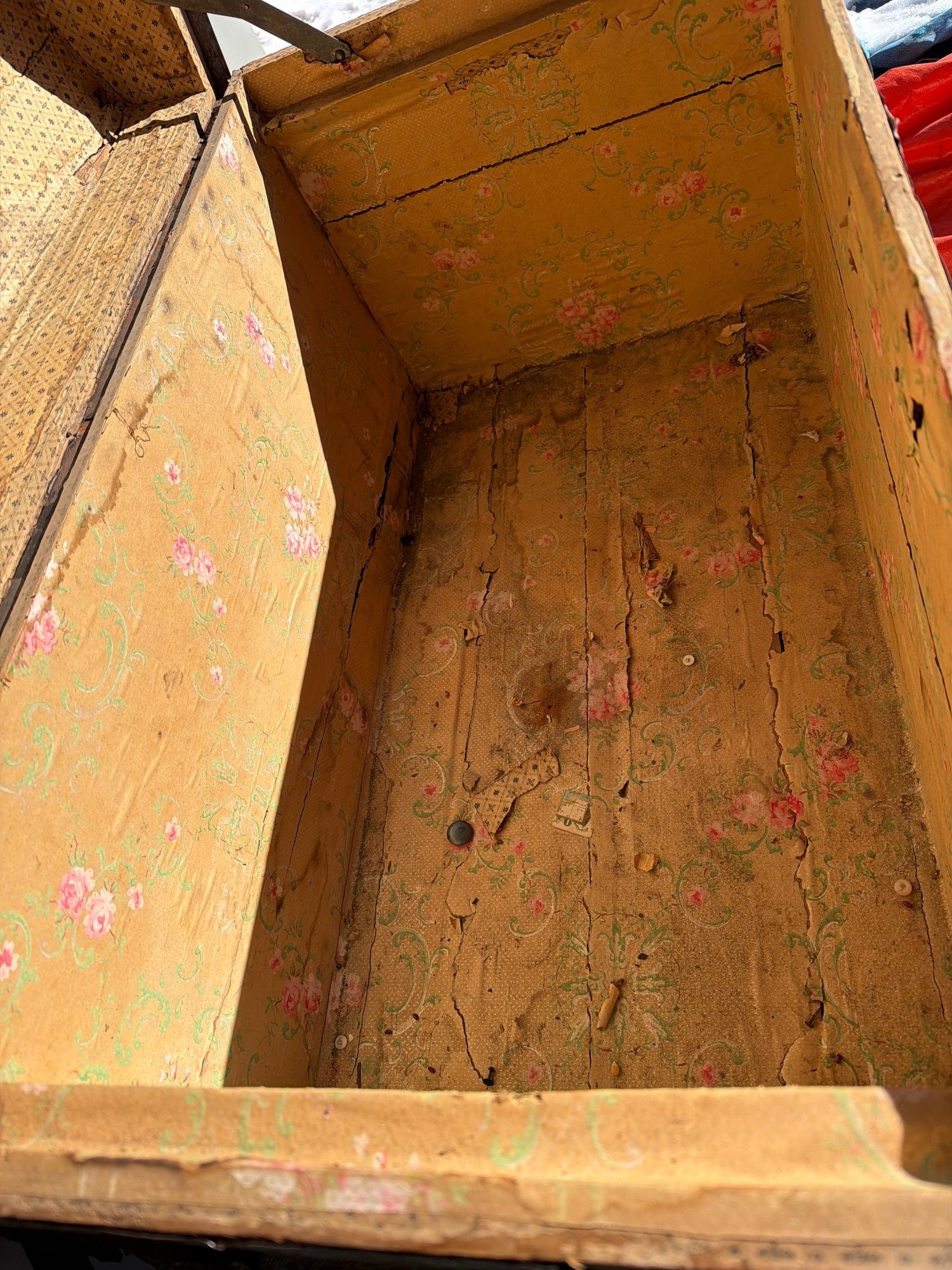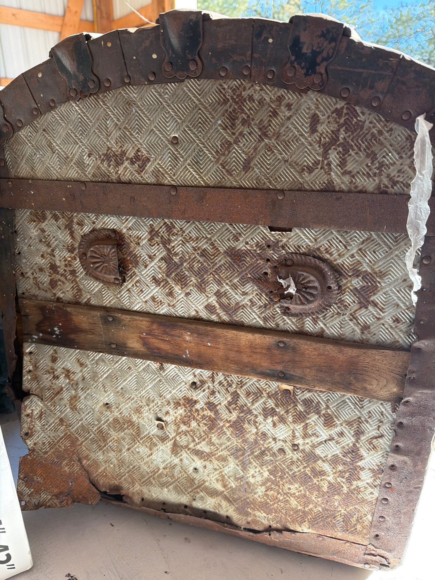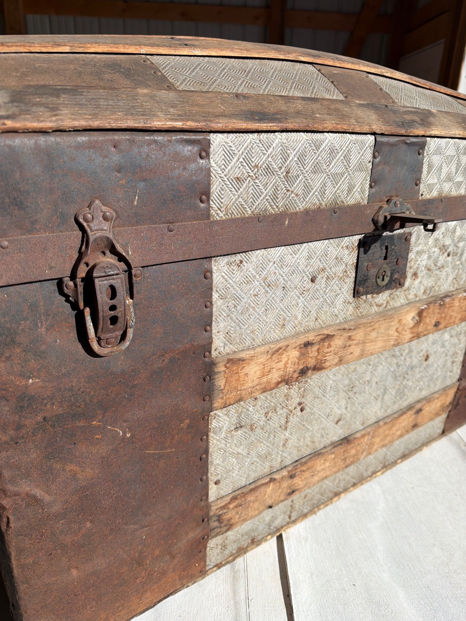 Wooden dome-top steamer trunk with metal bands and embossed tin panels displaying a diamond-pattern design. Features original metal latches, center lock (key not included), and side handles (missing or deteriorated). The interior is lined with yellow paper, floral motifs, and a lithograph-style interior lid illustration. Exterior shows rust and wear consistent with age, with some deterioration near the edges. Dimensions: approximately 30″ W x 18″ D x 20″ H.
