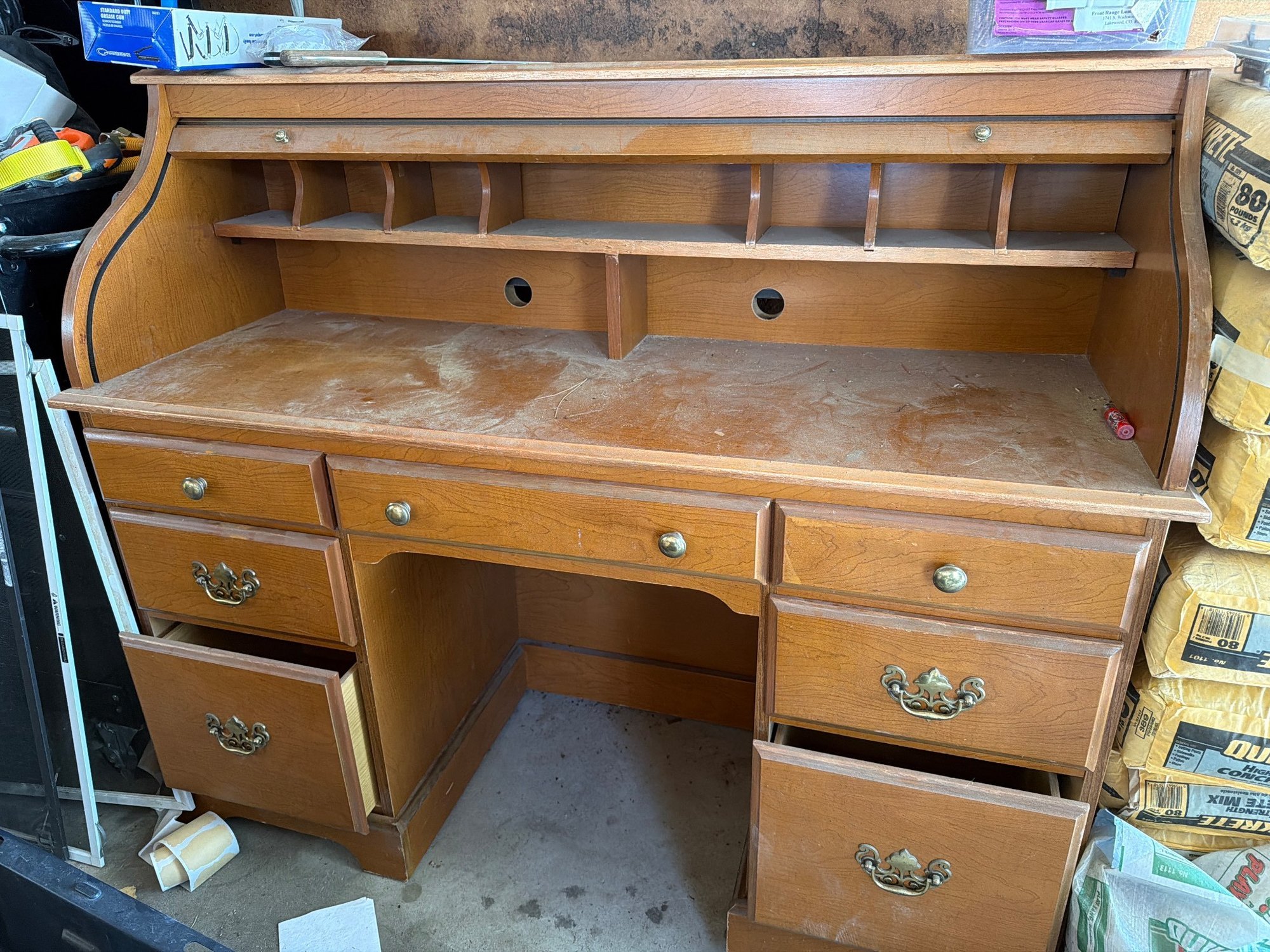 Wood roll-top desk featuring a slatted roll-top cover that opens to reveal multiple storage compartments and two circular cable management holes. The desk includes seven pull-out drawers in various sizes, with brass-toned hardware, offering spacious storage options. Visible wear and dust accumulation suggest prior use. Approximate dimensions: 48 inches wide, 42 inches high, and 24 inches deep.