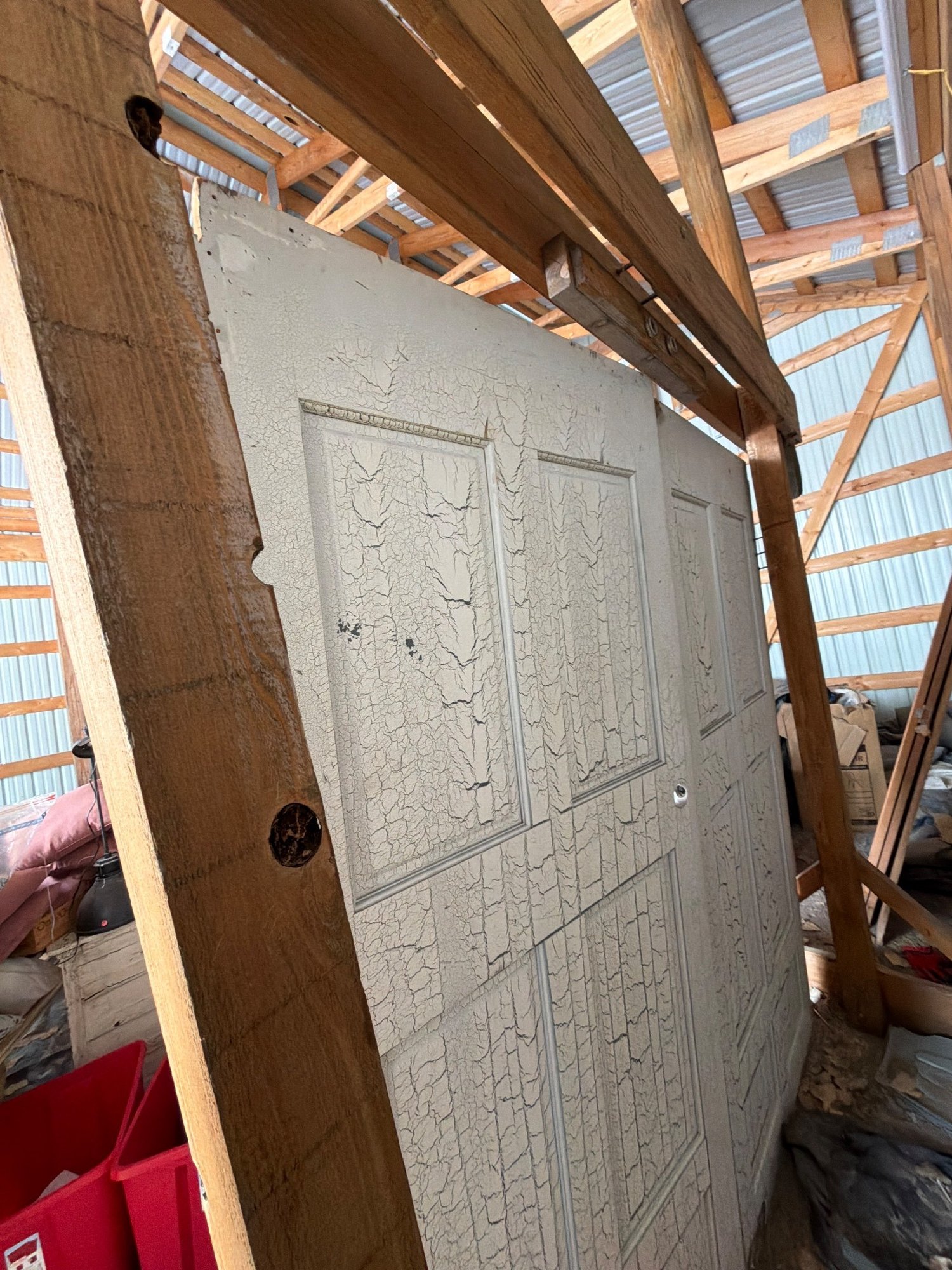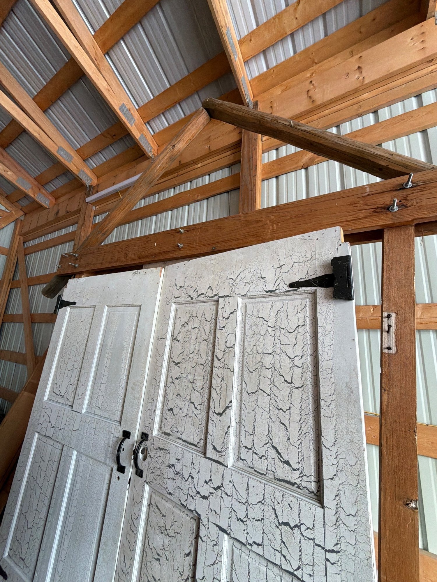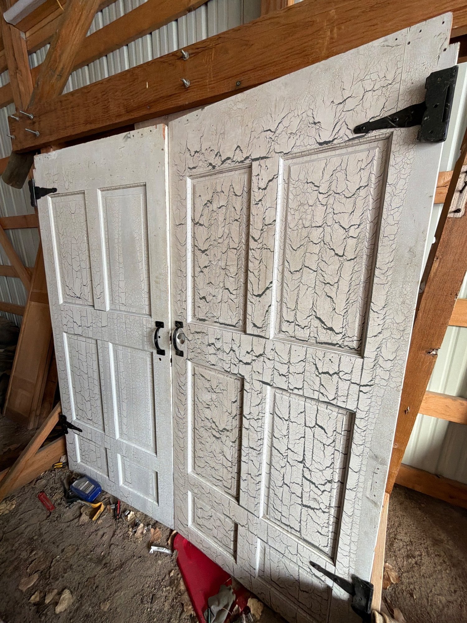Wooden archway featuring double swing doors with four-paneled designs and distressed white paint finish. The wood shows a crackle texture and signs of age or wear. The doors are mounted with visible iron hardware, including hinges and handles. Supported by a durable wooden frame with bracing for structural stability. Dimensions available upon request.