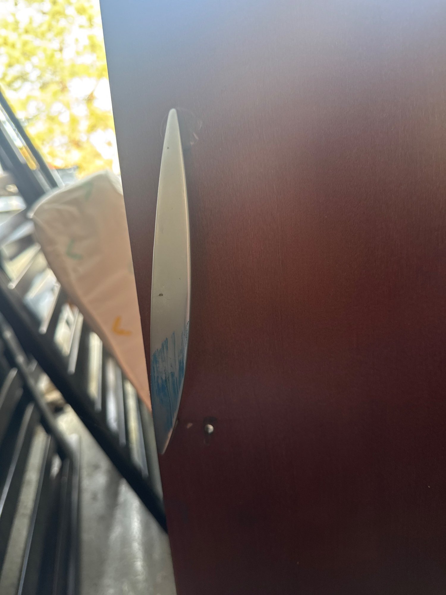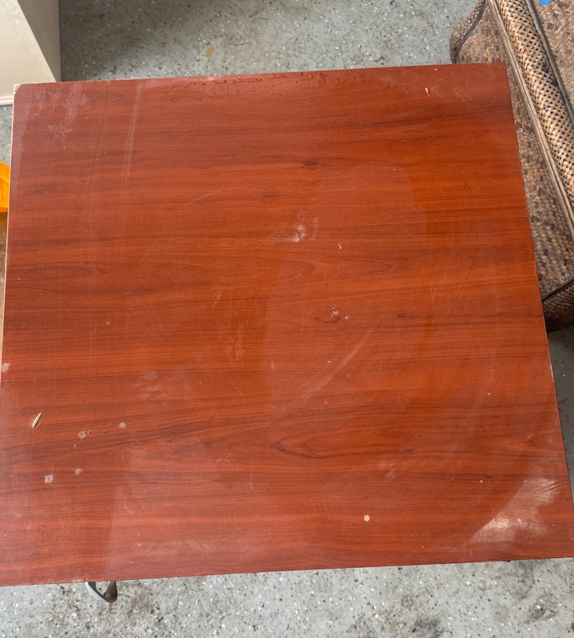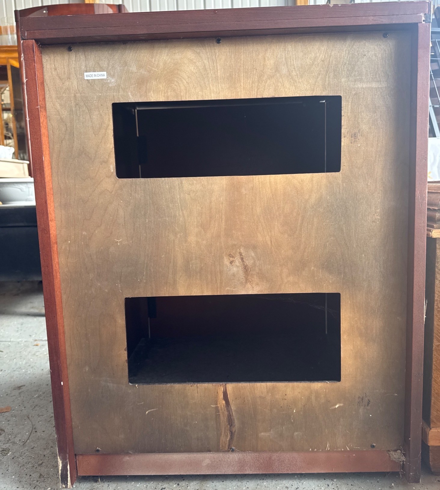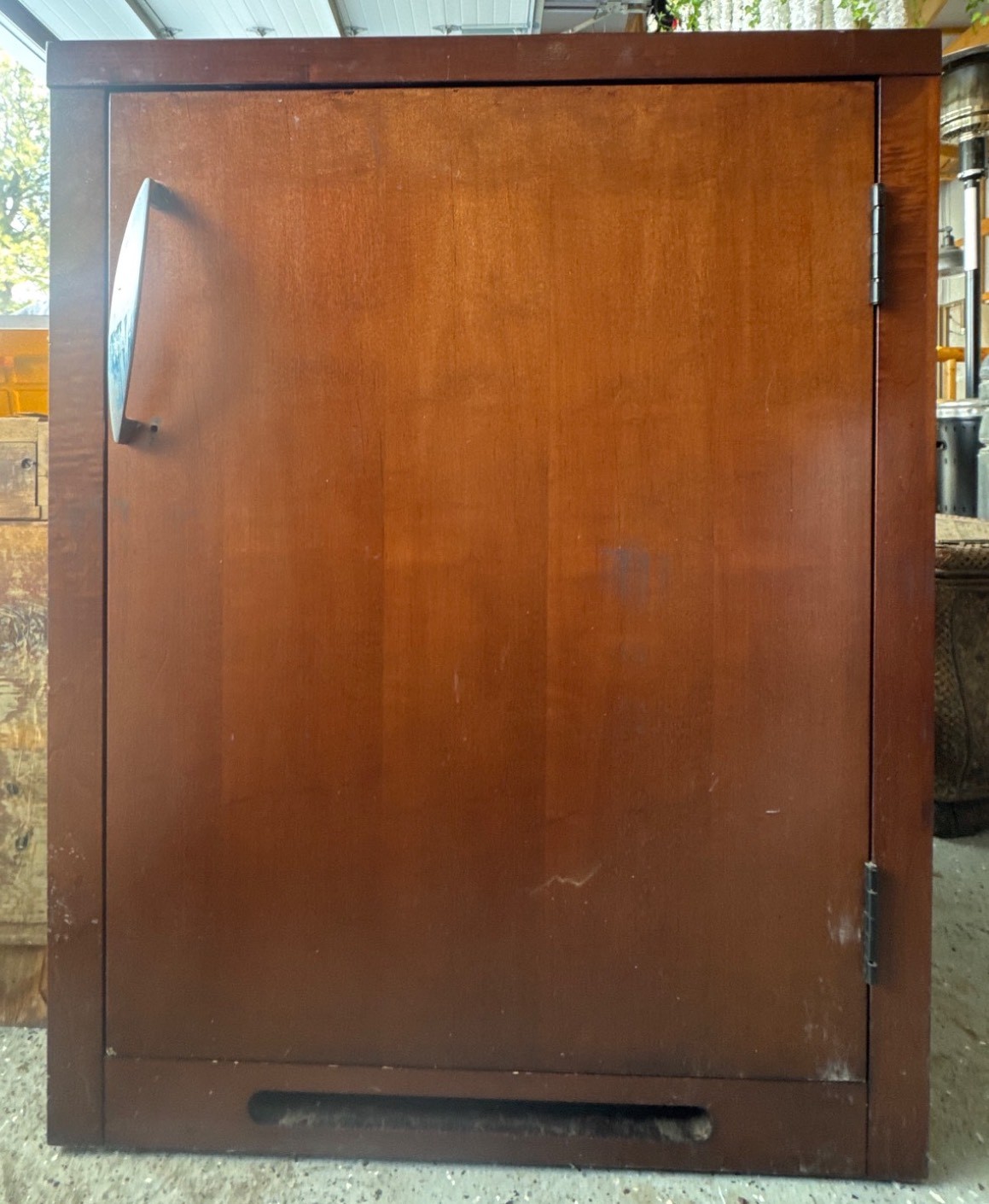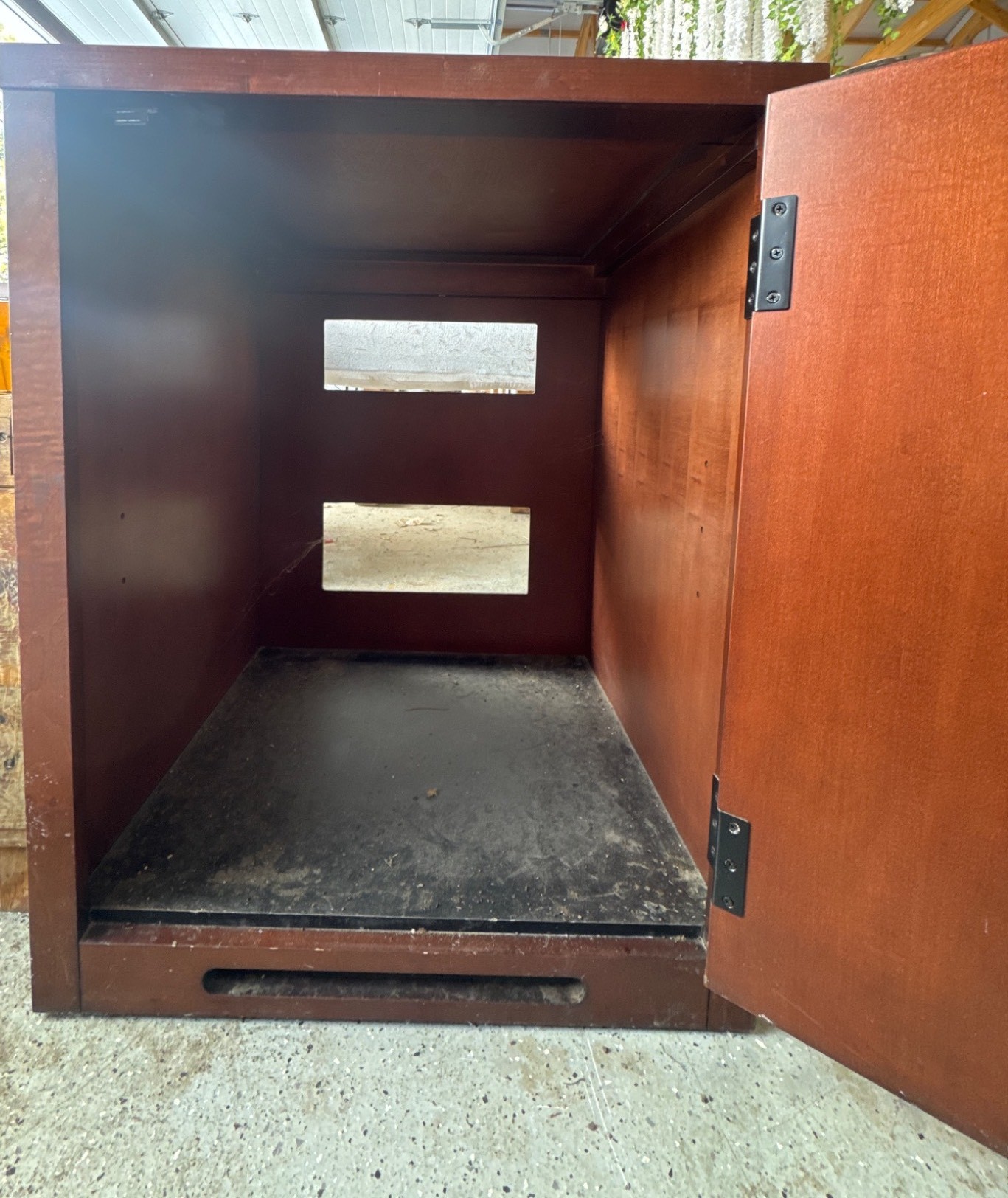 Wooden cabinet featuring a single hinged door with a metal handle and an open back panel with two rectangular cutouts. The interior includes a flat base, and the top features a simple flat square surface. The exterior shows visible wear, including surface scratches and scuffs. Approximate dimensions: 30 in tall x 24 in wide x 24 in deep.