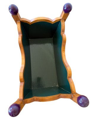 This is a wooden cradle-style box measuring approximately 14 inches in length, 9 inches in width, and 13 inches in height. It features hand-painted floral designs on each side, a green interior, and purple knob accents at the corners. The condition shows visible wear including paint chipping on the knobs. It is likely a functional or decorative piece.