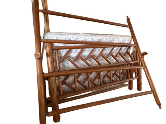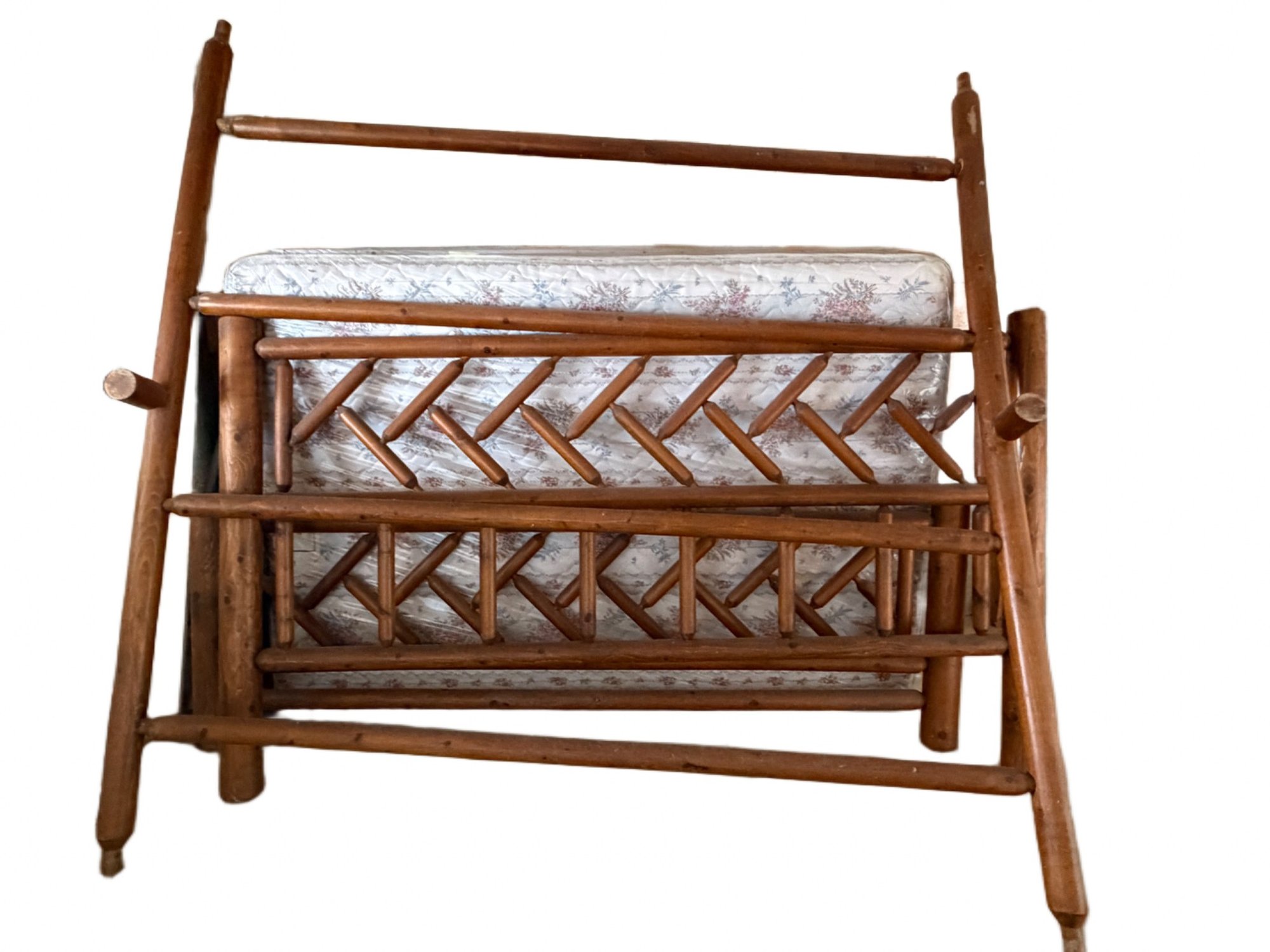 This is a wooden frame bed set featuring log-style construction with a herringbone design on the main panels. It measures approximately 80 inches wide and 46 inches tall as shown in the photos. Includes the frame and a mattress. Condition appears used with visible wear. No identifiable manufacturer details are noted.