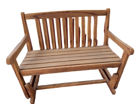 A wooden outdoor glider bench with overall dimensions of approximately 44 inches in width, 20 inches in depth, and 32 inches in height. Made from wood with a slatted design for the seat and backrest. Features a gliding rocking mechanism, suitable for outdoor use. Condition appears to be used with visible wear.