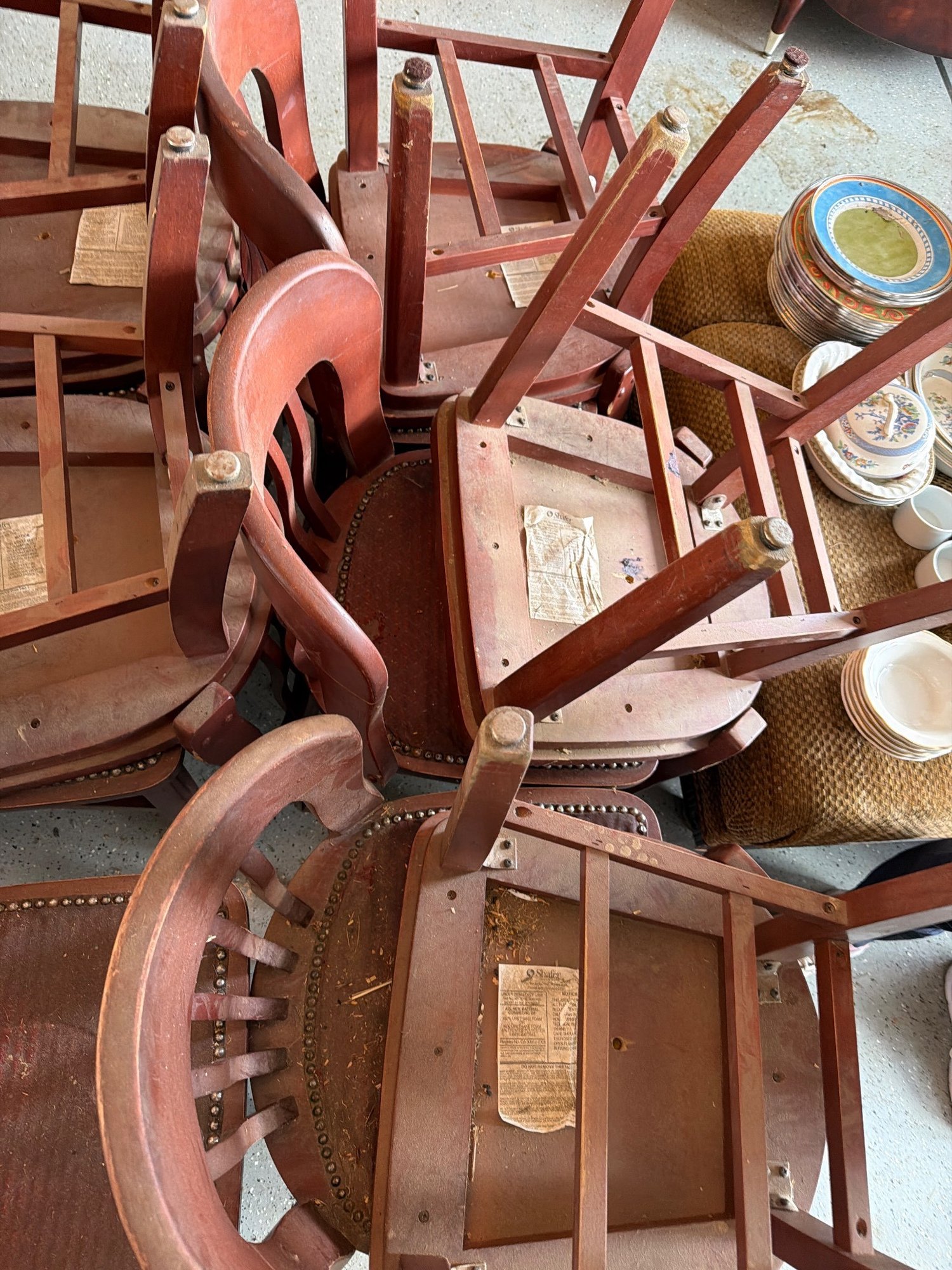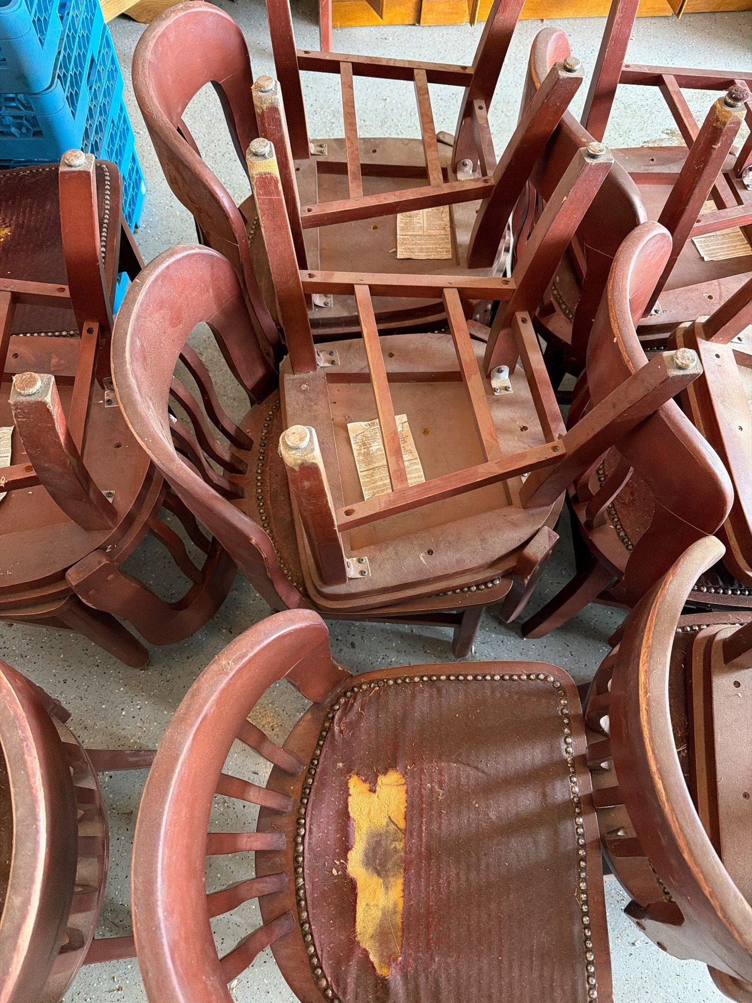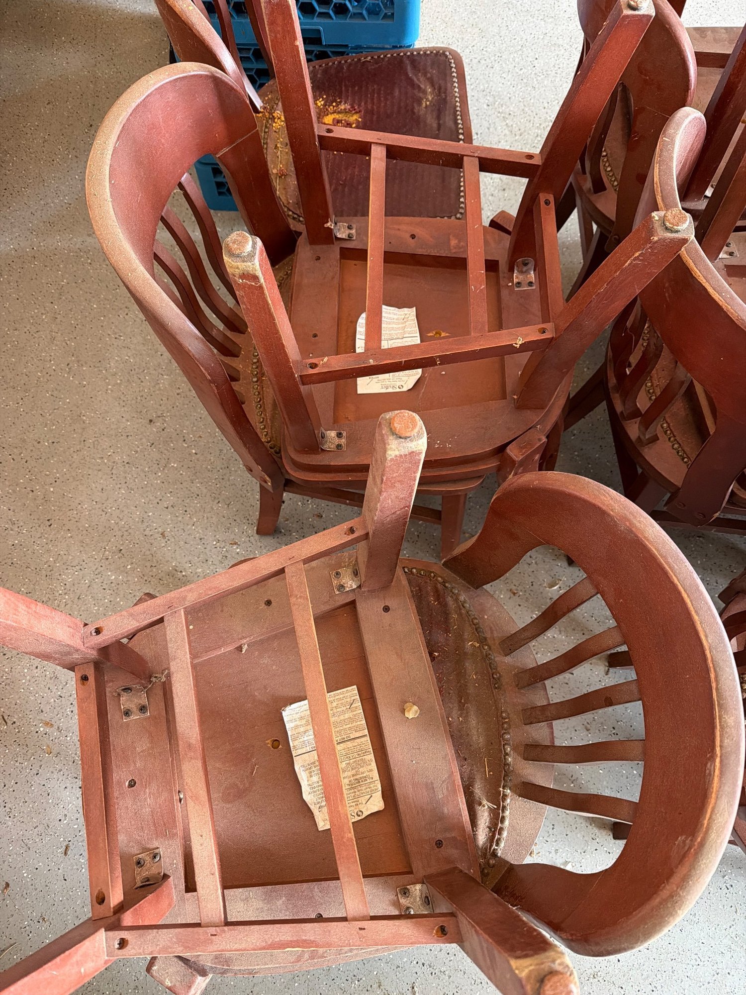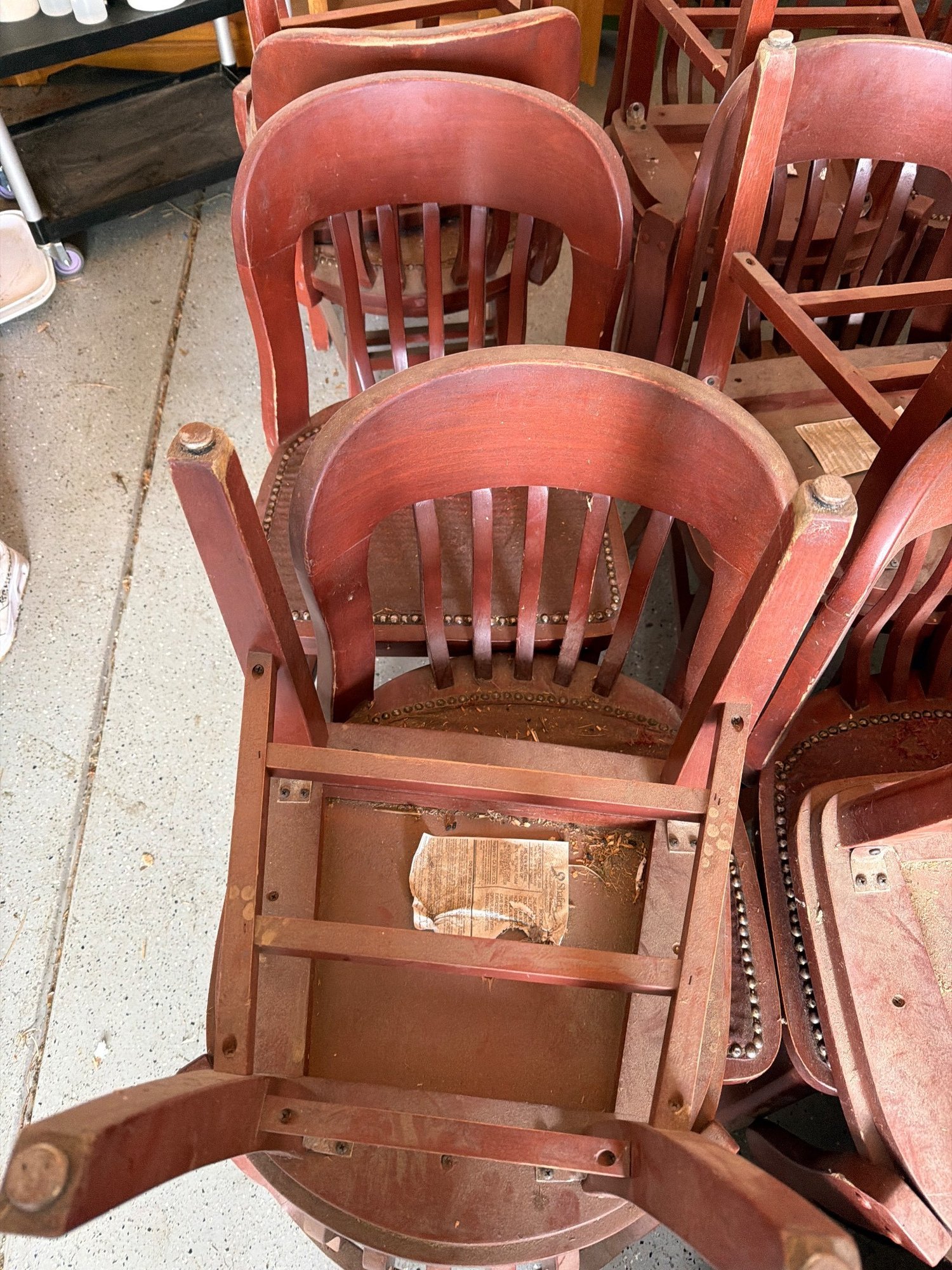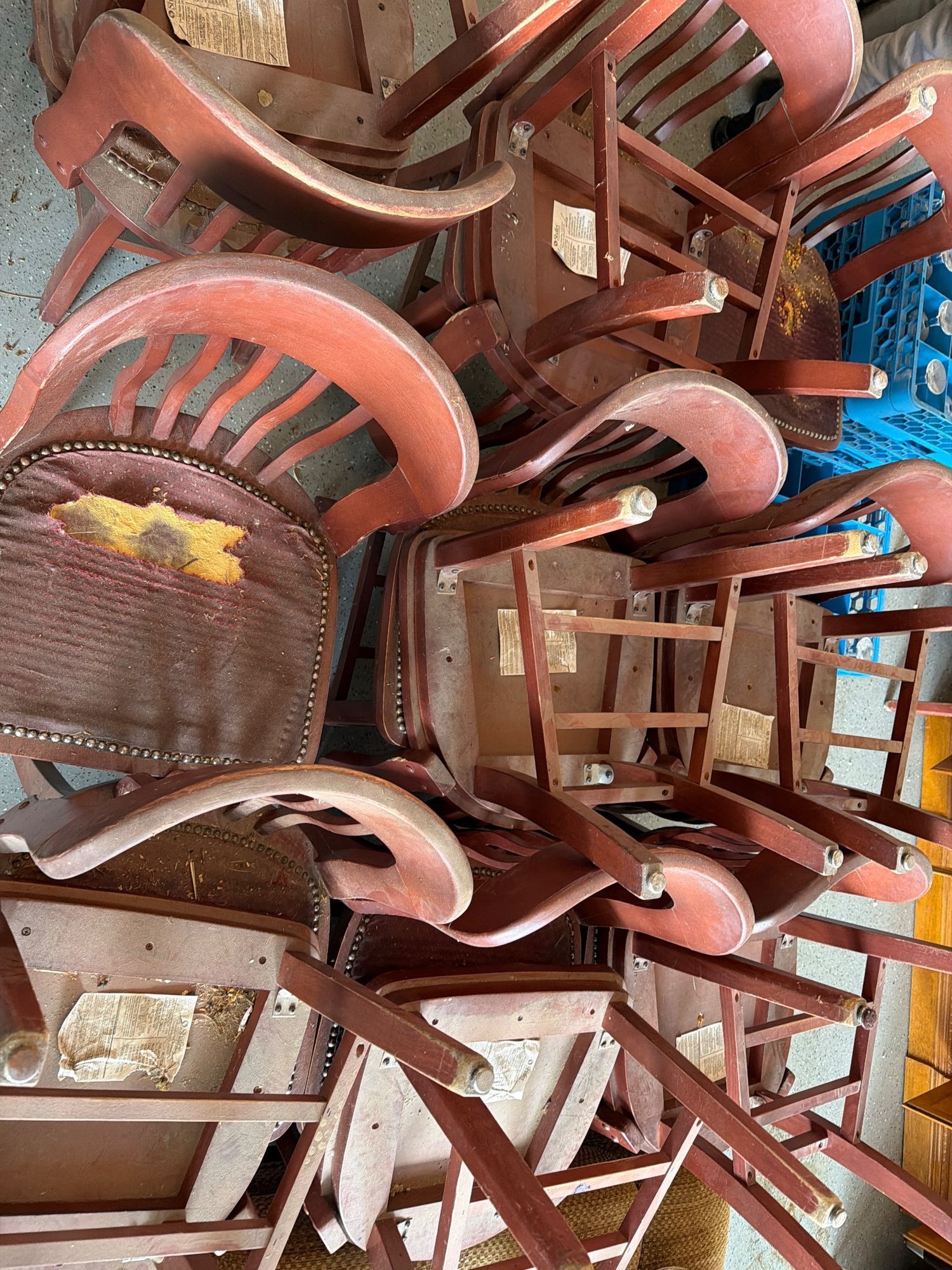 wooden slat-back chairs featuring curved backrests and upholstered seats with visible wear and tear. The chairs display a reddish-brown finish. Each chair is constructed with a solid wood frame, joined by stretchers for structural stability. Upholstery shows notable condition issues, including torn fabric. Dimensions: individual chairs measure approximately [provide dimensions, if known].