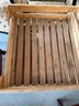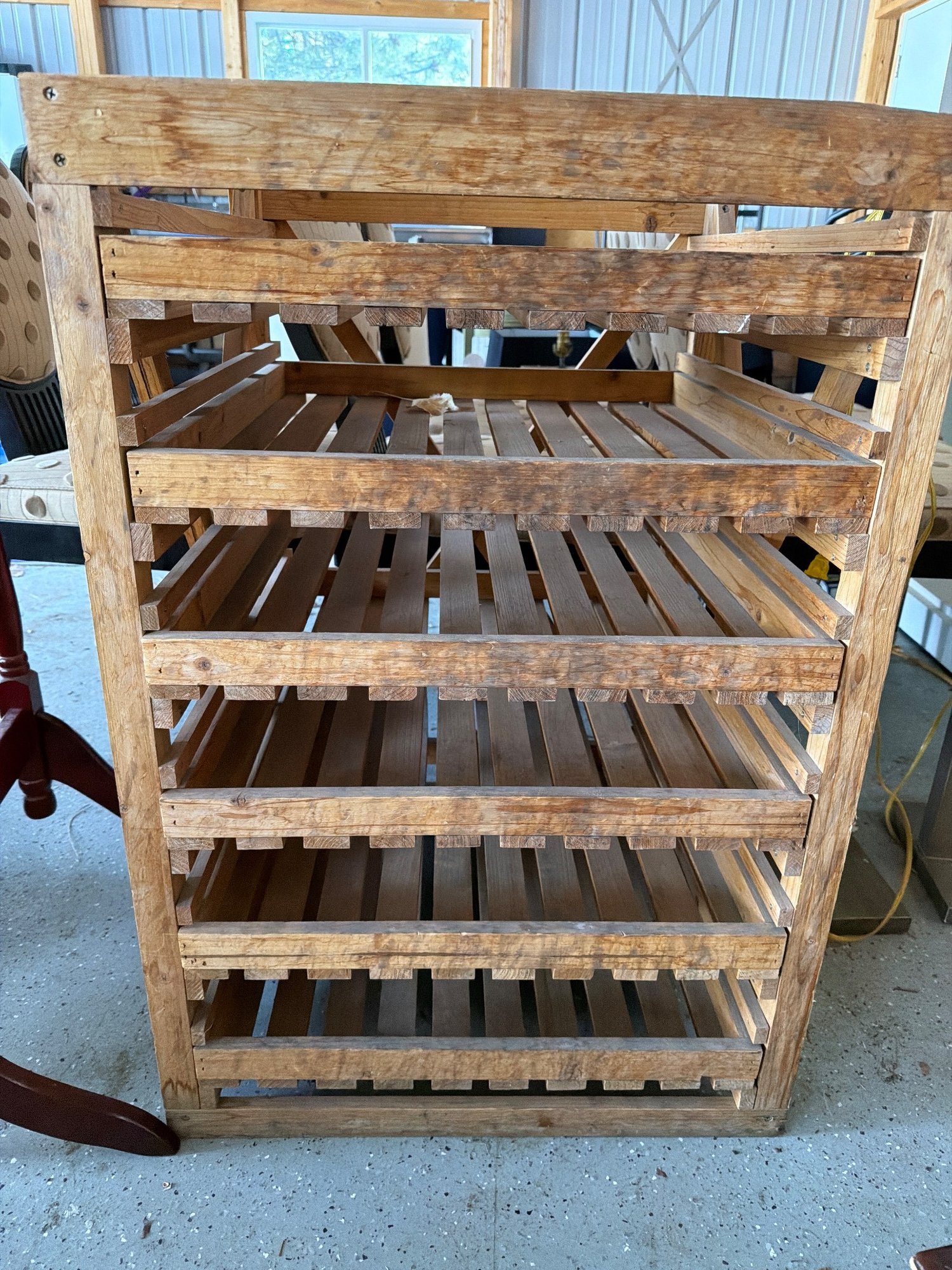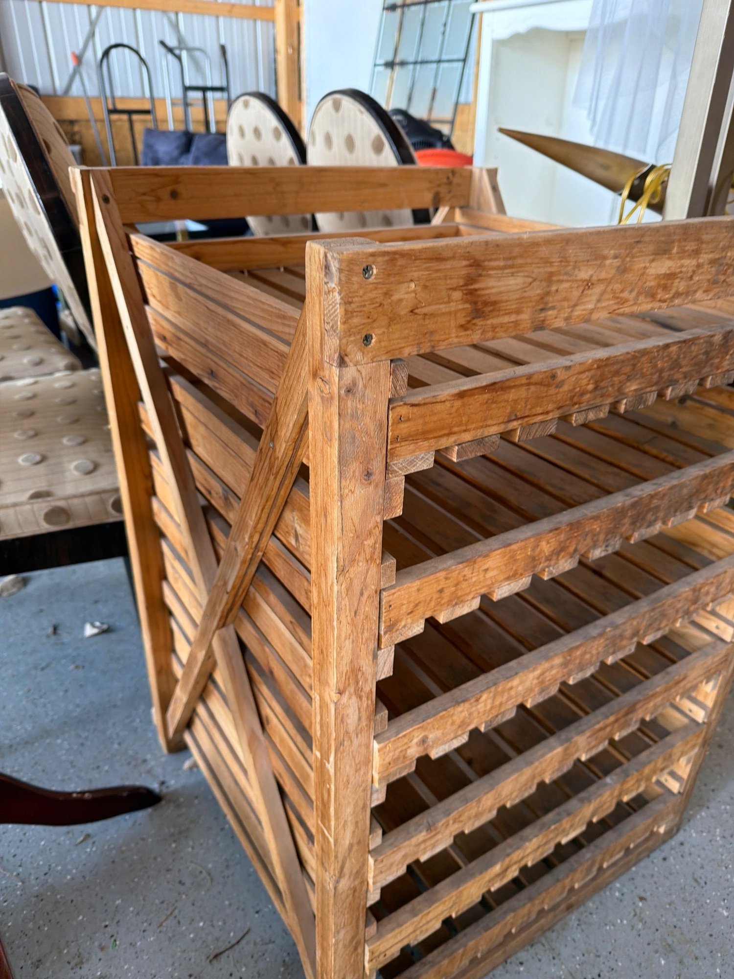 This wooden slatted storage rack features a robust and functional design with multiple tiered slat shelves perfect for organization. Crafted from durable wood, the rack showcases natural tones and a sturdy rectangular frame supported by triangular reinforcements for stability. Each shelf is comprised of parallel wooden slats, providing ventilation and support. Ideal for versatile storage in various settings. Dimensions: 32 inches tall, 20 inches wide, and 16 inches deep.