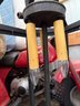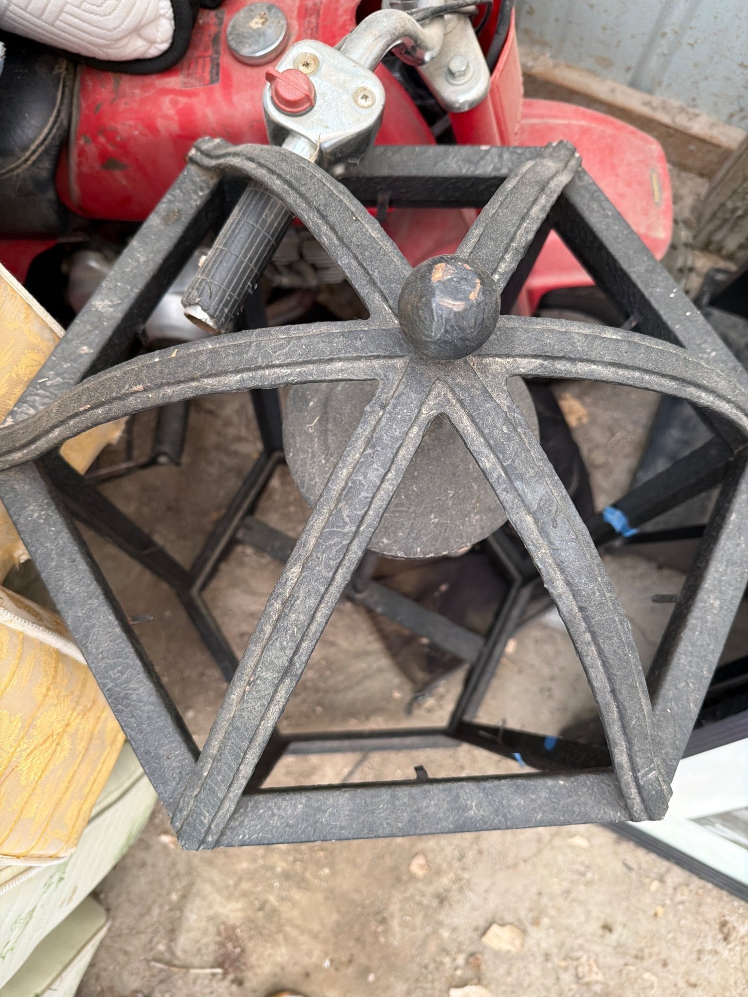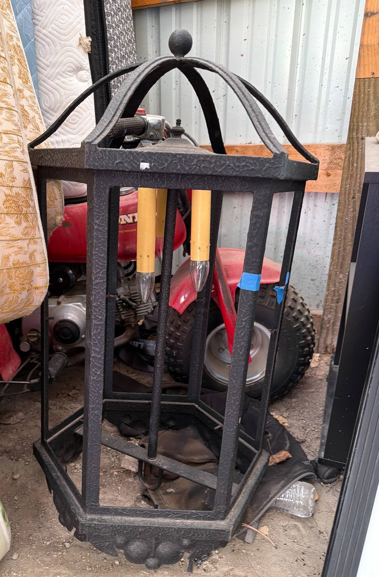 A hexagonal wrought iron pendant light featuring a dome-shaped top and faux candle bulb holders. The fixture is designed with six glassless vertical panels and a finial at the top. The two candlestick-style bulb holders are integrated into the central column. The light shows surface wear and dust accumulation. Dimensions approximately 24 inches tall and 14 inches wide.