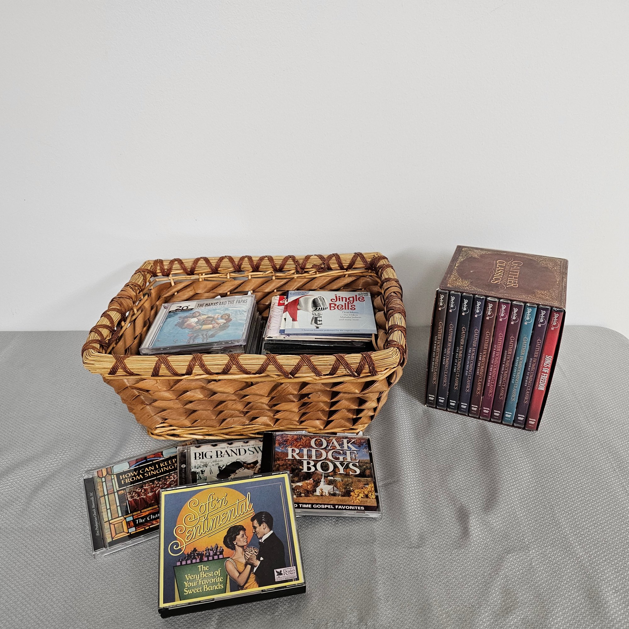 A Basket of Variety of CD's such as Big Band Swings, Andrew Lloyd Webber, The Statler Brothers and so many more. Gaither Homecoming Classics DVD Star Vista Set of 10.