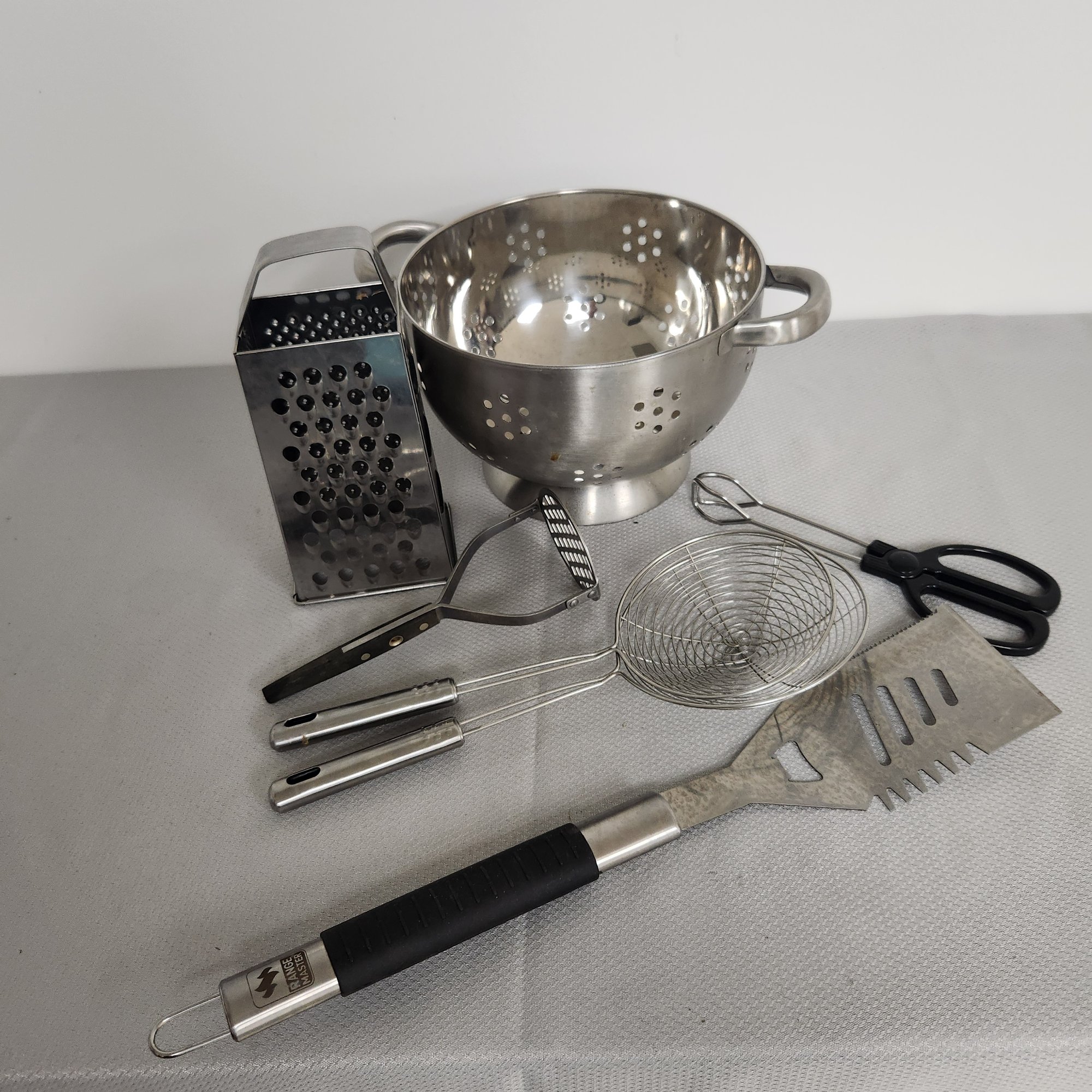 Colander, Grater, Grill Spatula, Potato Masher, Tongs and 2 straining utensila