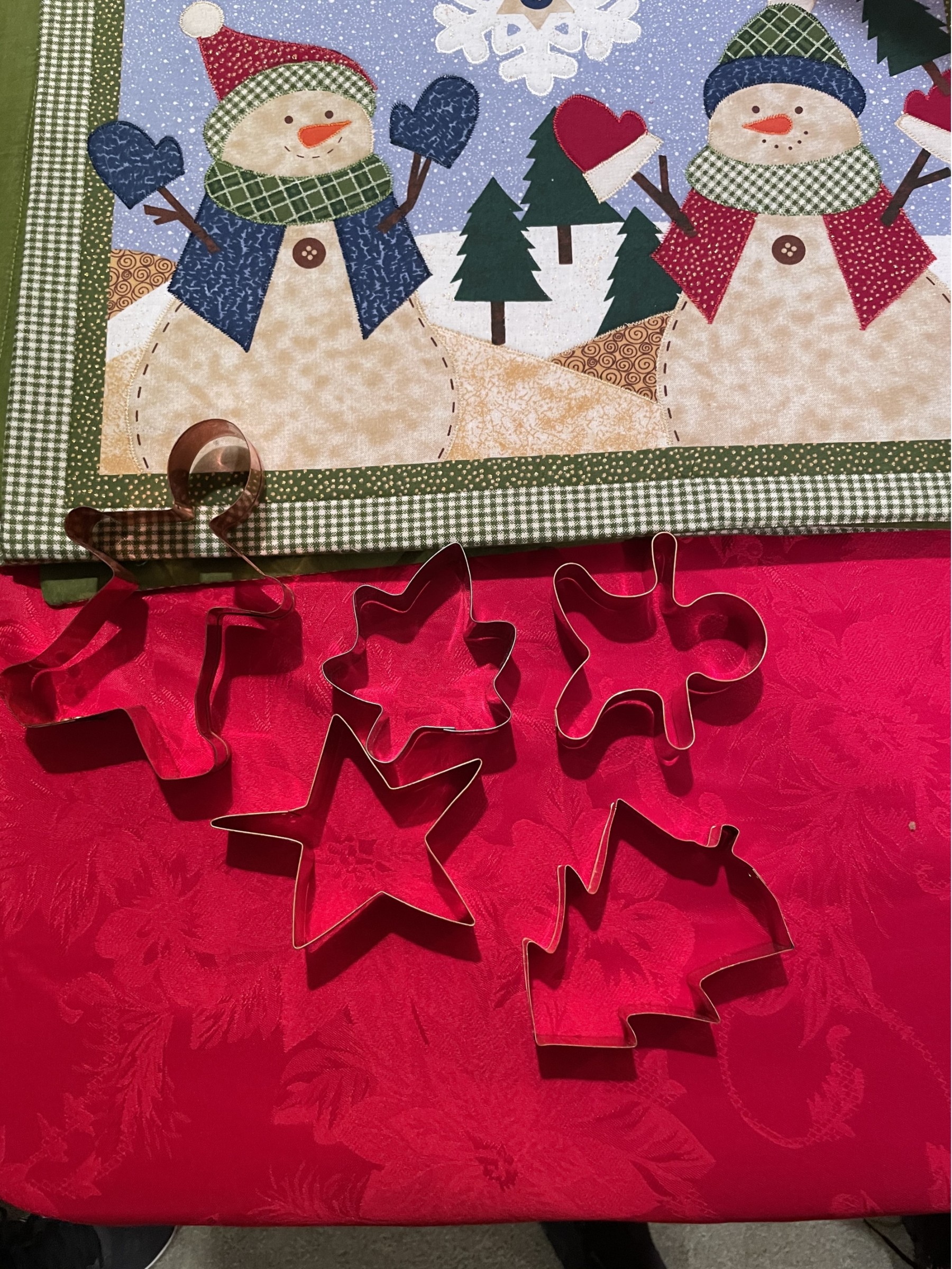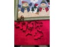 Tree stand, tree skirt, numerous cloth placemats, cookie cutters and rugs