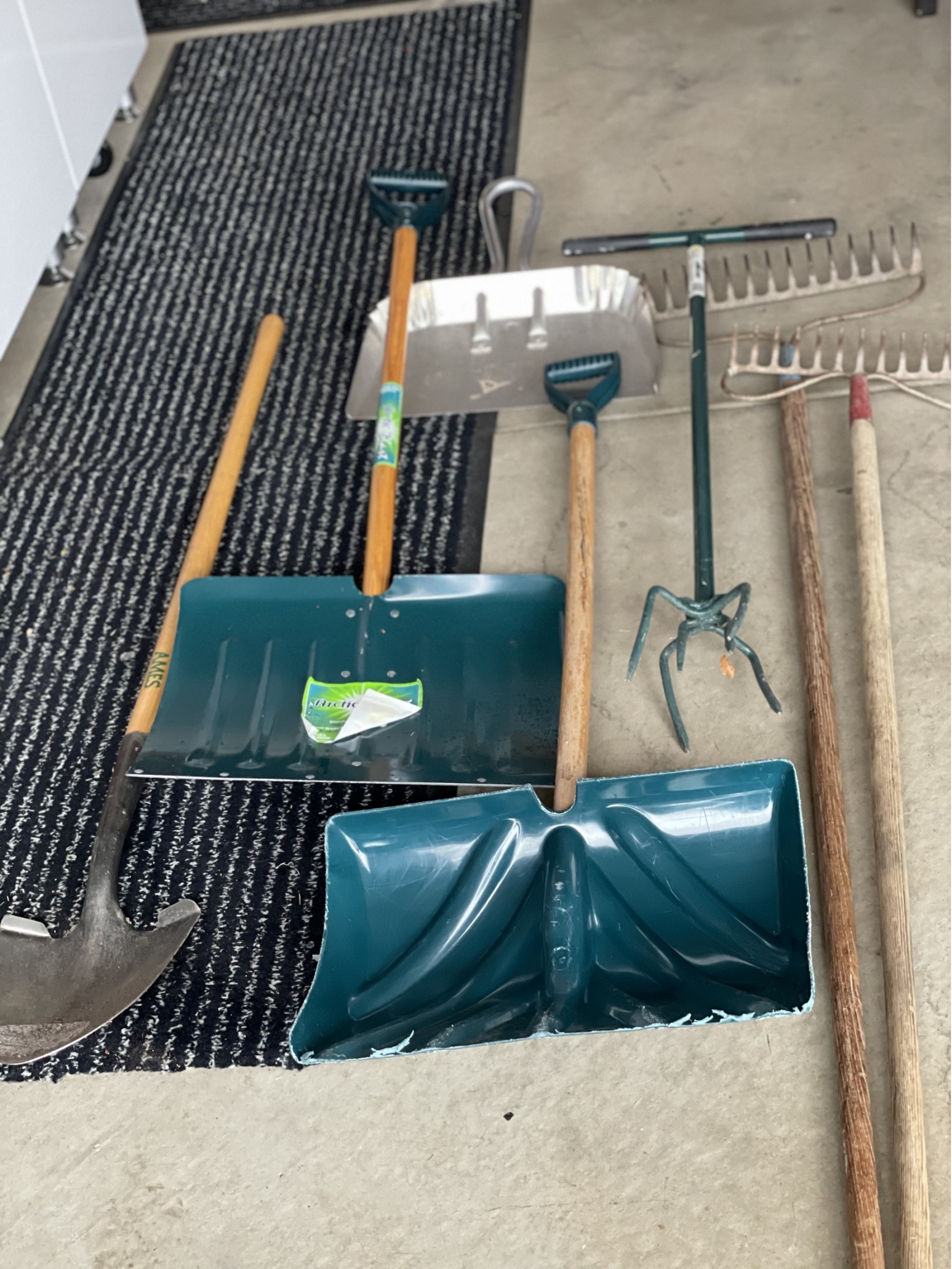 Shovel, rakes, and other tools for the yard.