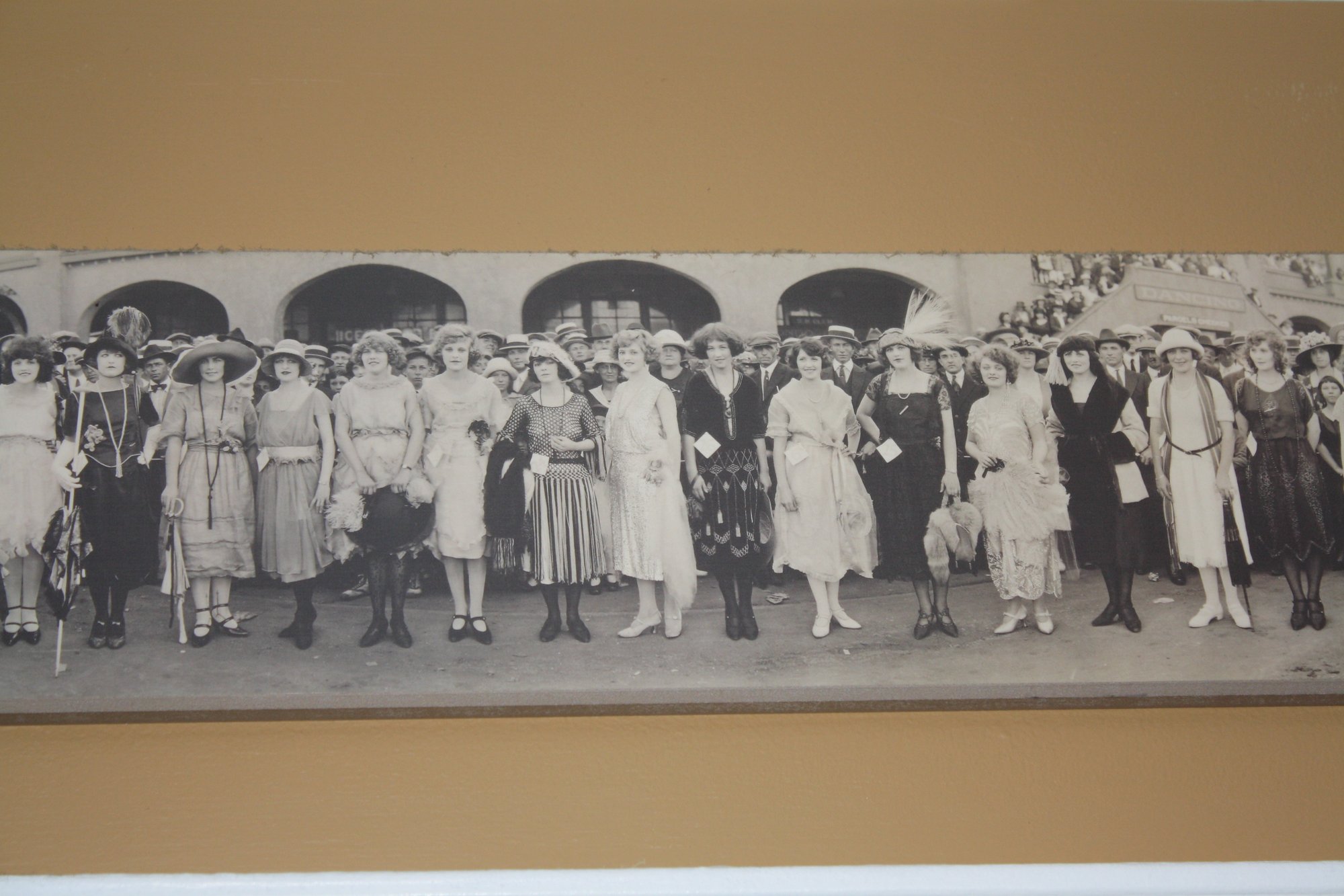 Panoramic black-and-white photograph capturing a 1924 beauty pageant, featuring numerous women in formal 1920s evening attire. Likely produced by a news service or official photographer, this historical image serves as a rare document of early 20th-century pageantry and fashion, perfect for collectors of vintage photography or historical memorabilia.