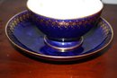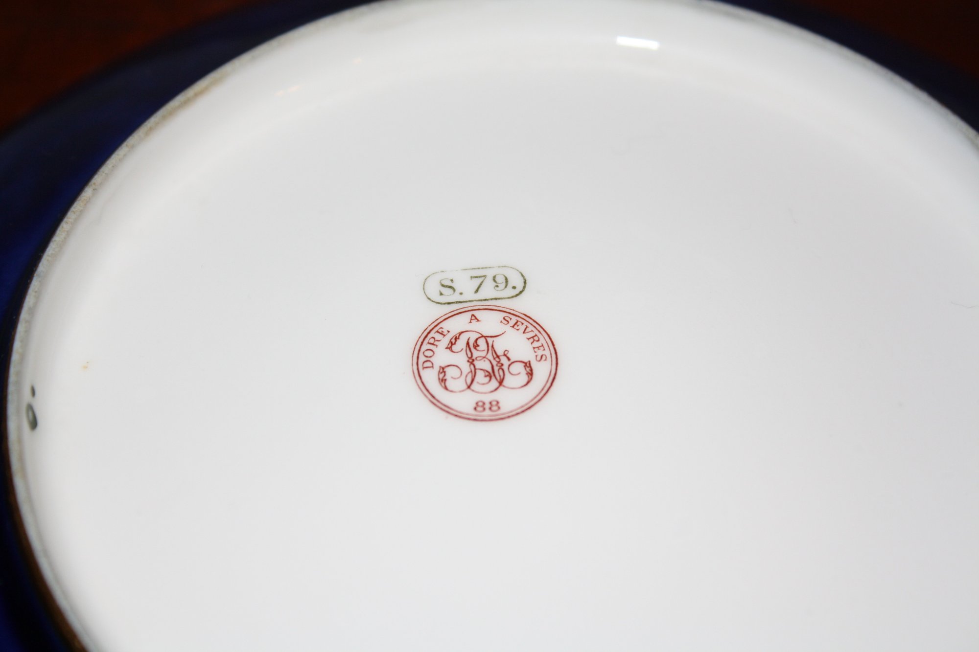19th-century Sèvres style porcelain cup and saucer set featuring a deep cobalt blue ground with intricate hand-painted gilt floral scrollwork decoration, marked on the underside with a green “S.79.” factory date stamp and a red “DORE A SEVRES” mark with “88” indicating gilding at Sèvres in 1888, exemplifying fine French porcelain artistry with richly applied gold detailing over a beau bleu glaze.