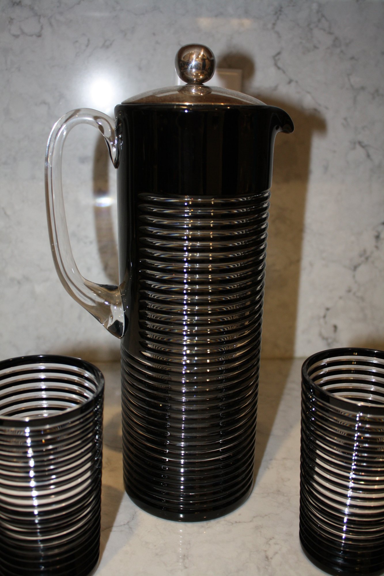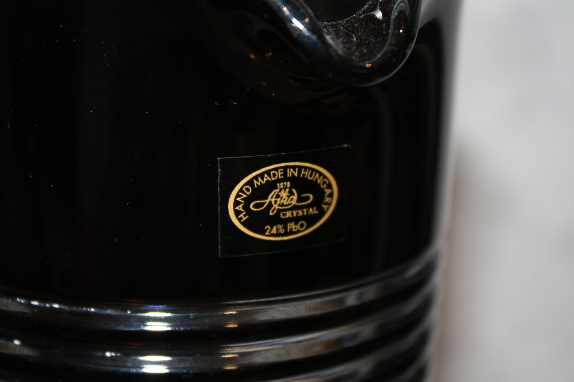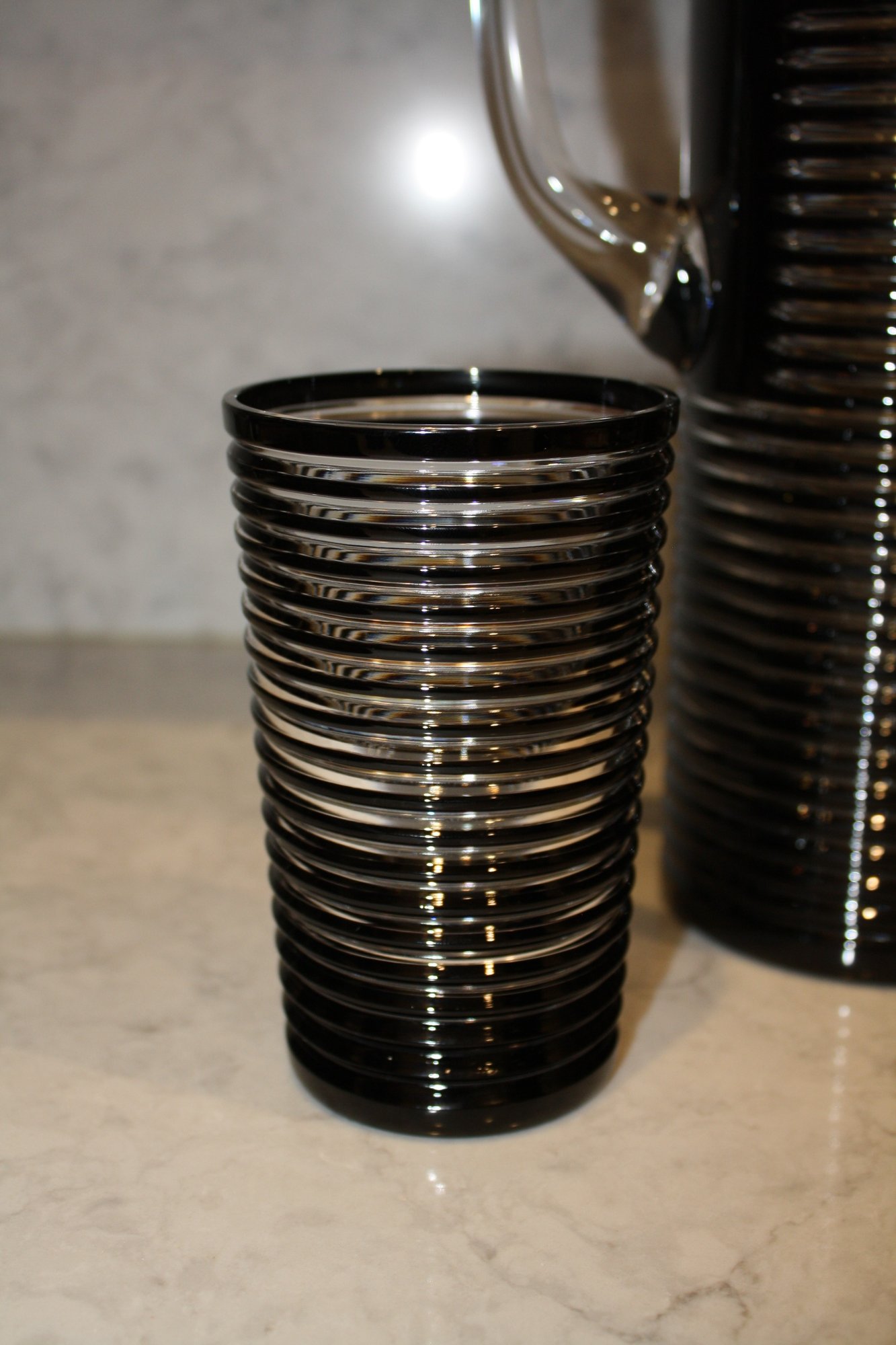 ajka crystal Mid-Century Modern onyx black cut to clear pitcher and glasses set rareapproximately 13 inches in height and tumblers measuring approximately 5.4 inches in height