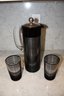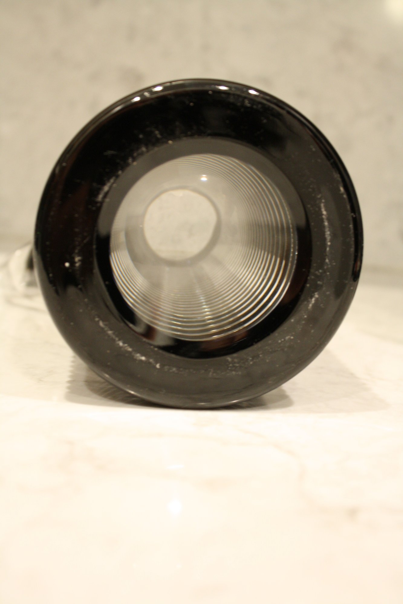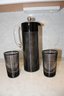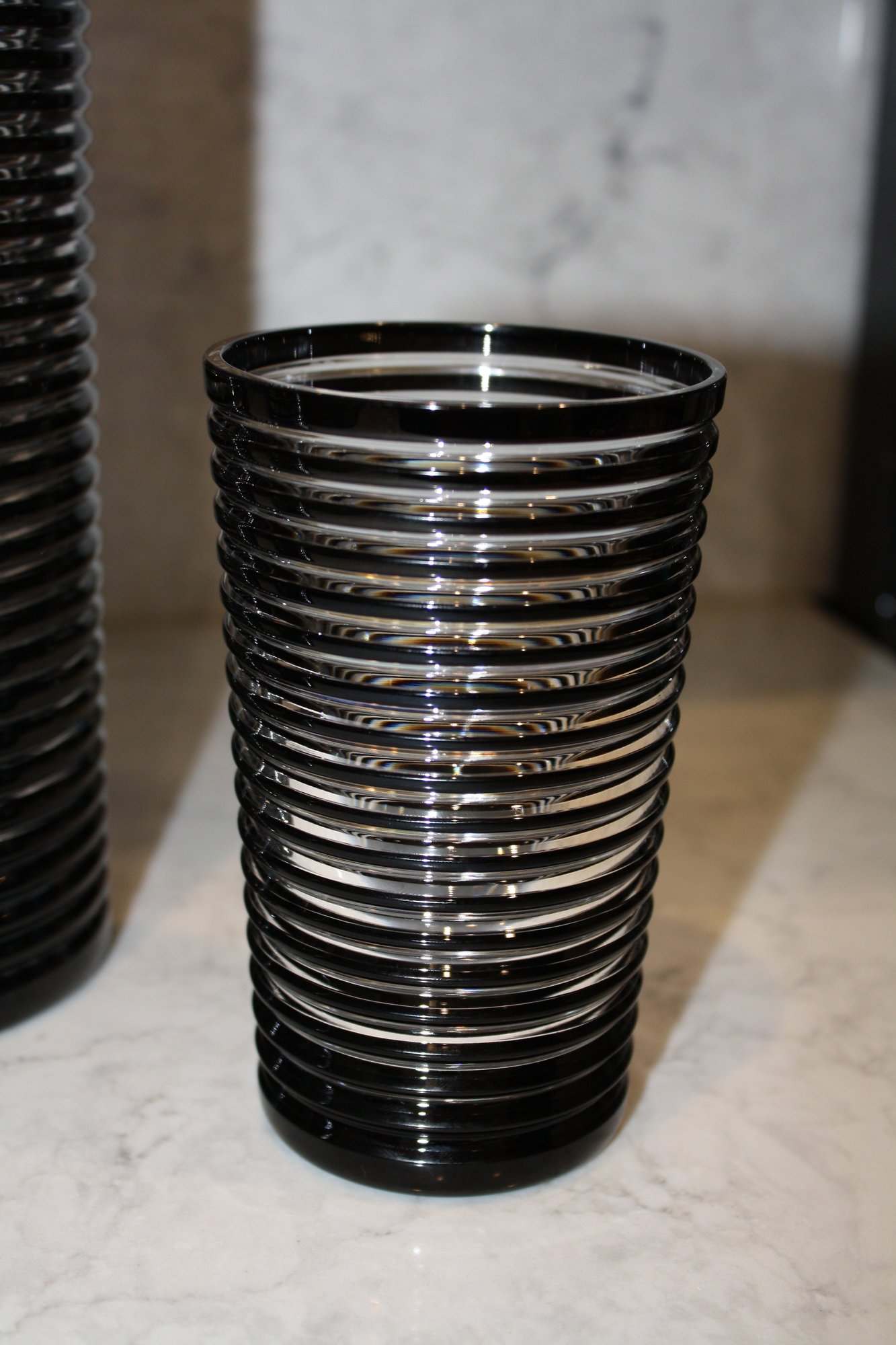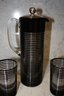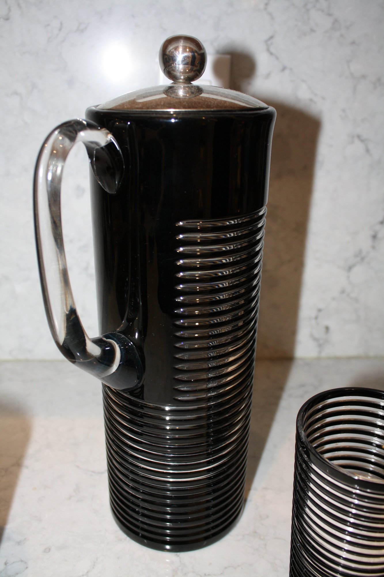 ajka crystal Mid-Century Modern onyx black cut to clear pitcher and glasses set rareapproximately 13 inches in height and tumblers measuring approximately 5.4 inches in height