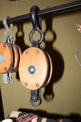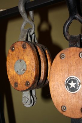 Pair of antique block and tackle pulleys by Boston & Lockport Block Co., featuring wooden shells, metal hardware, and hooks. Right pulley displays the company’s signature star logo. Originally used for ship rigging or lifting heavy loads in agricultural and industrial settings, now valued as rustic or industrial decorative accents for homes, offices, or nautical-themed spaces.