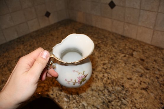 Antique ceramic creamer featuring a white body adorned with delicate pink floral patterns and gold gilding on the rim and handle. The piece showcases a small, elegant pitcher shape, typically 3–5 inches tall, combining classic decorative design with collectible ceramic craftsmanship.
