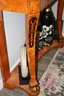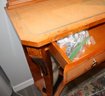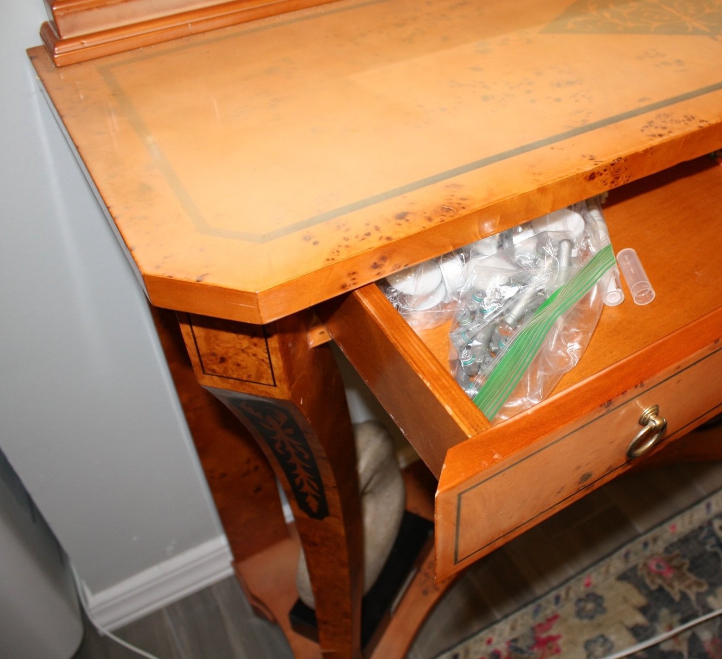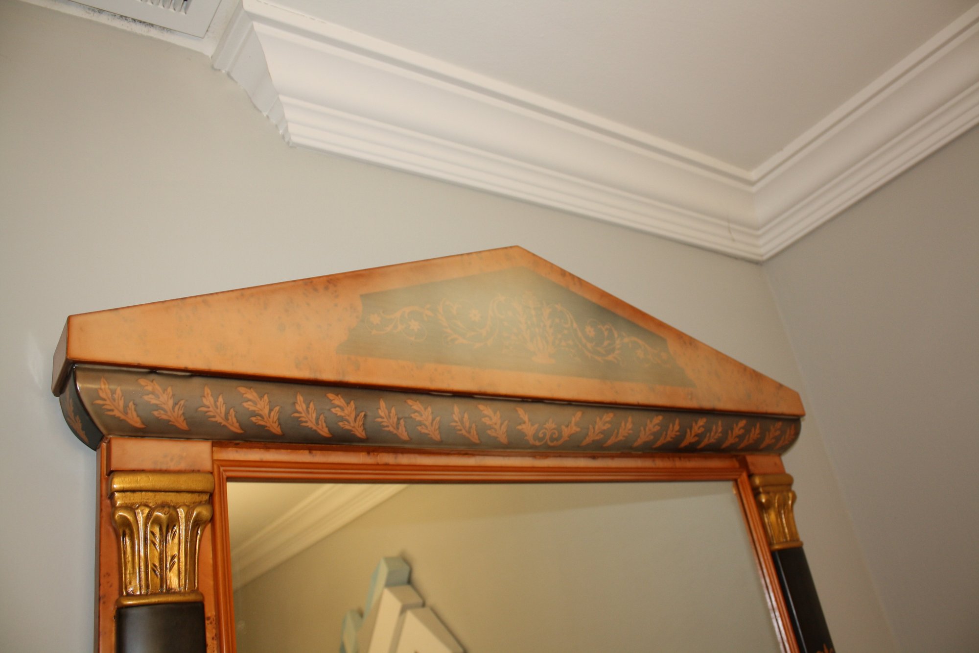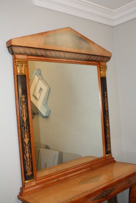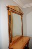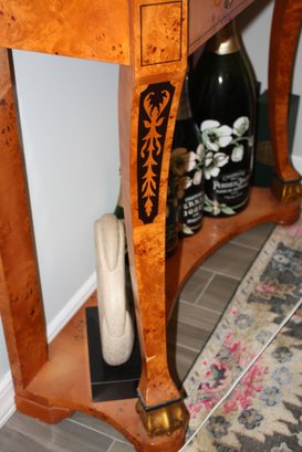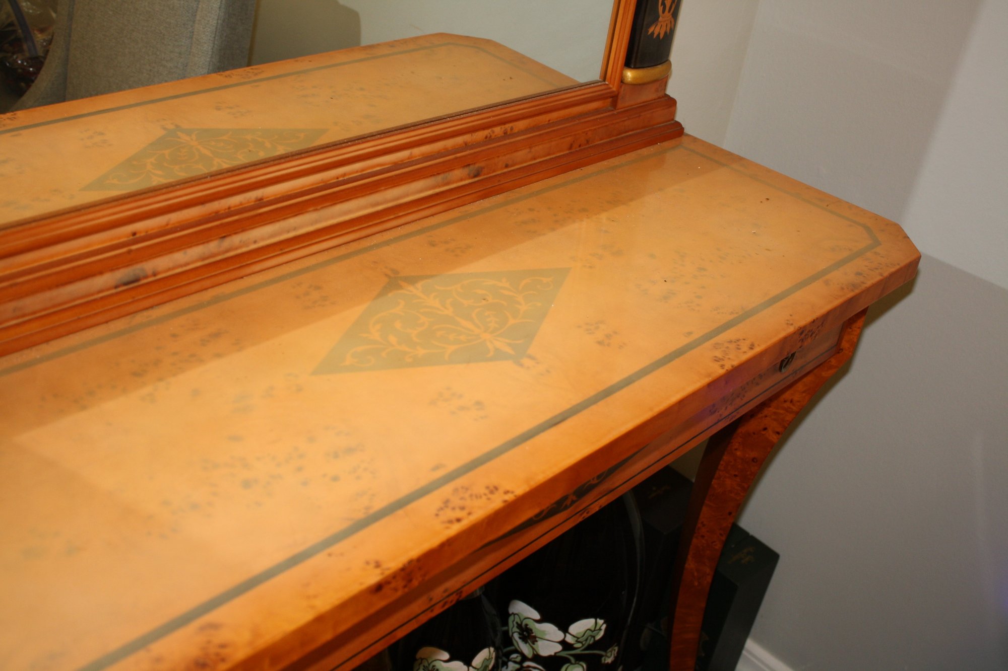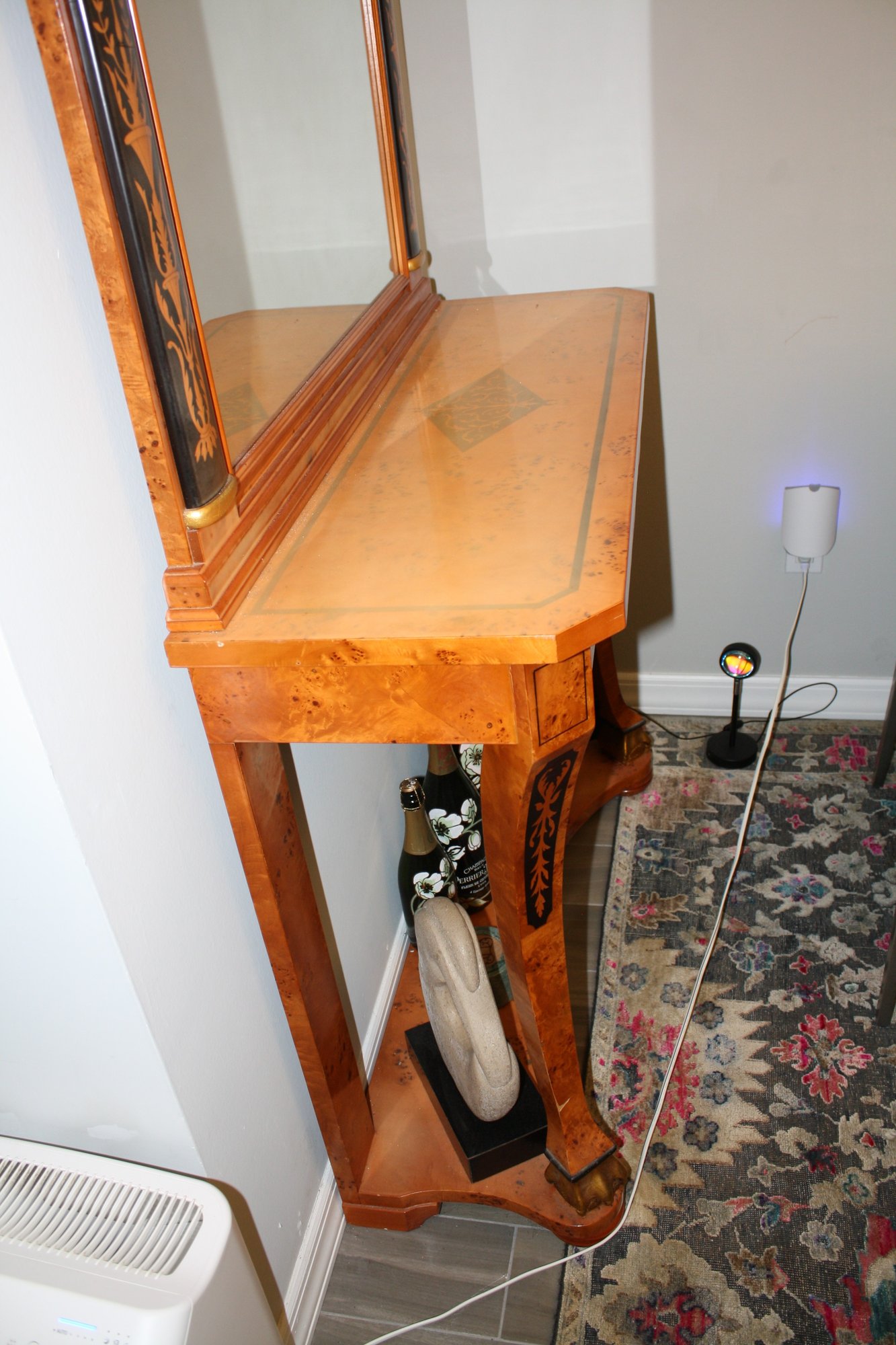 Antique Italian Console Table & Mirror Set Sun Faded handmade marquetry Inlaid exotic look amazing refinished approximately 82 inches high (shelf 36 inches), 41 inches wide, and 15 inches deep, making it suitable as a statement entryway or hallway centerpiece.