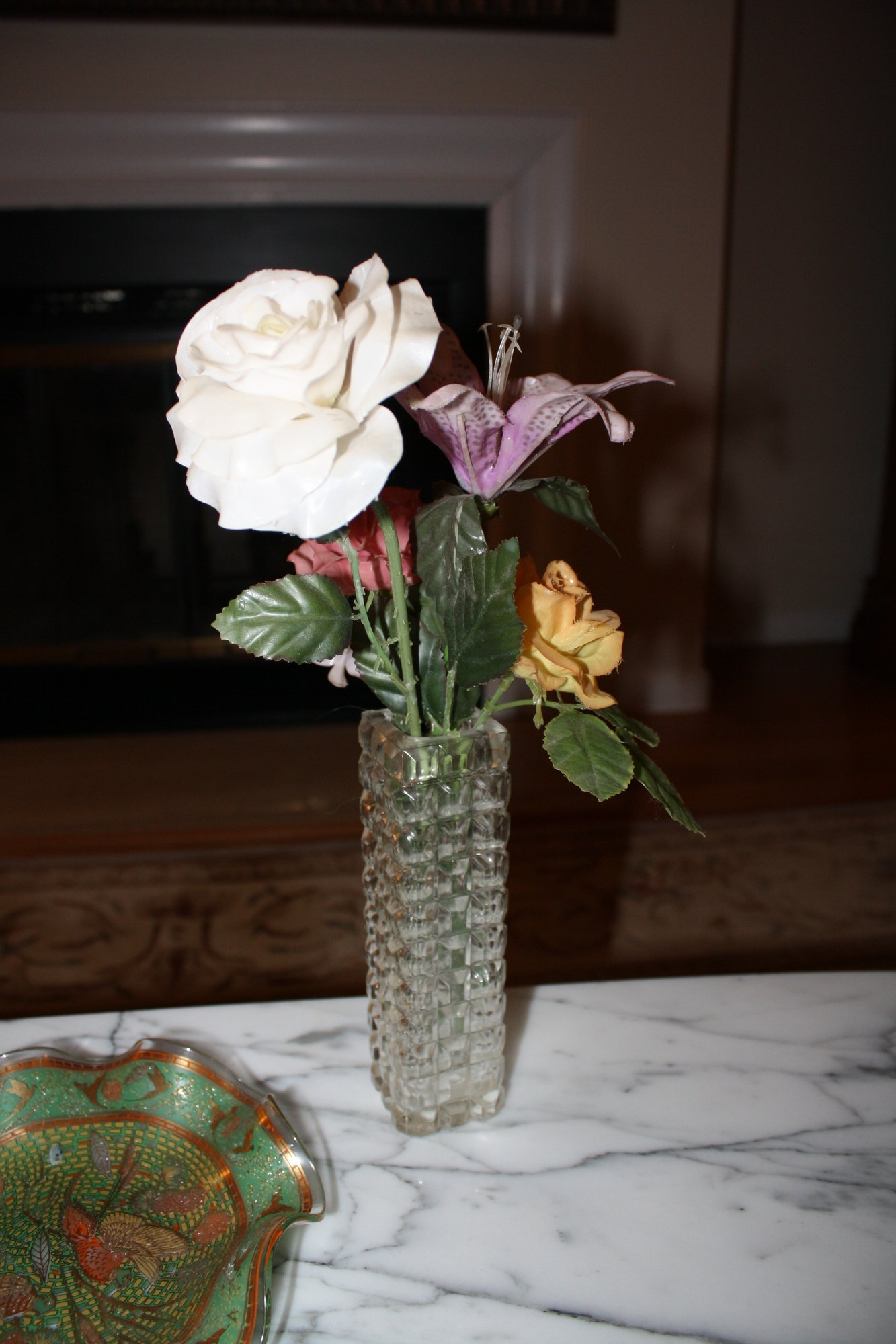 Decorative artificial floral arrangement featuring a prominent white rose and purple lily accented by mixed faux greenery, displayed in a clear textured glass vase. The arrangement combines layered petals, realistic leaf detailing, and varied bloom heights within a transparent patterned vessel that enhances the visual depth and presentation of the florals.