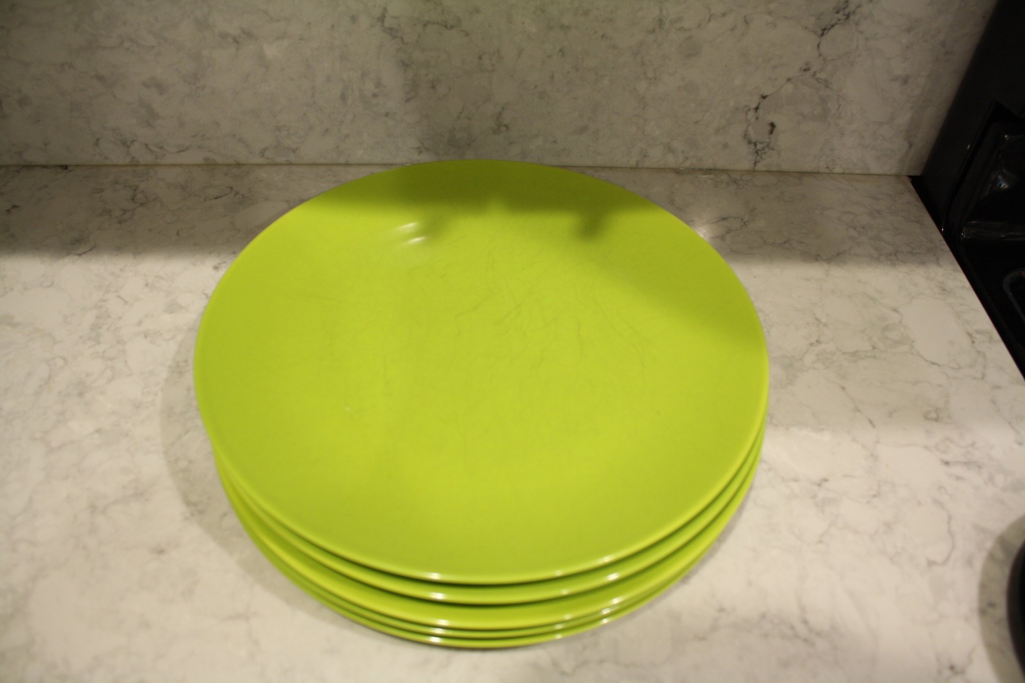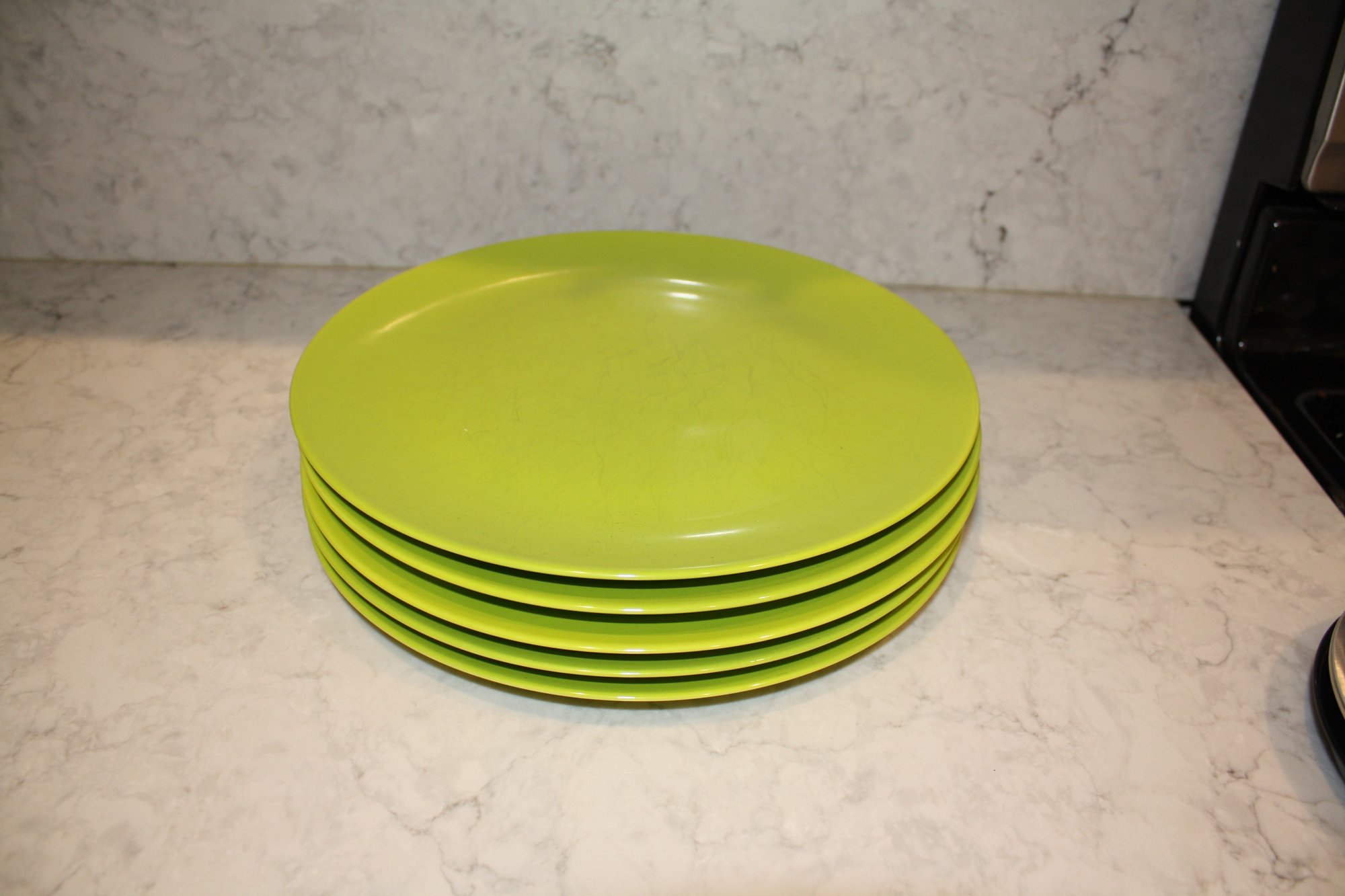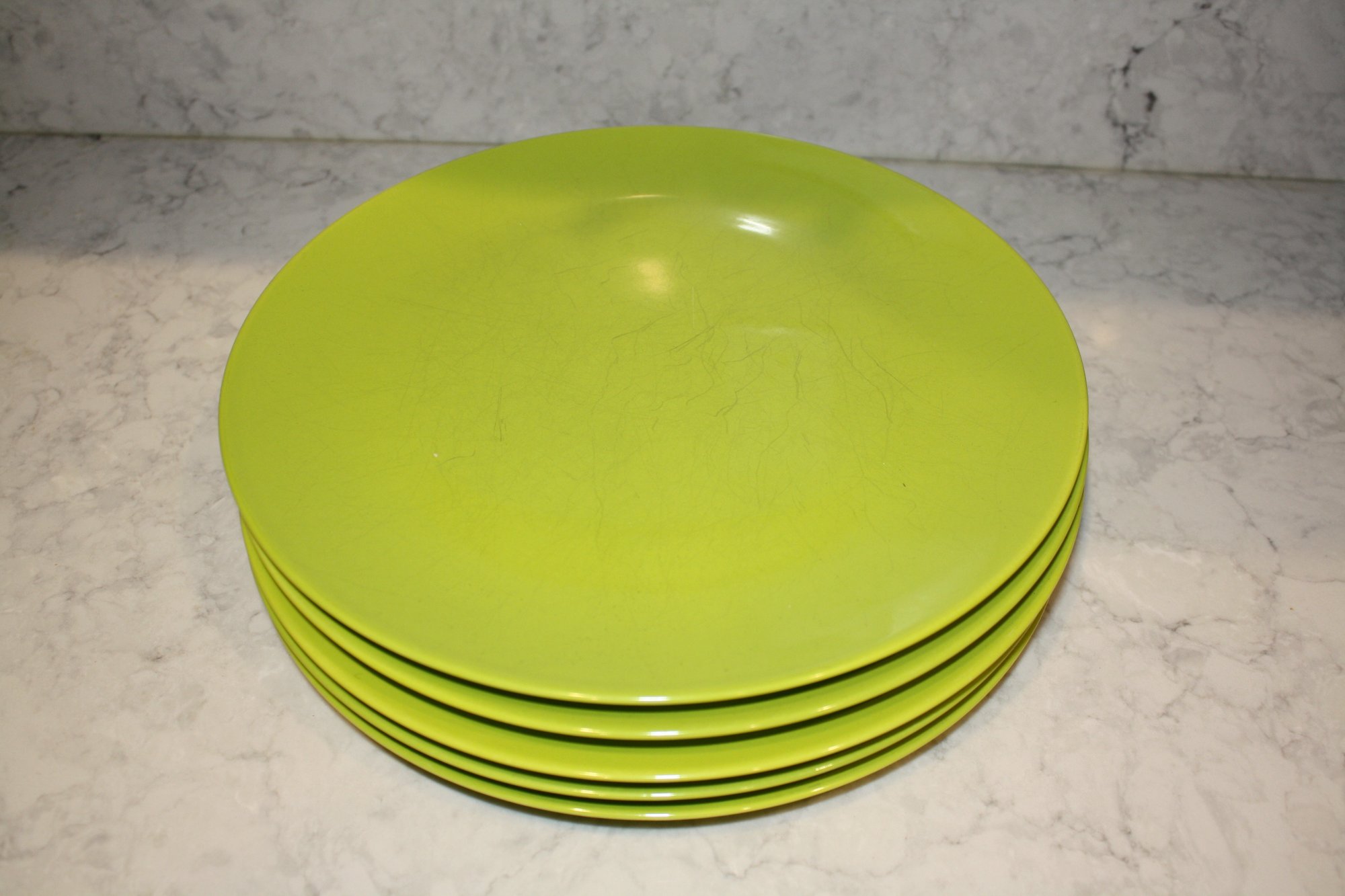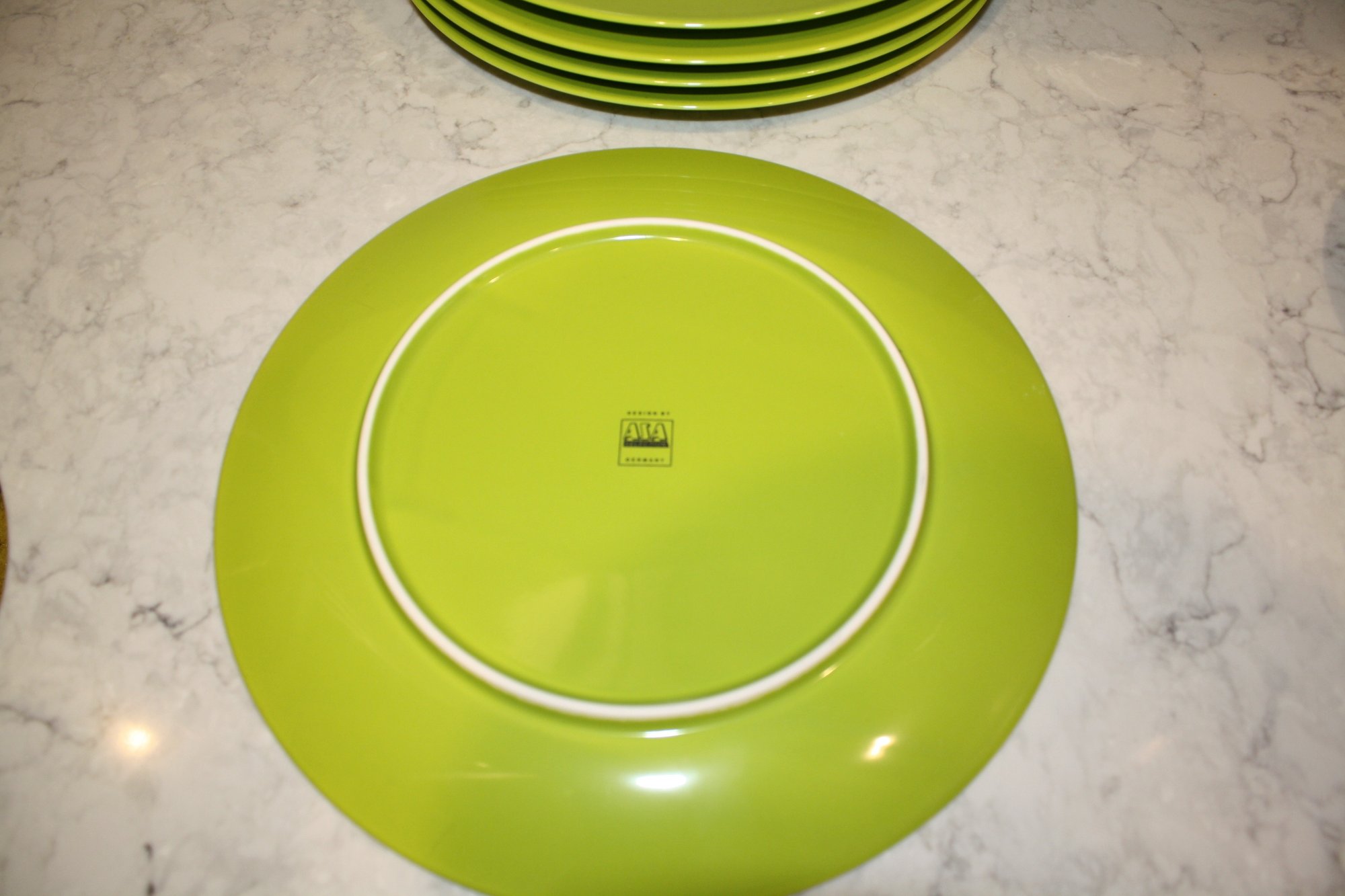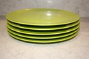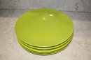 Set of 5 ASA Selection ceramic plates in a lime green finish, designed in Germany with a modern minimalist aesthetic, each approximately 11 inches in diameter, suitable for dining, serving, and contemporary table presentation