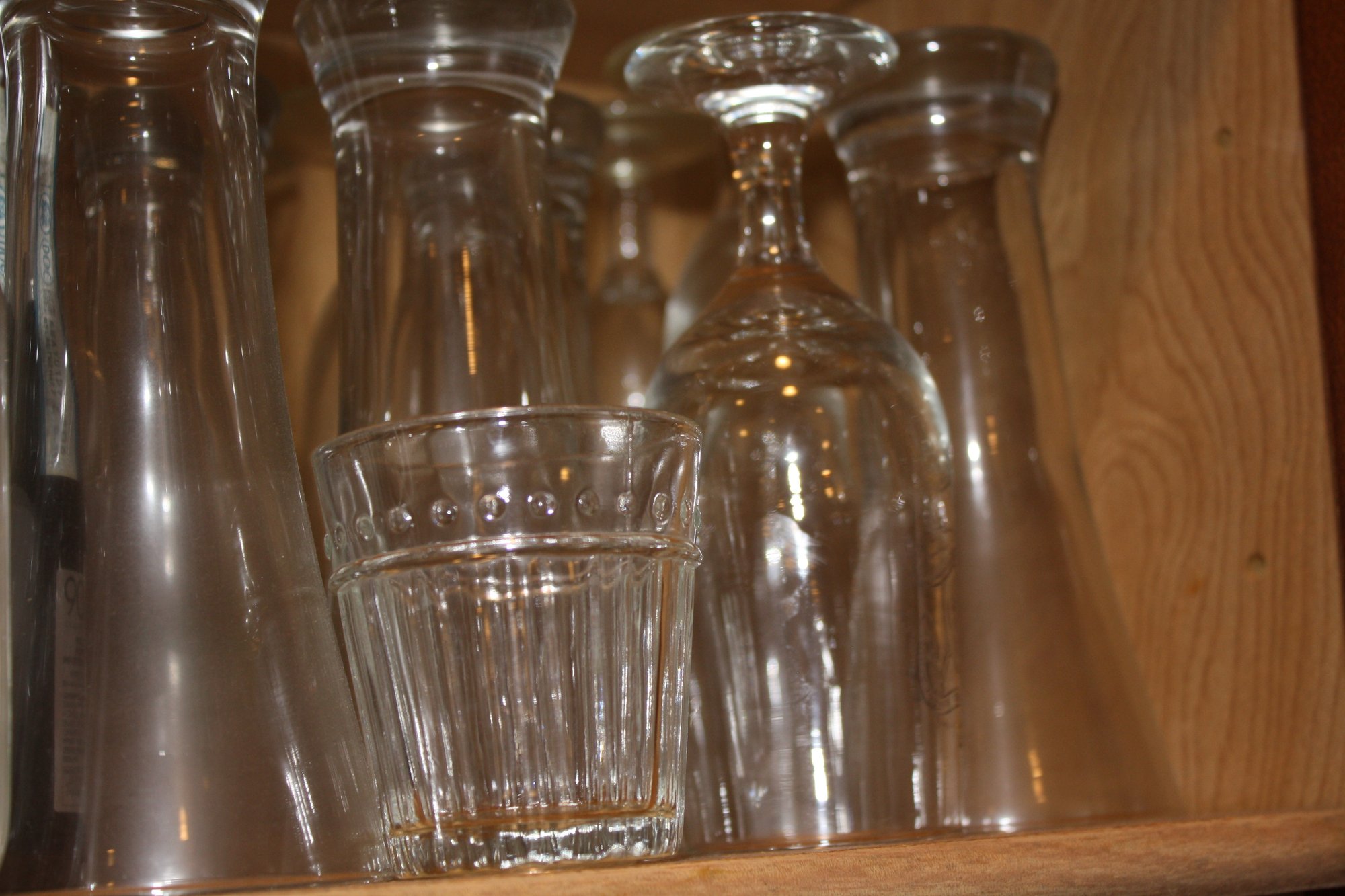 Collection of assorted glassware and a white ceramic mug stored in a kitchen cabinet, including various styles of drinking glasses crafted from materials such as art glass, Depression glass, or Carnival glass. The glassware features delicate rims and varied shapes, with careful storage practices recommended to protect fragile edges and maintain clarity and shine over time.