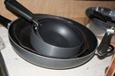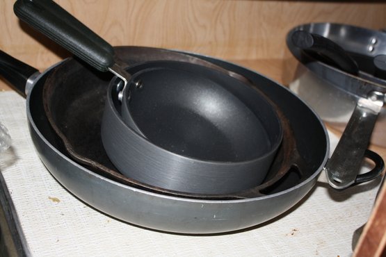 Collection of non-stick frying pans featuring durable coated cooking surfaces with heat-resistant handles, designed for even heat distribution and easy food release, available in various sizes and compatible with stovetop cooking.