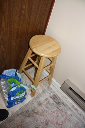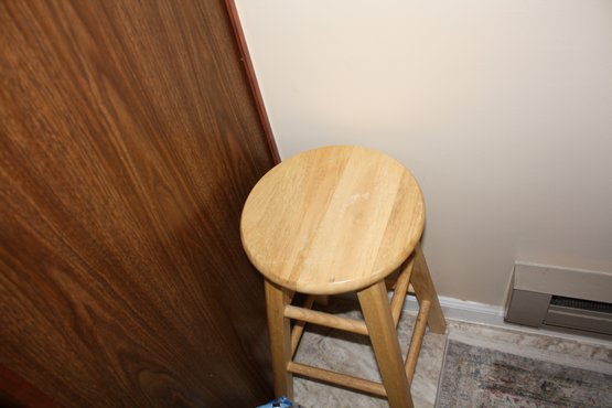 Natural wood bar stool featuring a round seat and backless design, constructed with four straight legs connected by horizontal support rungs that form a stable base, showcasing a simple solid wood structure with a natural finish and classic stool silhouette.