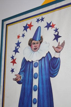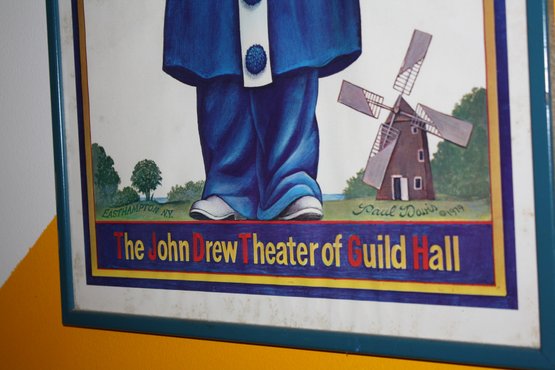 Framed 1979 poster by artist Paul Davis for The John Drew Theater of Guild Hall in East Hampton, NY. Features a character in a blue costume and showcases the theater’s historic venue. Ideal for collectors of theater memorabilia, vintage posters, or Paul Davis artwork.