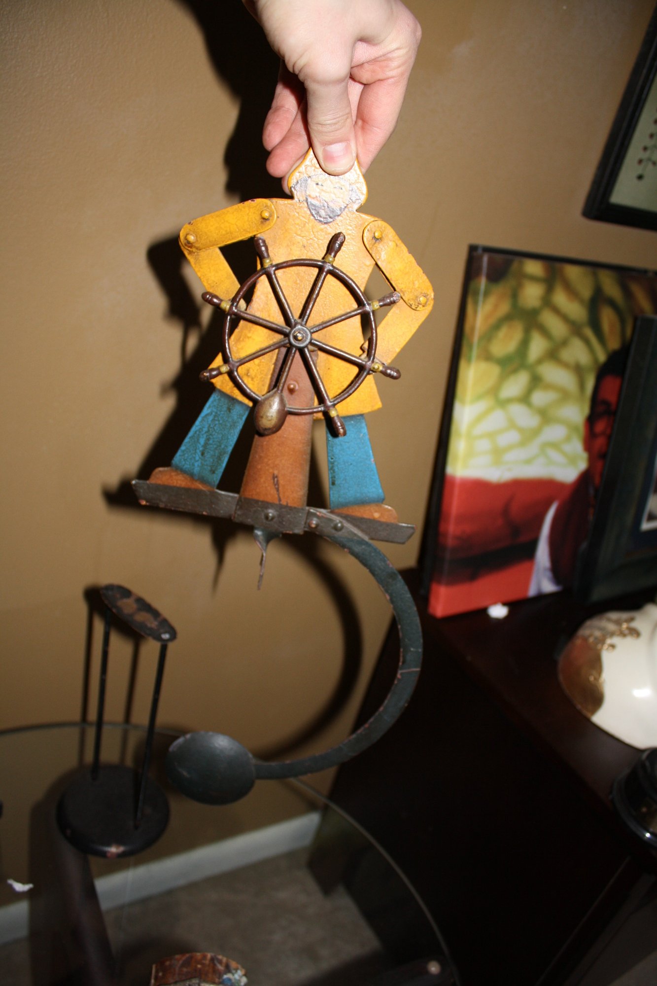 Authentic Models Helmsman Sky Hook featuring a hand-painted metal sailor figure steering a ship’s wheel. This Victorian-inspired balancing kinetic sculpture is designed to balance effortlessly on a shelf or table edge, combining nautical charm with physics-based motion. Measures approximately 20.5" high and weighs around 4.4 lbs, making it both a decorative figurine and a conversation piece.