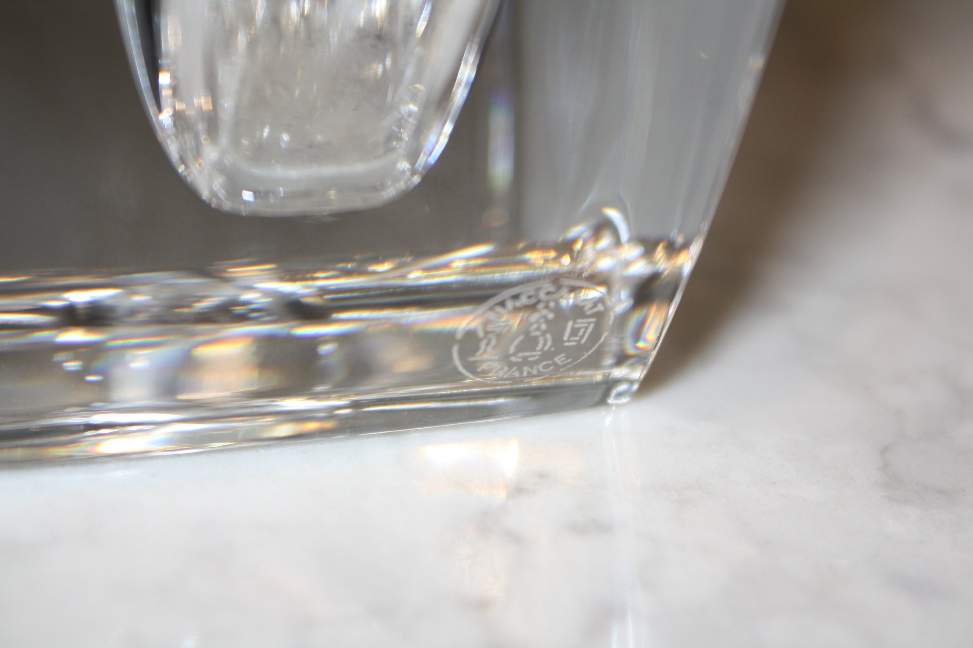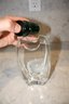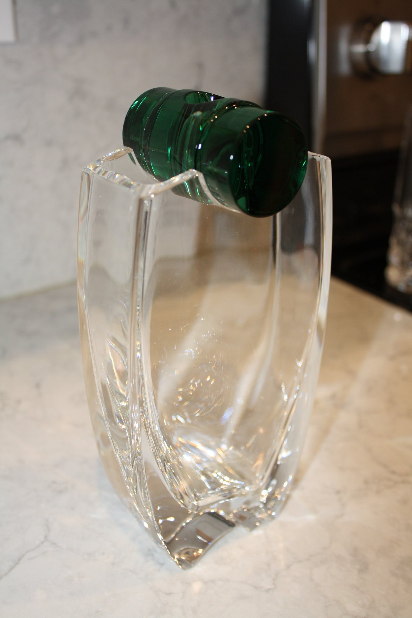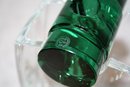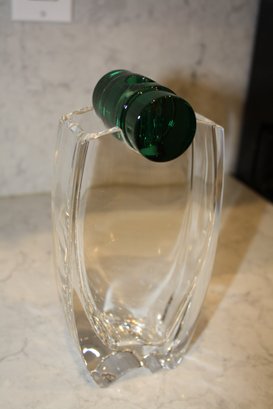 Vintage Baccarat “Oceanie” crystal vase designed by Thomas Bastide, featuring a clear crystal body with a removable green glass central rod stem holder, produced in France during the late 20th century and designed for elegant floral display, 2" in length, 3.7" wide, 7.7" tall