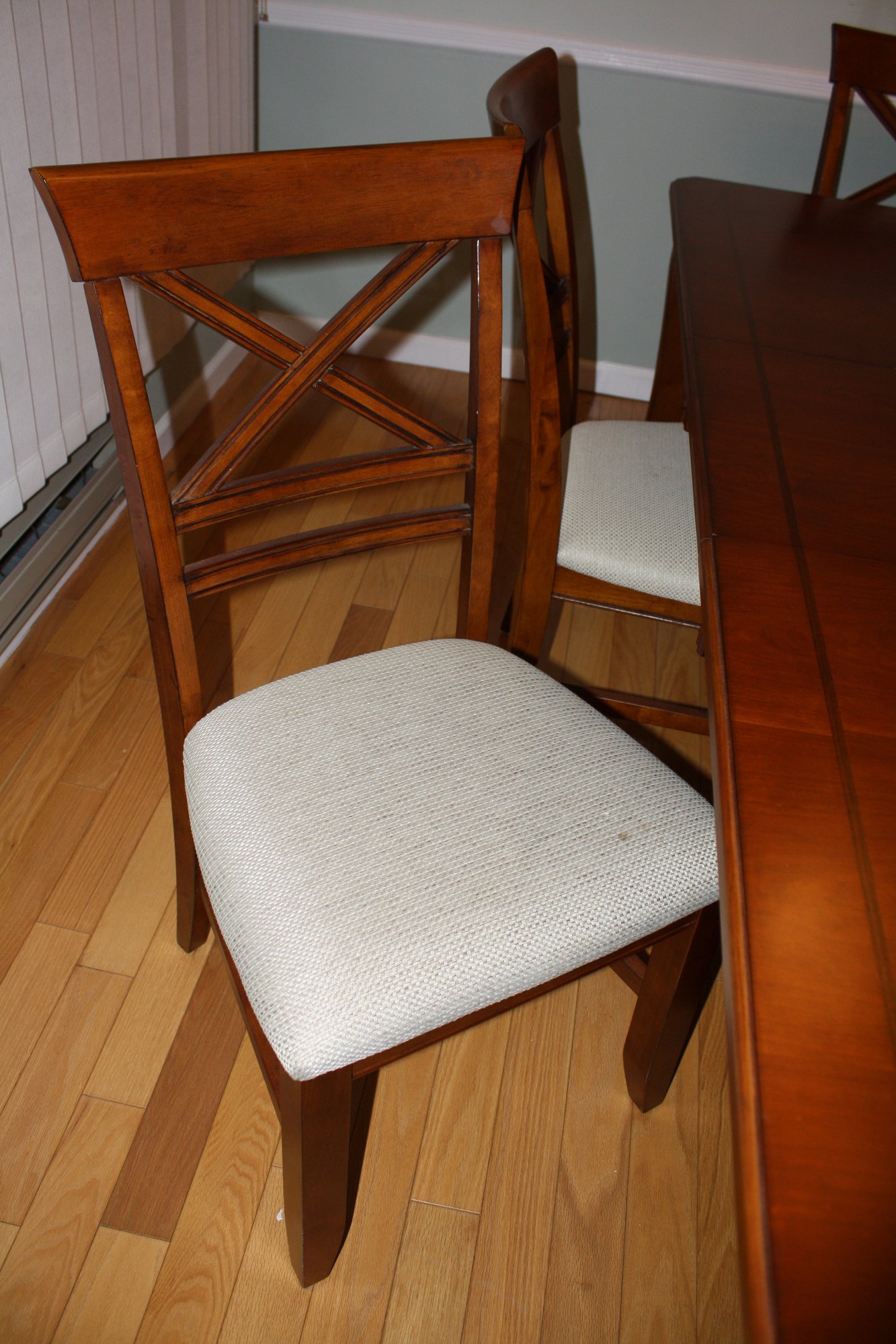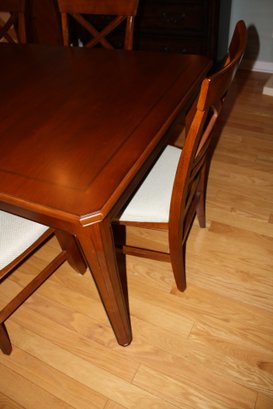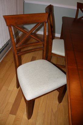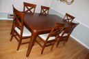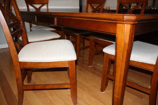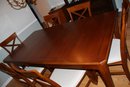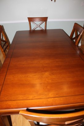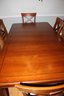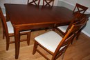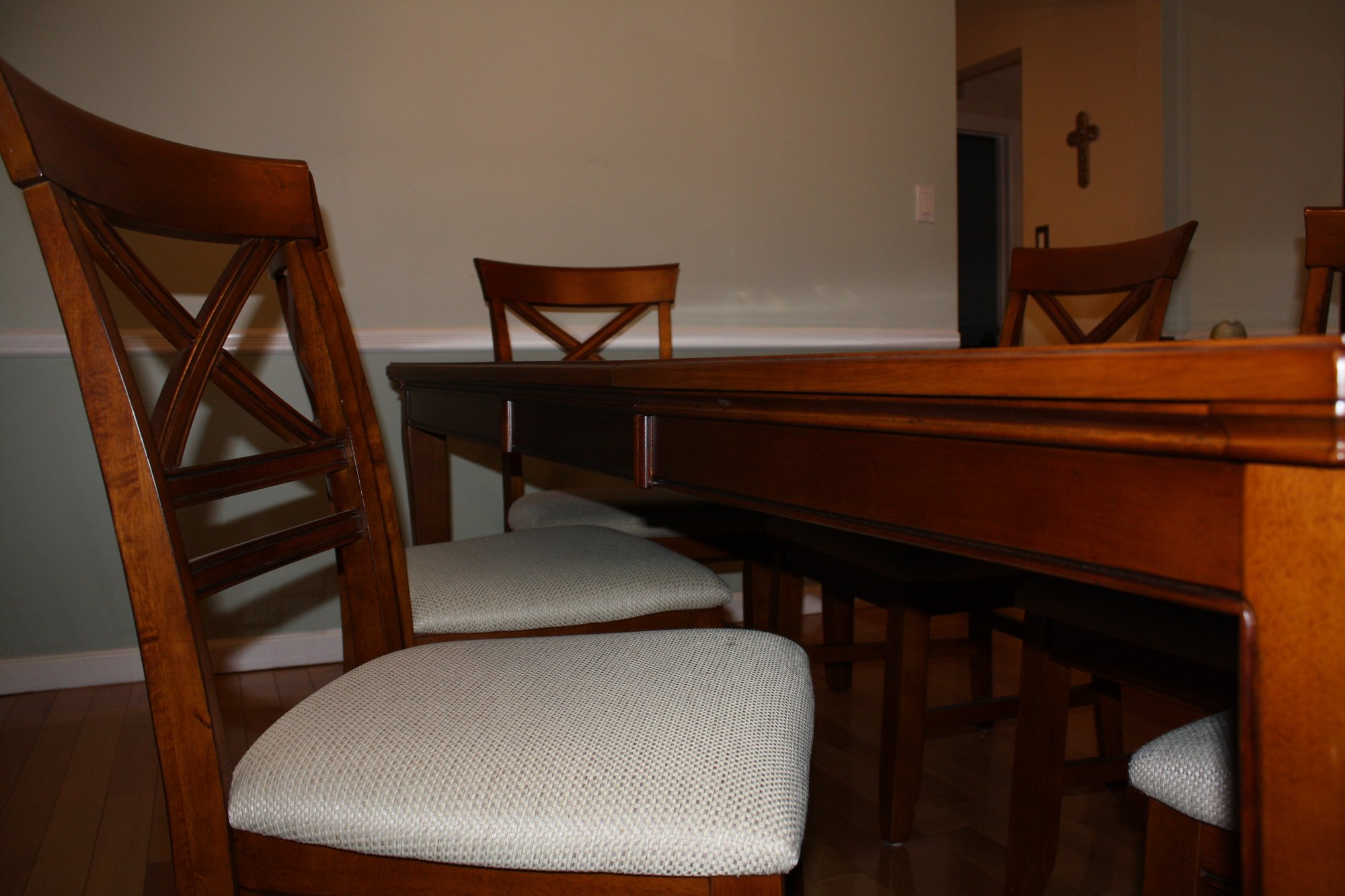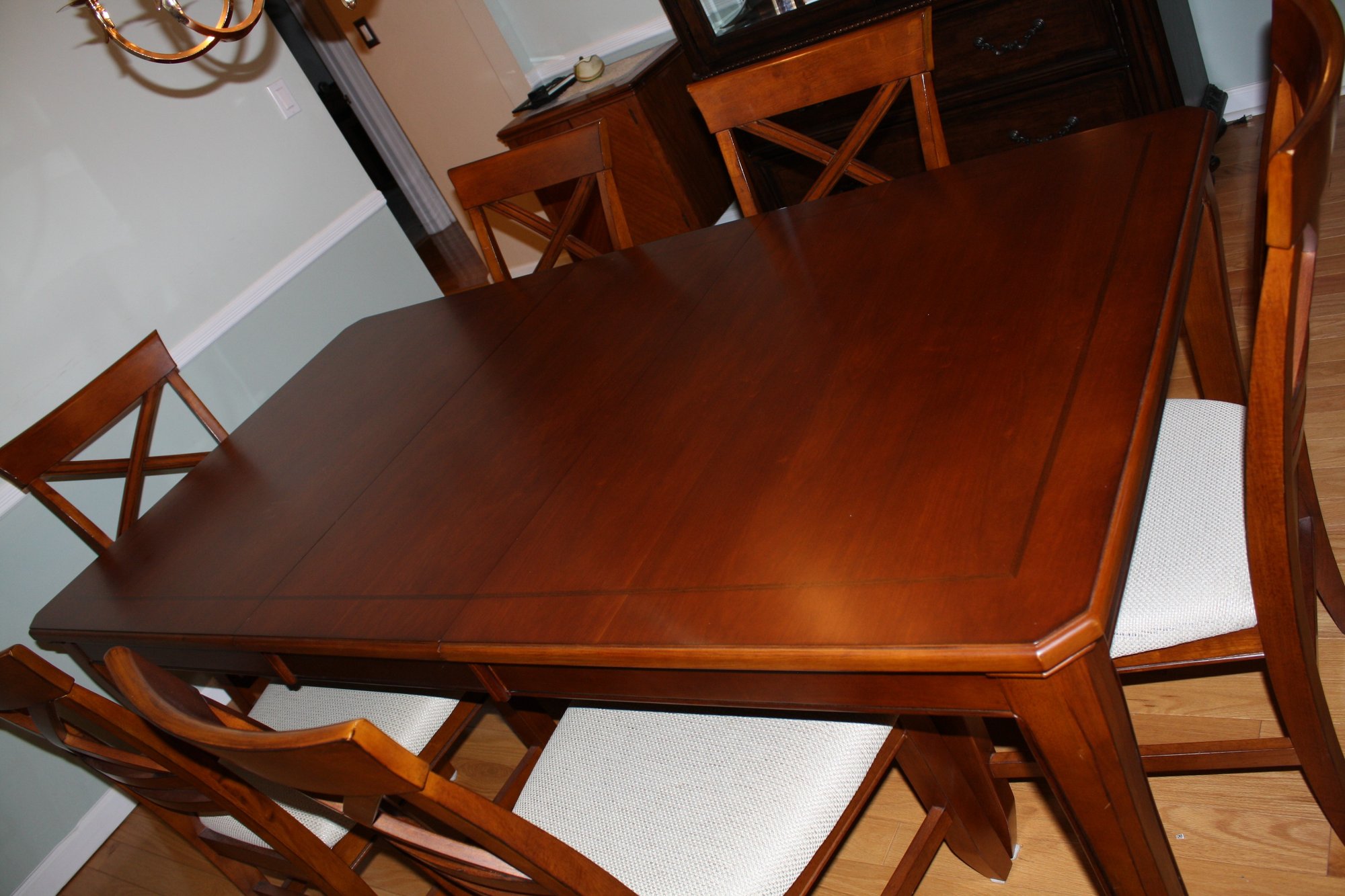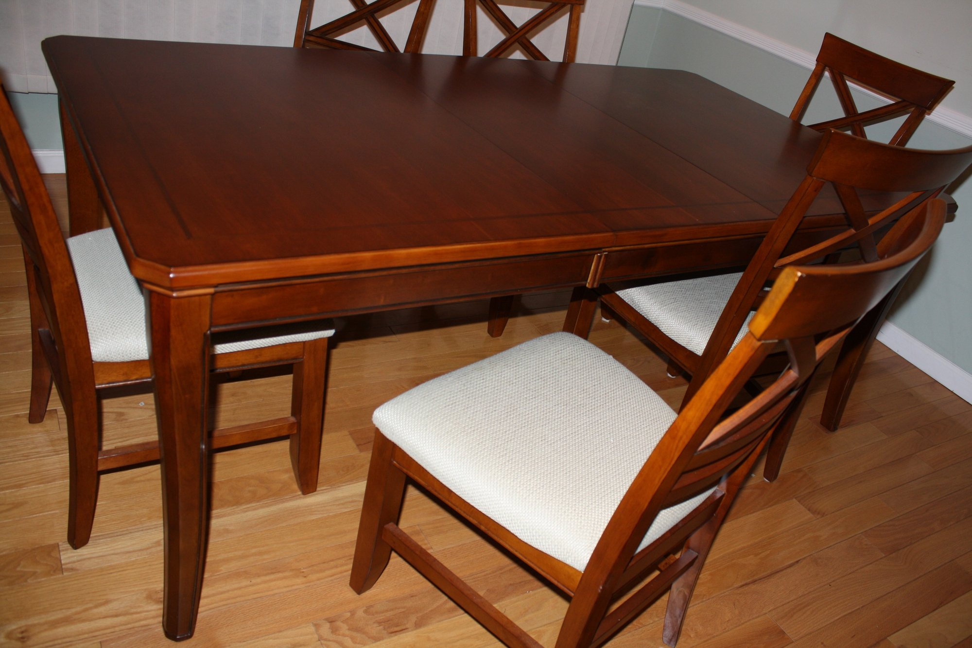 Mahogany rectangular dining table set featuring a solid wood table with a smooth tabletop surface measuring 76 by 41.5 inches and a height of 31 inches with an 18 inch leaf inside. The set includes a matching collection of chairs with detailed wood craftsmanship, classic lines, and a rich mahogany finish, showcasing a cohesive traditional design suitable for a formal dining space.