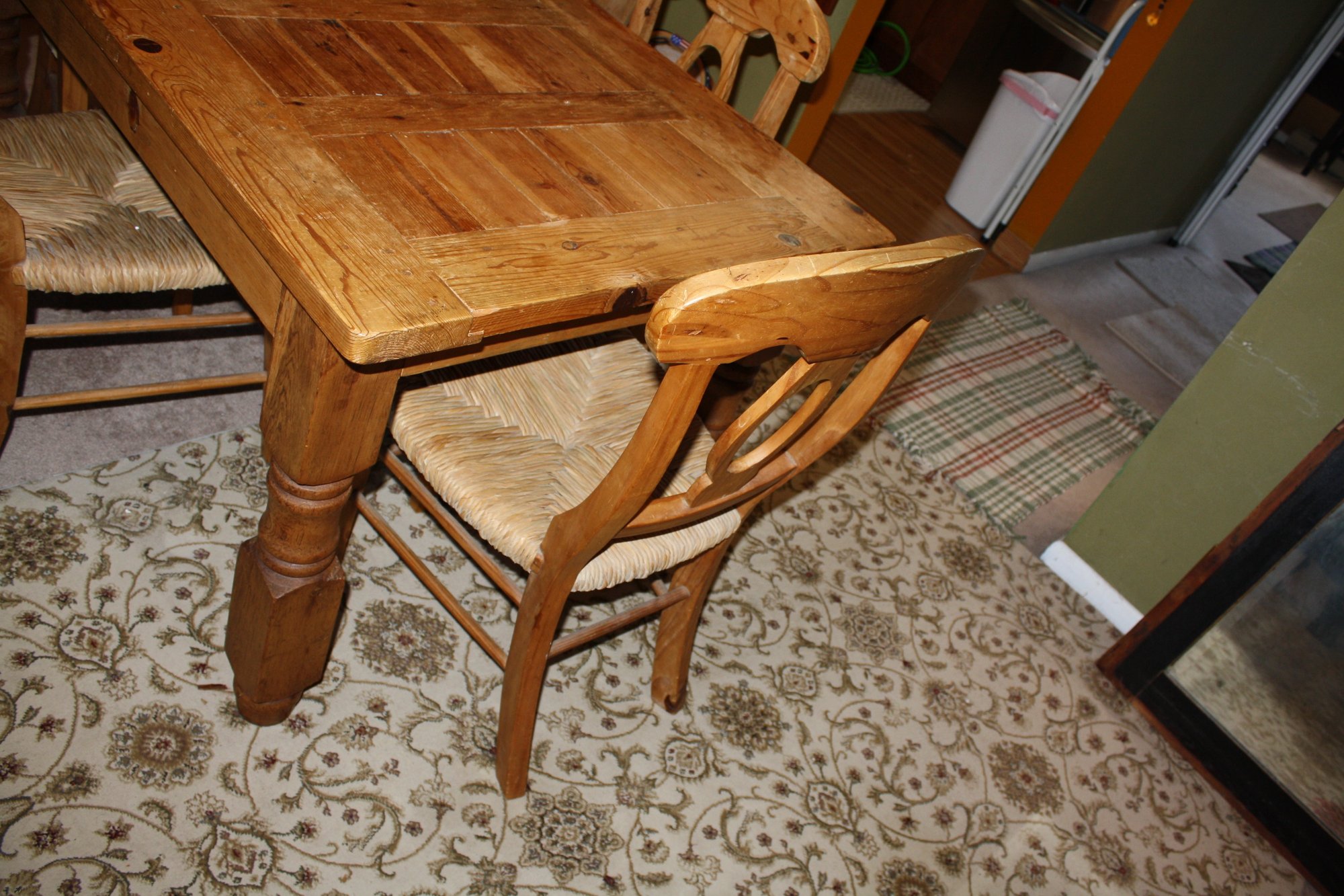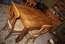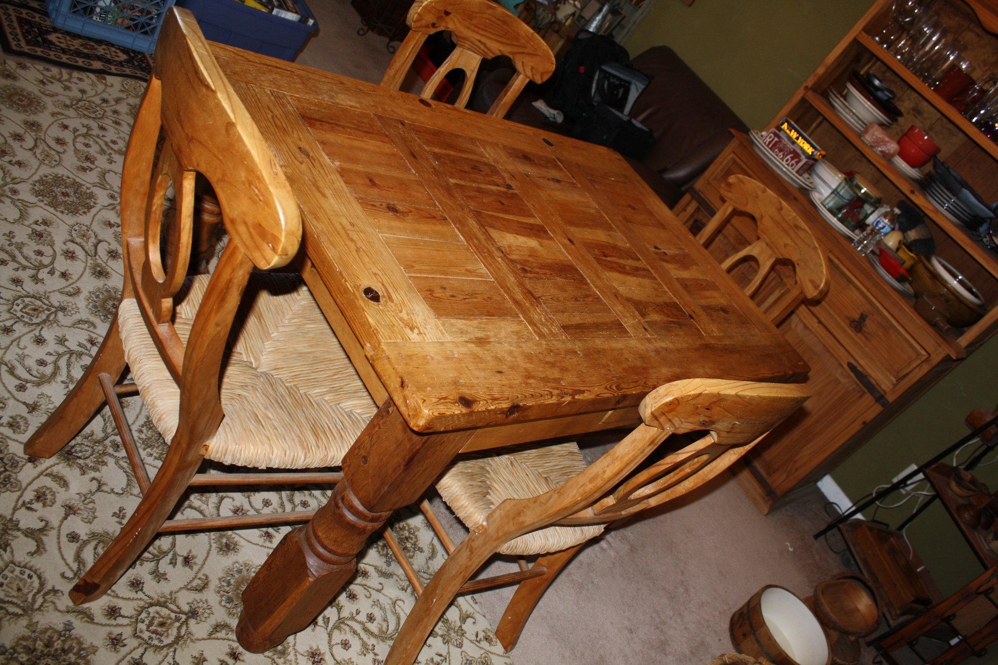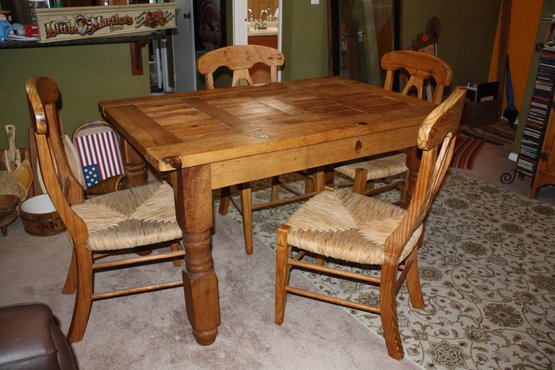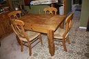 Sturdy rustic-style dining table crafted from solid pine, measuring 54" wide, 35" long, and 31" high. Features a durable construction with a classic farmhouse aesthetic, ideal for kitchens, dining rooms, or casual rustic home settings. Perfect for everyday use or as a charming centerpiece for rustic décor.