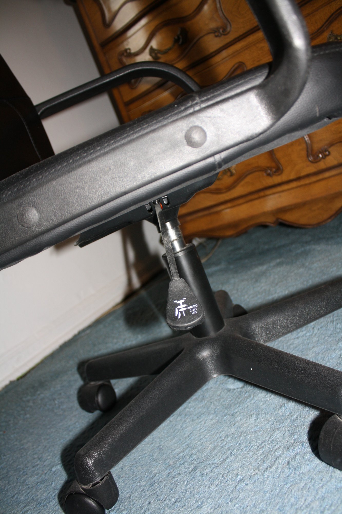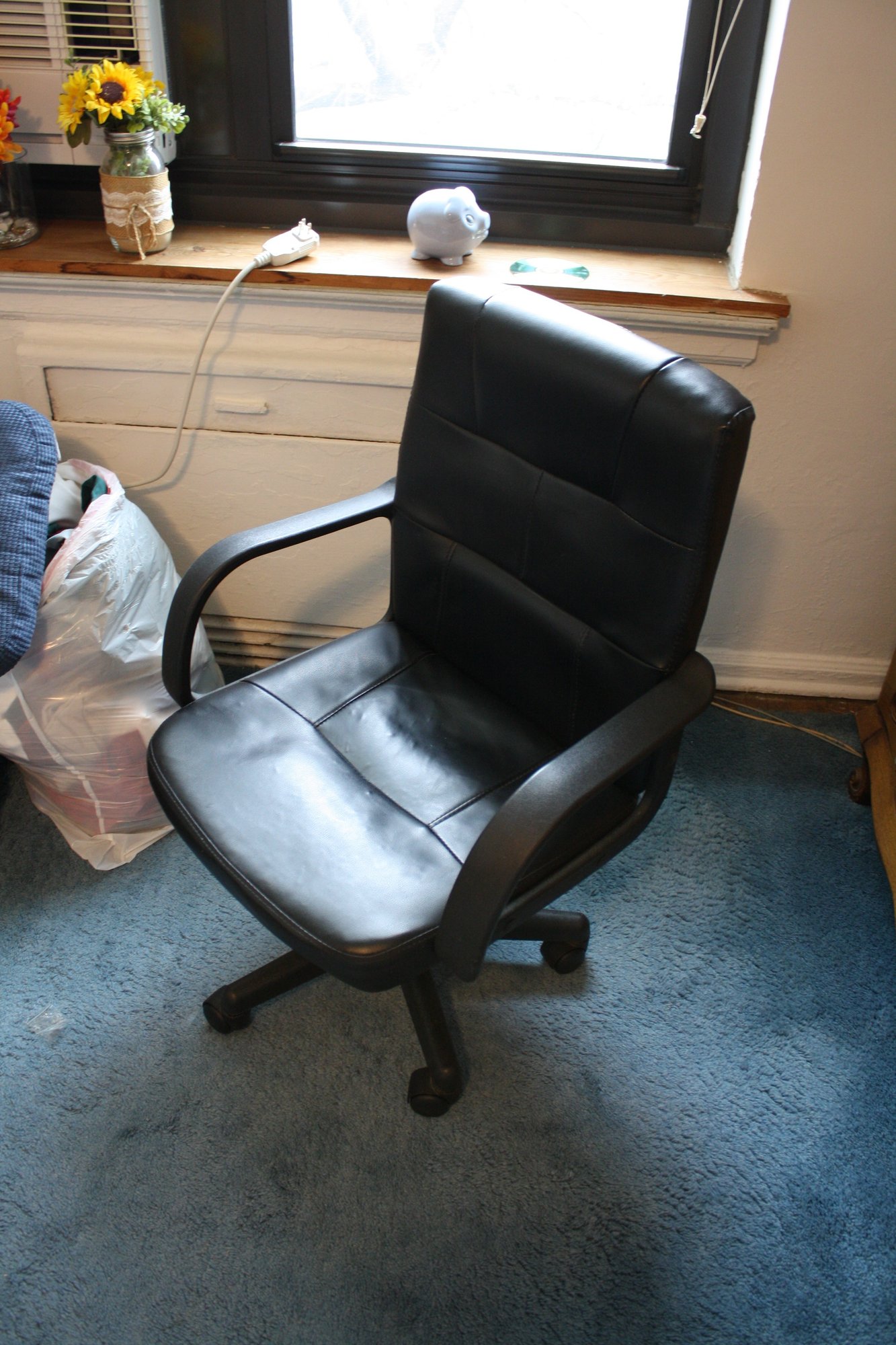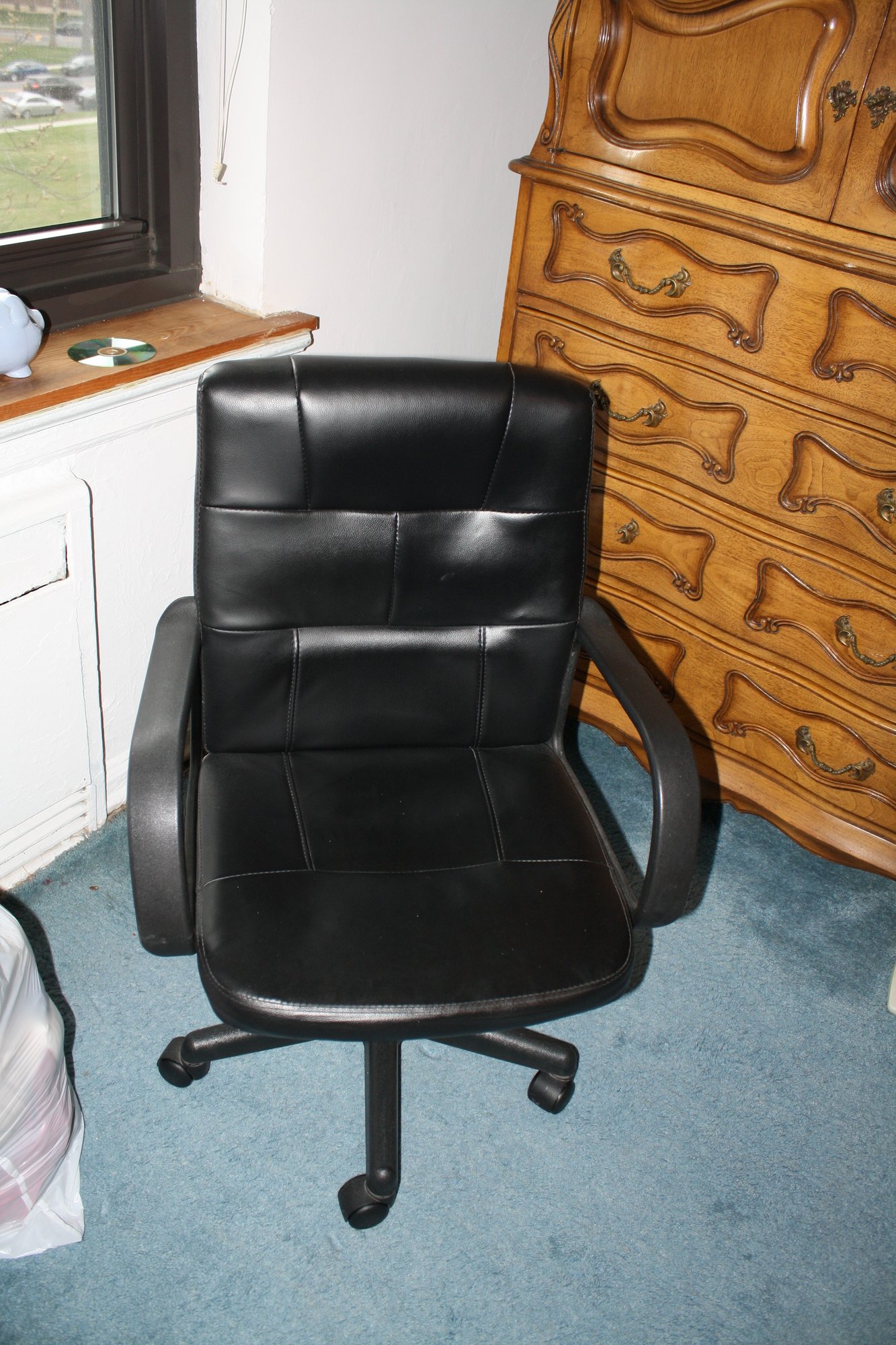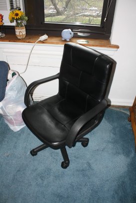 Black faux leather executive office chair featuring a high backrest, padded armrests, pneumatic height adjustment lever, and five-star wheeled base for mobility, designed for comfortable office or desk seating.