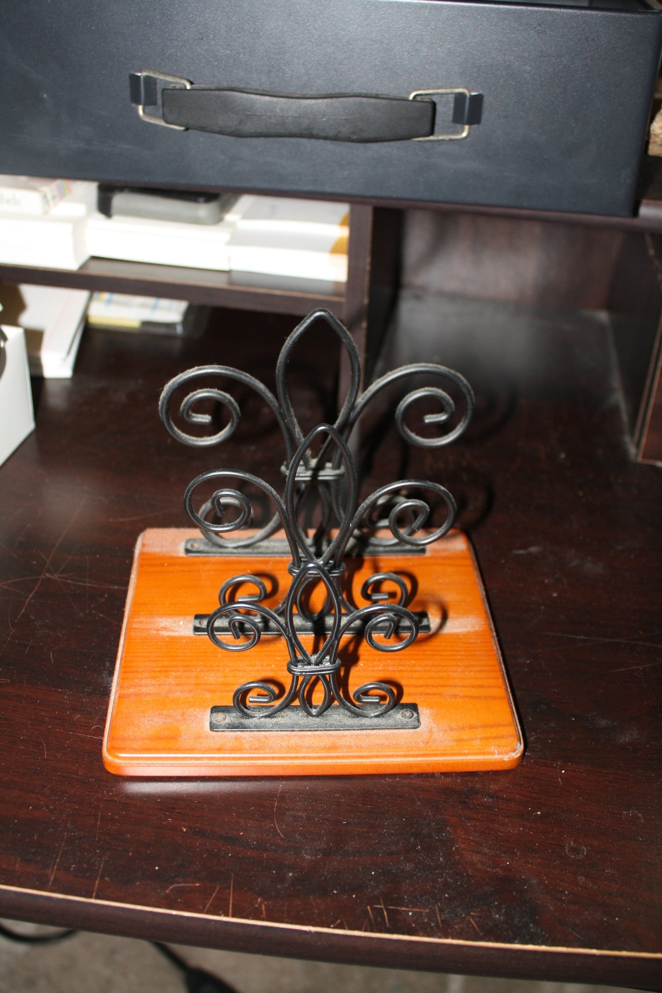 This black metal napkin holder features an elegant scroll design with a sturdy wooden base, ideal for holding napkins on kitchen counters, dining tables, or picnic setups. Combines decorative style with practical functionality.