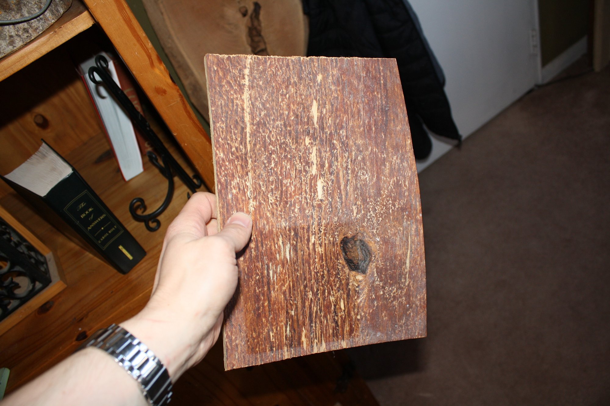 Piece of Black Palm wood (Borassus flabellifer), a dense monocot with characteristic dark fibers embedded in a lighter matrix, creating a unique speckled appearance. Extremely hard, especially on the outer ring, making it ideal for specialized woodworking projects such as knife scales, small decorative items, or artisan craftwork. Distinctive and durable, perfect for collectors or woodworking enthusiasts.