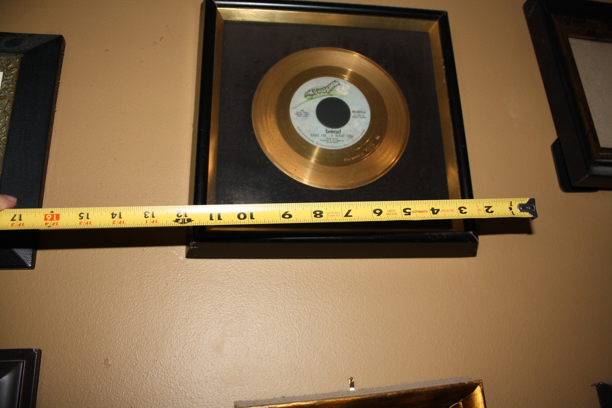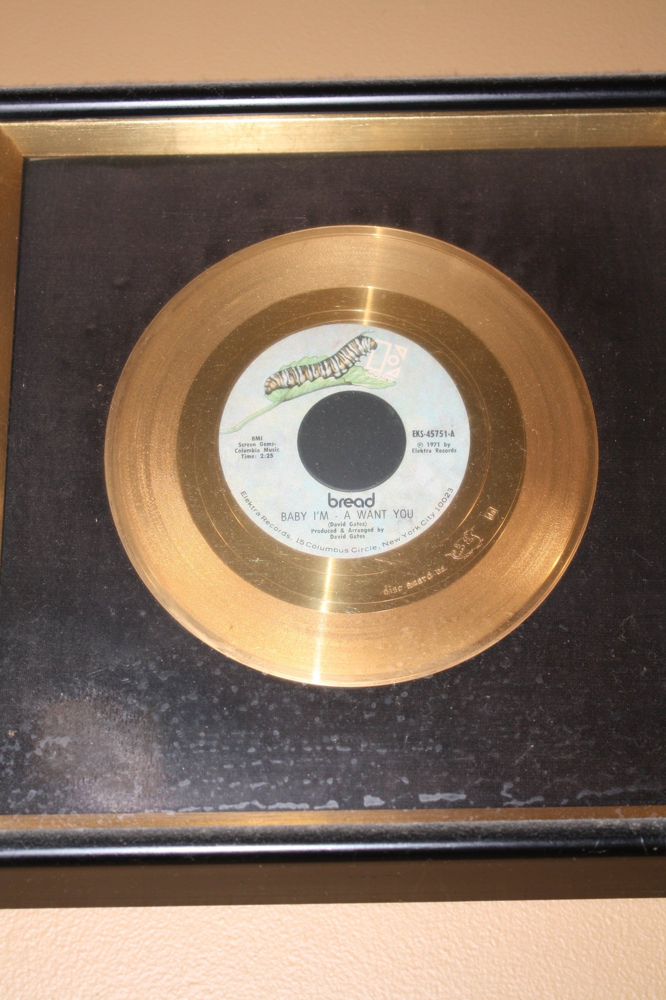This vintage 1971 gold-colored 7-inch vinyl 45 RPM single features the song "Baby I'm-a Want You" by the band Bread, released on Elektra Records. Measuring approximately 12 inches in display width, it is a collectible piece for vinyl enthusiasts and fans of classic 1970s soft rock.