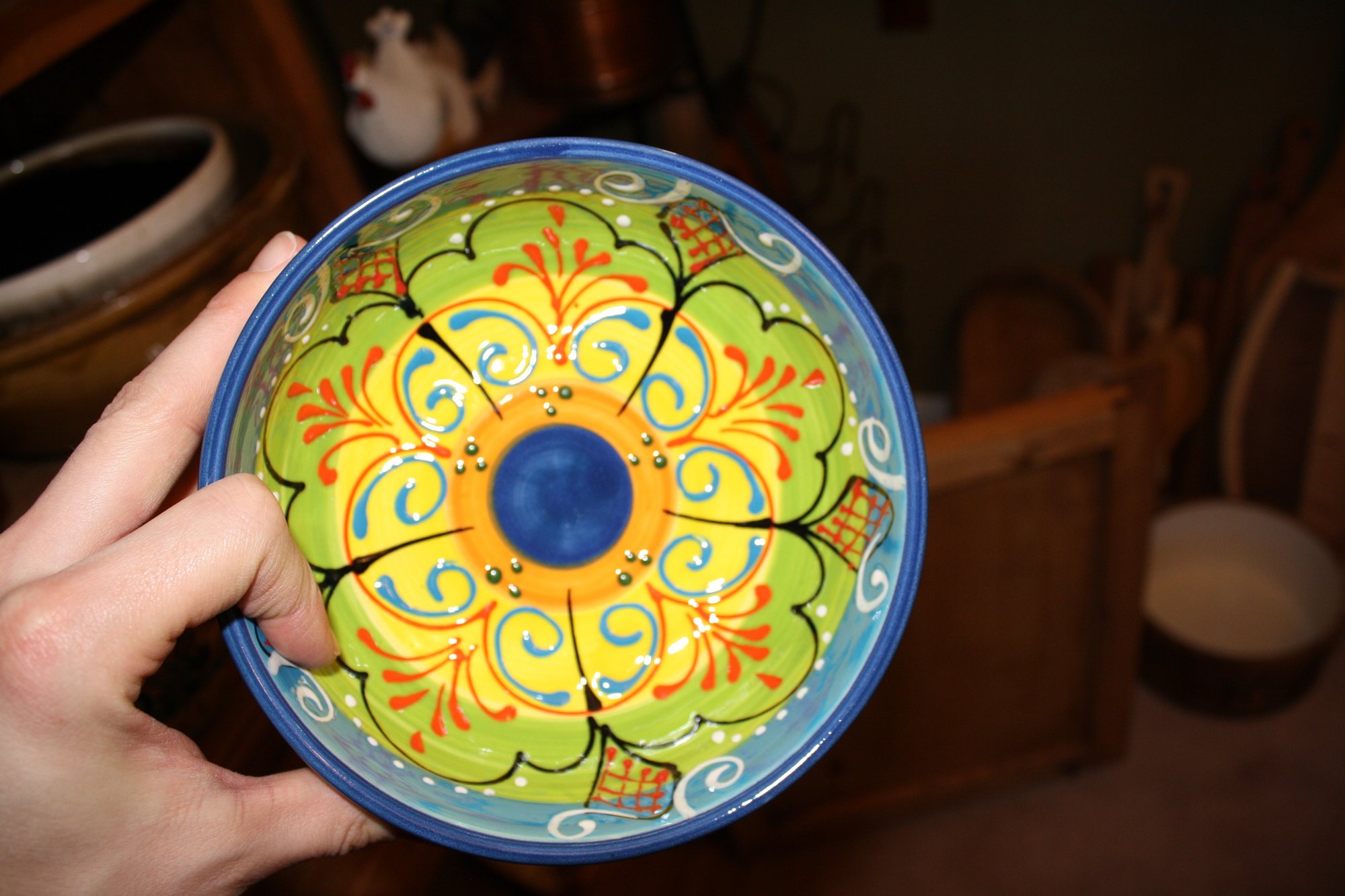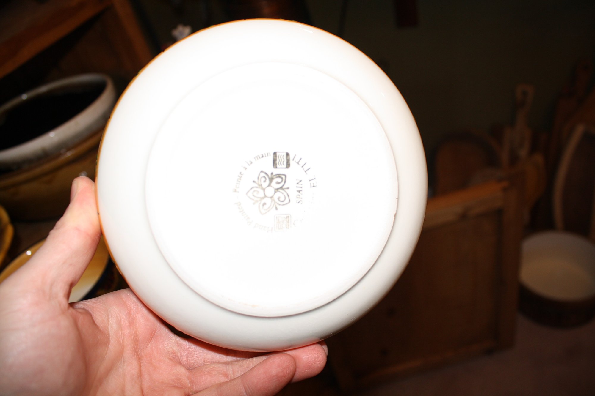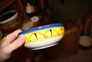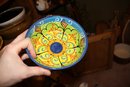 Handcrafted and hand-painted round ceramic bowl by Ceramica El Titi, Spain, approximately 7 inches in diameter. Features vibrant multicolor patterns with raised, embossed details, showcasing traditional Spanish artisan craftsmanship. Ideal for serving tapas, salads, or as a decorative tabletop accent. Collectible piece representing authentic Spanish pottery.