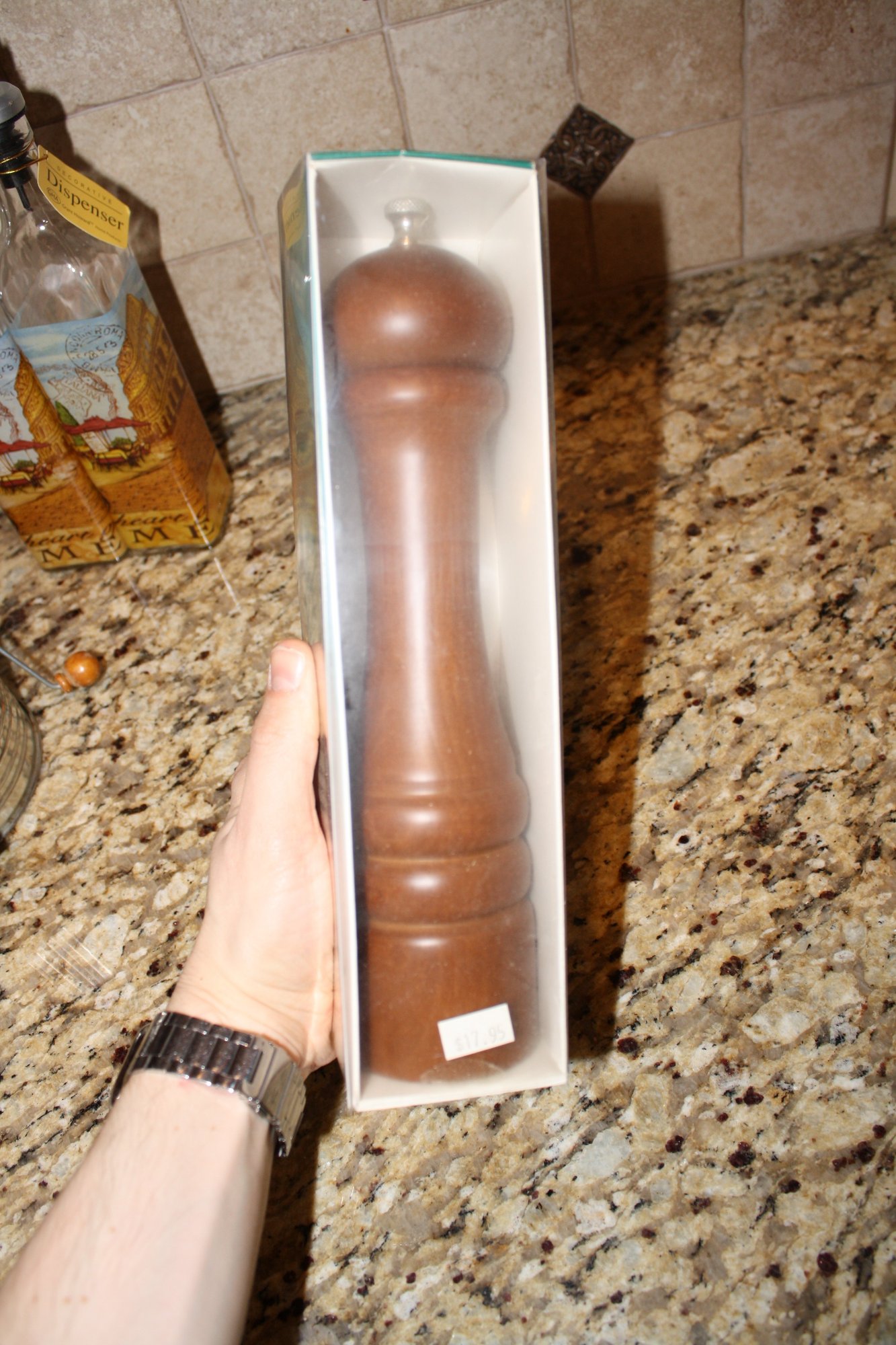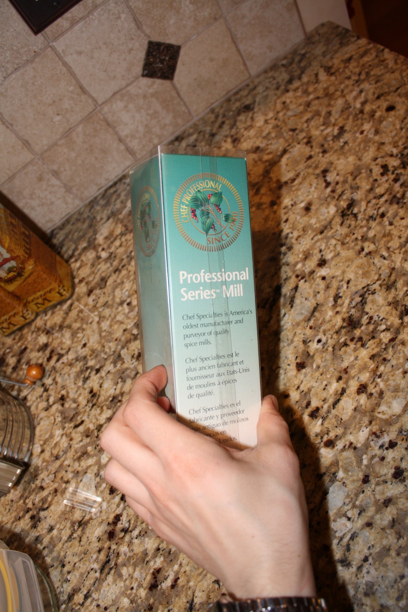 Chef Specialties professional series pepper mill crafted from heavy wood, approximately 9 inches tall with a 60mm diameter, featuring a rust-proof grinding core made from hardened carbon steel or zinc alloy. The mill includes an adjustable top nut for changing grind size from fine to coarse and showcases a durable wood construction with a smooth finish, designed for consistent and precise seasoning of salt, pepper, or spices.