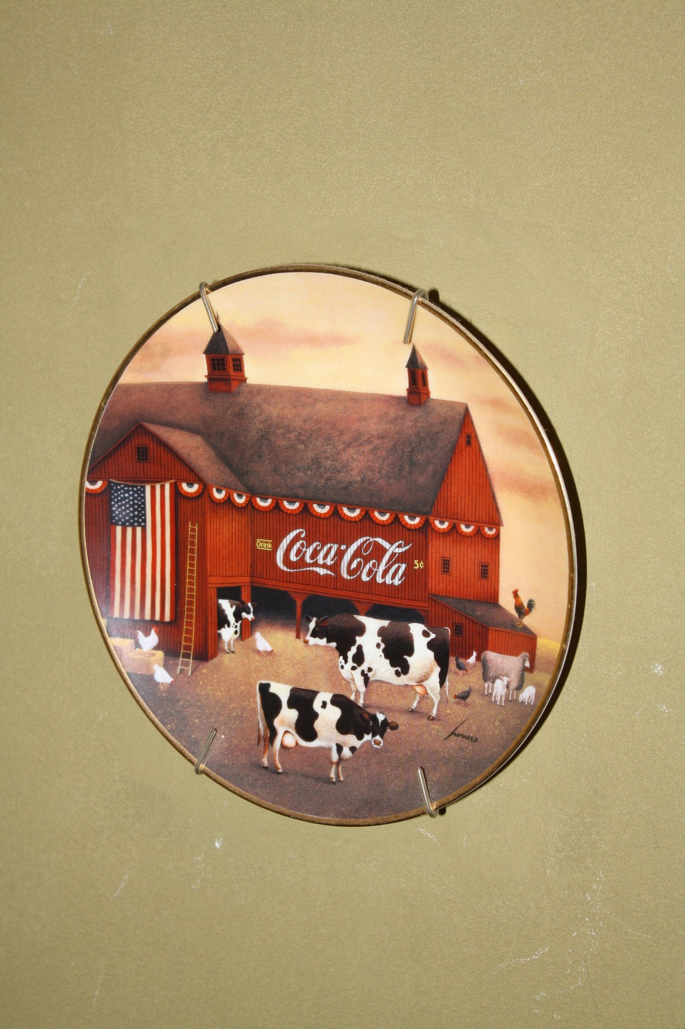 Decorative collectible plate featuring a nostalgic Coca-Cola advertisement painted by Jim Harrison. Depicts a red barn farm scene with cows and an American flag, combining Americana charm with classic Coca-Cola branding. Ideal for display, collecting, or gifting to fans of vintage advertising and Americana artwork.