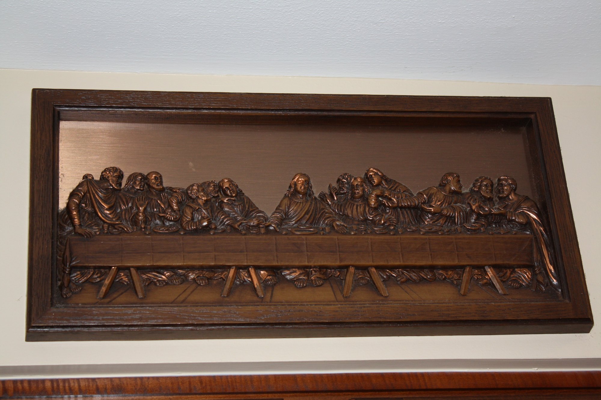A 21-inch copper relief plaque depicting Leonardo da Vinci's "The Last Supper," featuring detailed raised artwork with a textured finish and mounted for display, commonly produced as collectible decorative wall art.