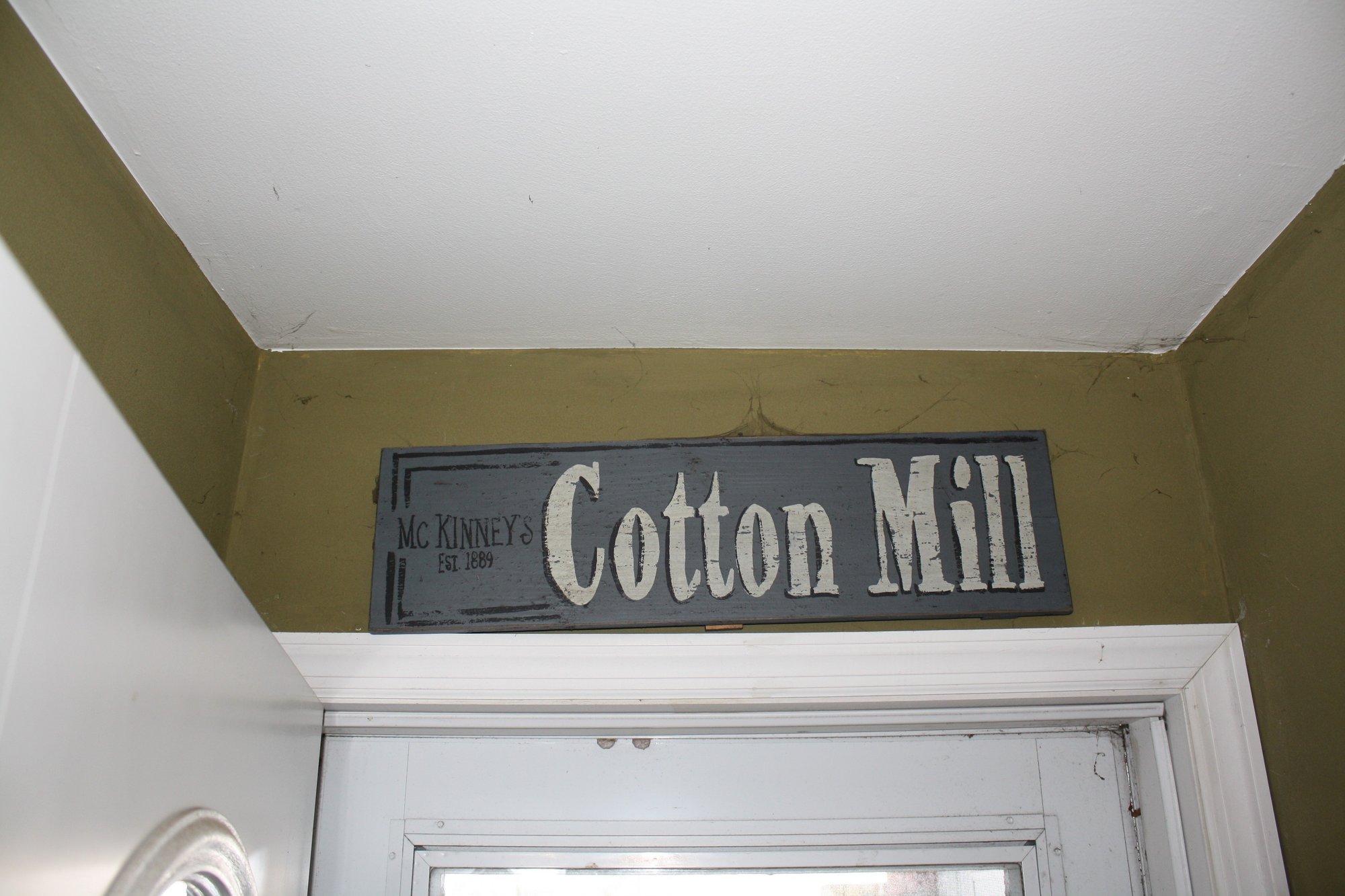 Primitive-style rustic wall sign featuring the text “Cotton Mill” in large stylized font and “McKinney’s Est 1889” in smaller lettering. Designed for farmhouse or vintage-inspired home decor, this sign adds a nostalgic, industrial charm to kitchens, living rooms, or entryways.