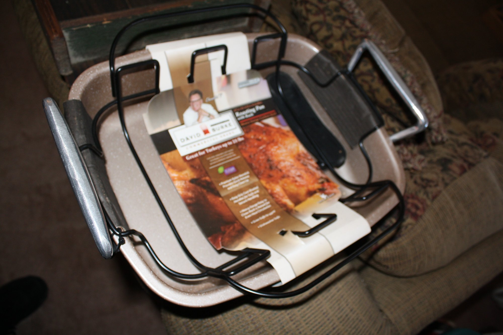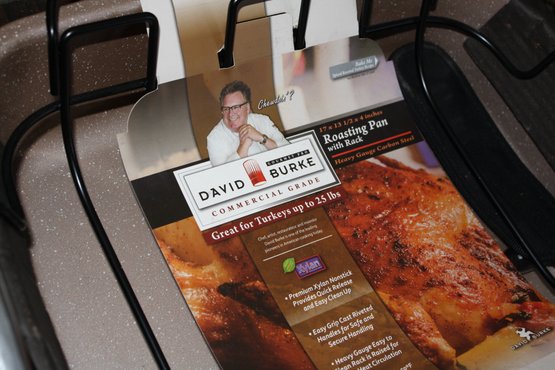 David Burke Gourmet Pro roasting pan crafted from heavy-gauge carbon steel with a premium Xylan nonstick coating. Comes with a removable roasting rack for even cooking and easy handling. Commercial-grade construction designed for roasting meats, poultry, and vegetables with professional results.