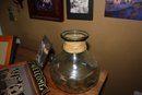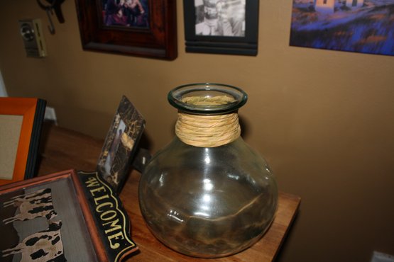 This decorative glass vase features a bulbous base and a slender neck wrapped in natural twine, making it ideal for displaying flowers or serving as a standalone tabletop accent. Perfect for adding a rustic or natural touch to any home décor.