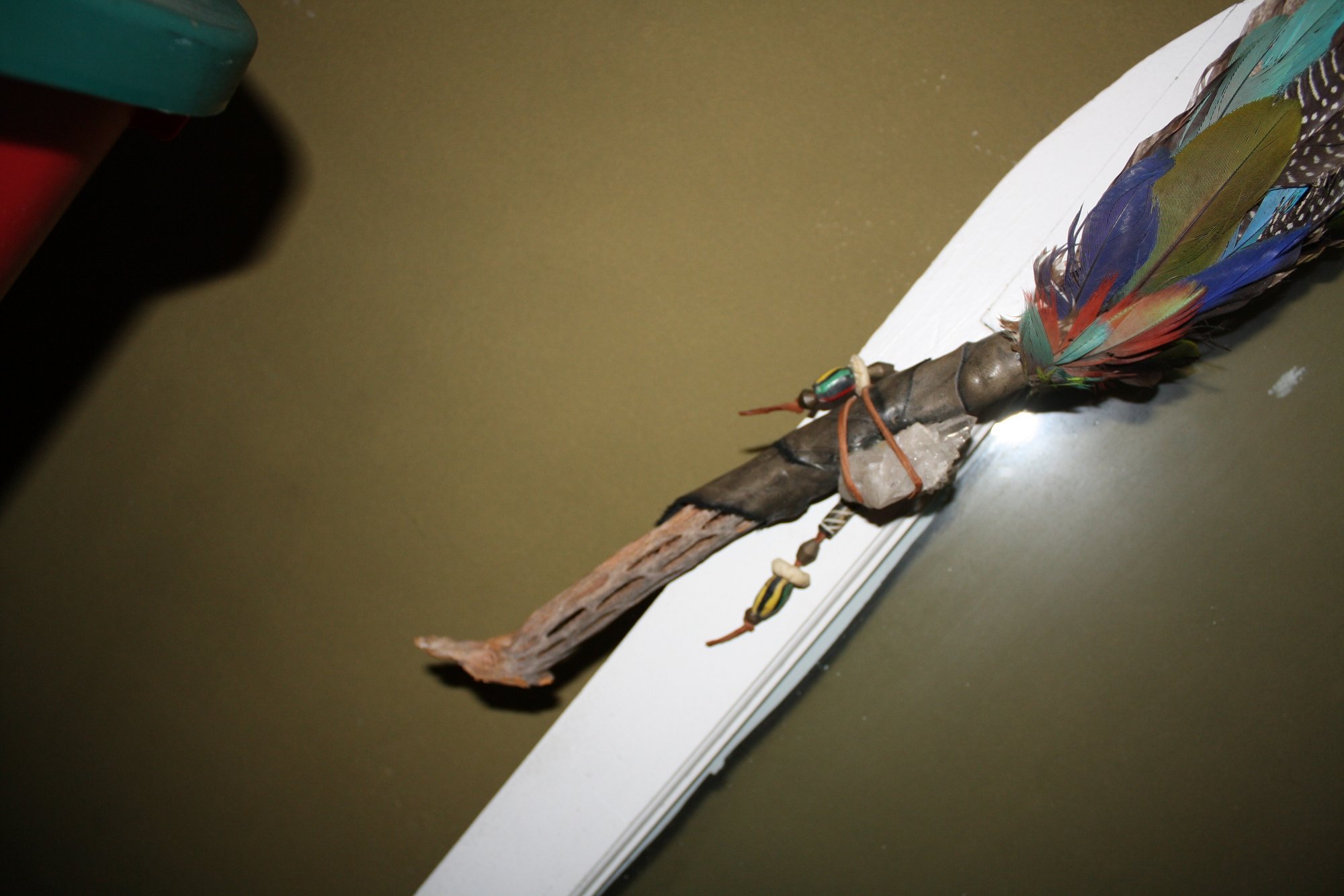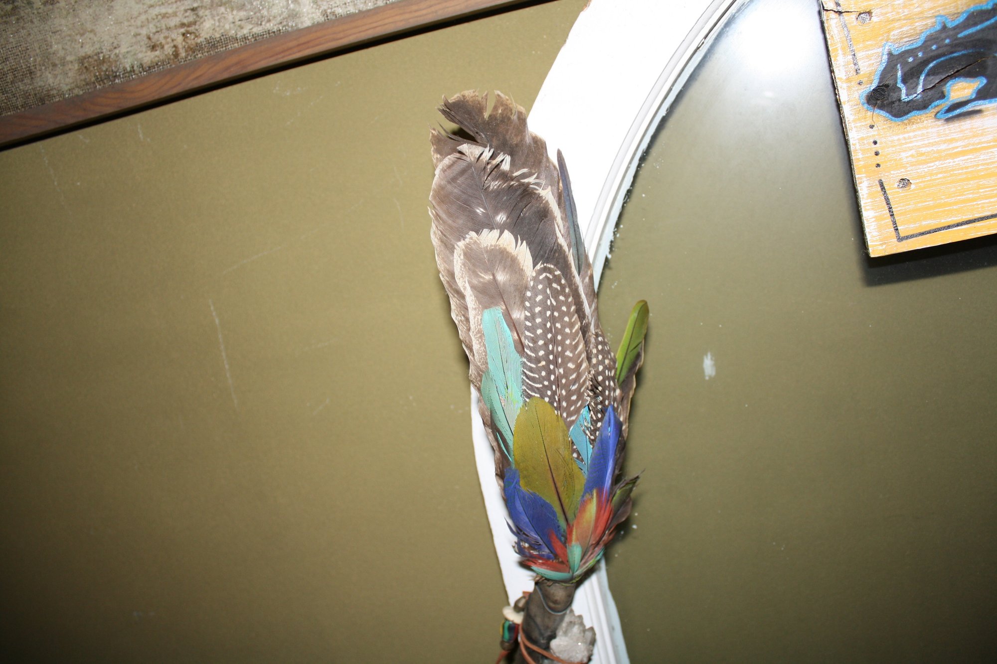 Decorative feather fan traditionally used for smudging and ceremonial practices to direct smoke from sage or other herbs for cleansing and purification. Constructed with assorted feathers attached to a wrapped handle, often embellished with beads or crystals. Symbolically connects the user to nature and represents the air element.