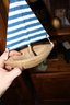 Small decorative wooden sailboat model featuring a carved wooden hull and blue-and-white striped fabric sails. Designed for tabletop or shelf display, ideal for nautical or beach-themed home décor. Measures approximately 4.75 inches tall by 5 inches long, adding a charming coastal accent to any room.