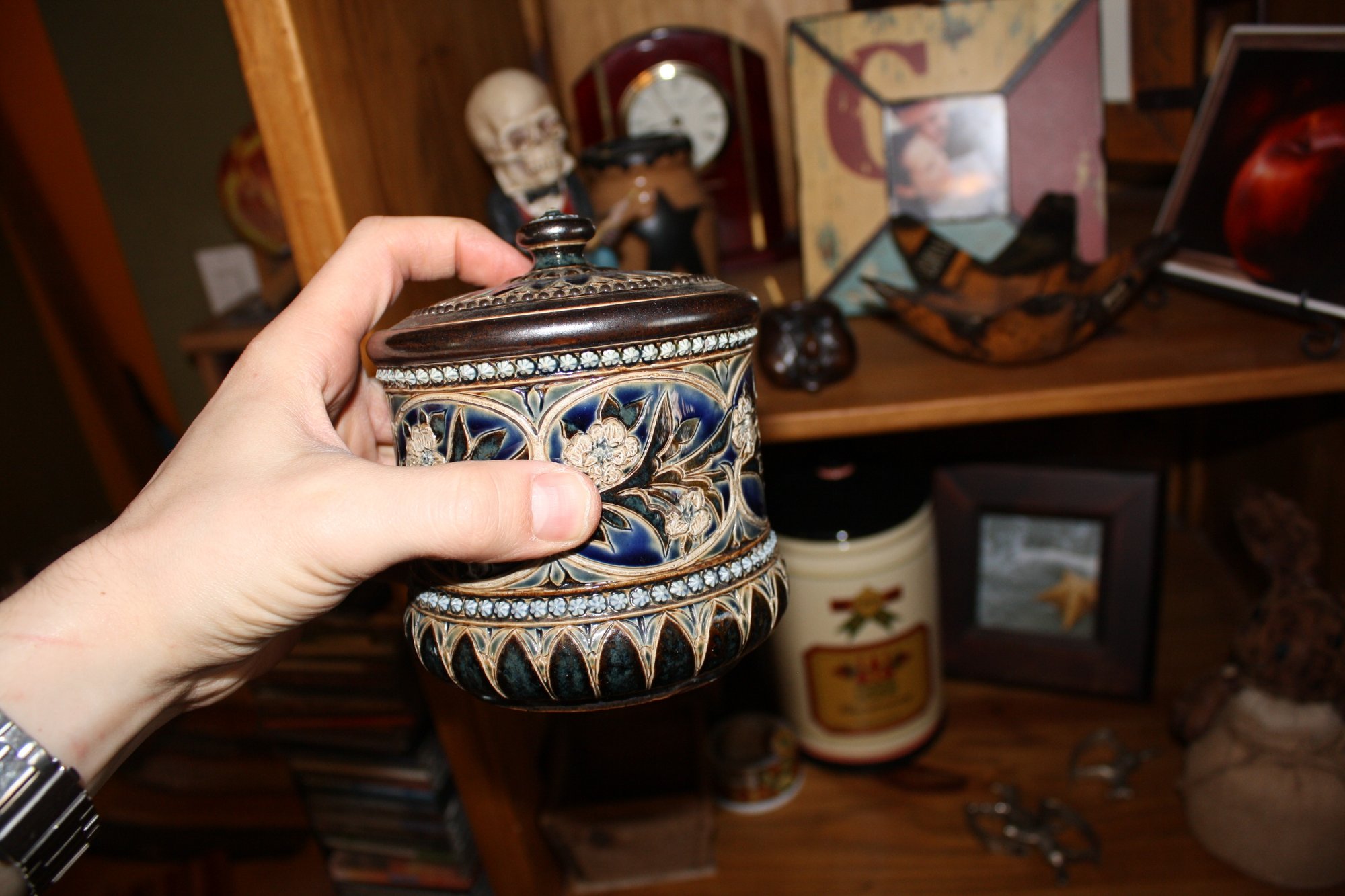 Doulton Lambeth stoneware jar from the late 19th century, featuring typical incised foliage and applied decorative elements. Crafted from durable stoneware, these jars were traditionally used to store tobacco, sugar, or other household items. A collectible example of classic Doulton Lambeth craftsmanship with historical and decorative appeal.