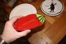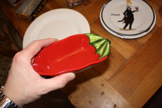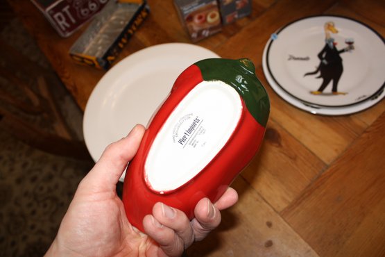 Pier 1 Imports small serving platter or spoon rest shaped like a red chili pepper. Made from durable ironstone ceramic with a hand-painted Southwestern chili pepper motif. Dishwasher and microwave safe (may become hot), ideal for serving condiments, appetizers, or as a whimsical tabletop accent. Collectible and functional novelty kitchenware.