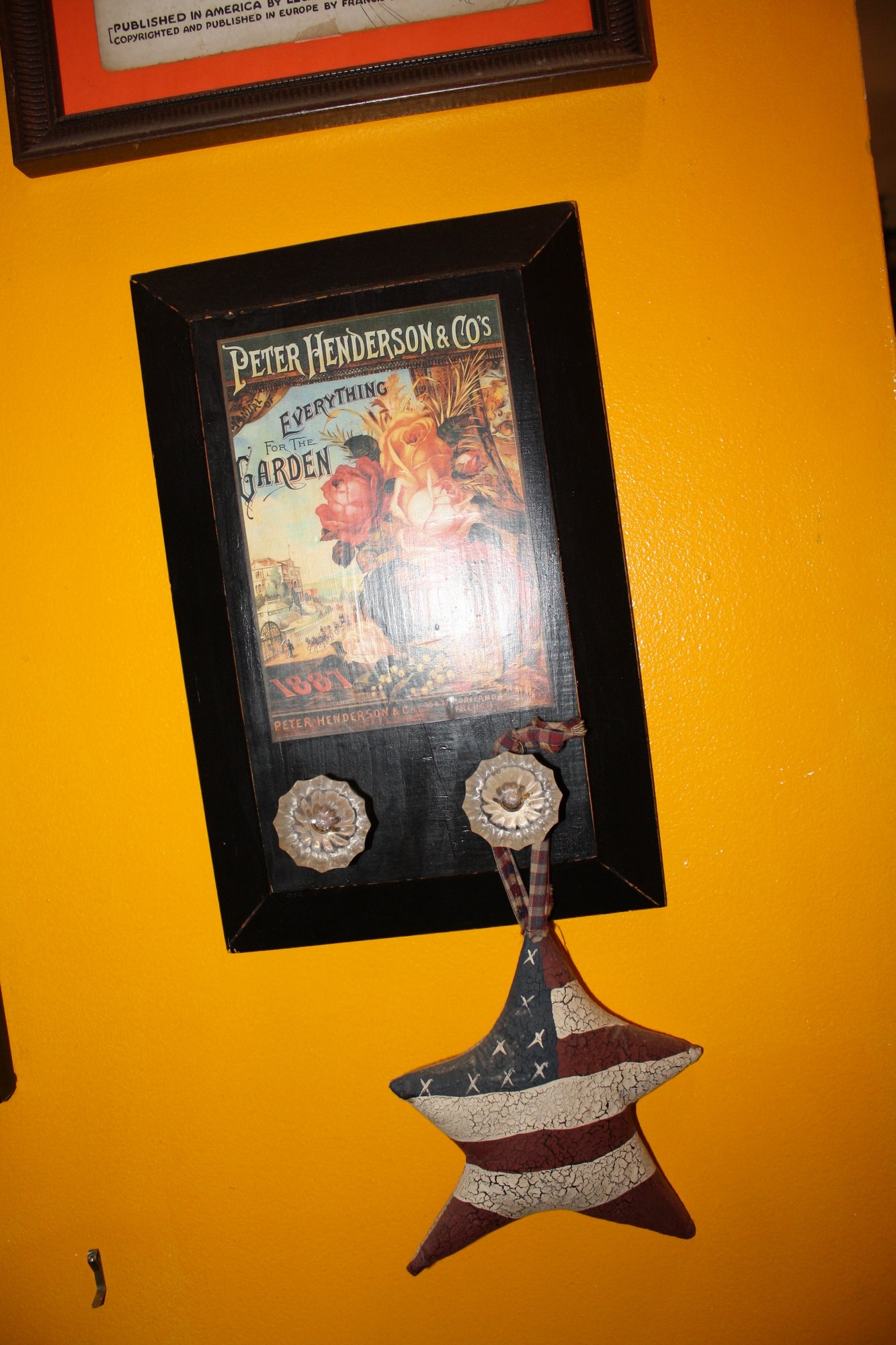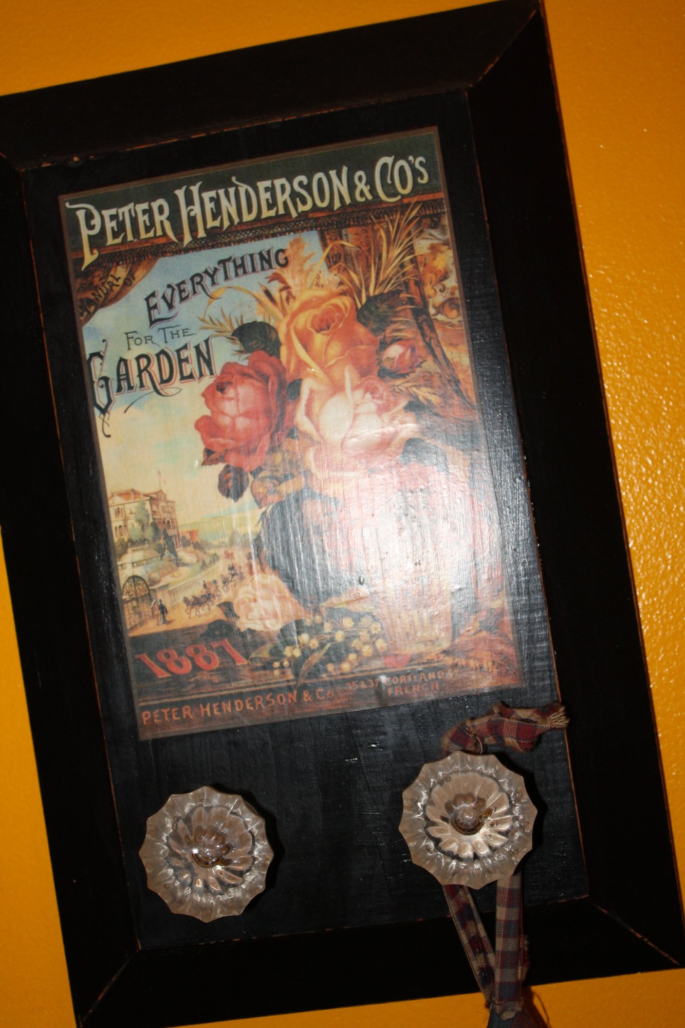 Decorative wall plaque featuring a vintage illustration of a Peter Henderson & Co. seed packet, likely from 1887, framed in dark wood. Includes two metal hooks below for hanging small items. Highlights historical horticulture artwork with classic floral designs, ideal for kitchen, garden room, or farmhouse-style wall decor.